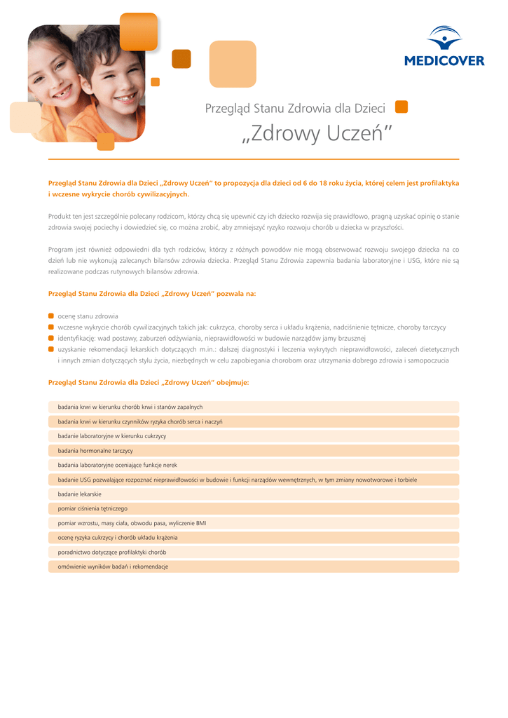 Przegląd Stanu Zdrowia dla Dzieci „Zdrowy Uczeń” Przegląd Stanu Zdrowia dla Dzieci „Zdrowy Uczeń” to propozycja dla dzieci od 6 do 18 roku życia, której celem jest profilaktyka i wczesne wykrycie chorób cywilizacyjnych. Produkt ten jest szczególnie polecany rodzicom, którzy chcą się upewnić czy ich dziecko rozwija się prawidłowo, pragną uzyskać opinię o stanie zdrowia swojej pociechy i dowiedzieć się, co można zrobić, aby zmniejszyć ryzyko rozwoju chorób u dziecka w przyszłości. Program jest również odpowiedni dla tych rodziców, którzy z różnych powodów nie mogą obserwować rozwoju swojego dziecka na co dzień lub nie wykonują zalecanych bilansów zdrowia dziecka. Przegląd Stanu Zdrowia zapewnia badania laboratoryjne i USG, które nie są realizowane podczas rutynowych bilansów zdrowia. Przegląd Stanu Zdrowia dla Dzieci „Zdrowy Uczeń” pozwala na: ocenę stanu zdrowia wczesne wykrycie chorób cywilizacyjnych takich jak: cukrzyca, choroby serca i układu krążenia, nadciśnienie tętnicze, choroby tarczycy identyfikację: wad postawy, zaburzeń odżywiania, nieprawidłowości w budowie narządów jamy brzusznej uzyskanie rekomendacji lekarskich dotyczących m.in.: dalszej diagnostyki i leczenia wykrytych nieprawidłowości, zaleceń dietetycznych i innych zmian dotyczących stylu życia, niezbędnych w celu zapobiegania chorobom oraz utrzymania dobrego zdrowia i samopoczucia Przegląd Stanu Zdrowia dla Dzieci „Zdrowy Uczeń” obejmuje: badania krwi w kierunku chorób krwi i stanów zapalnych badania krwi w kierunku czynników ryzyka chorób serca i naczyń badanie laboratoryjne w kierunku cukrzycy badania hormonalne tarczycy badania laboratoryjne oceniające funkcje nerek badanie USG pozwalające rozpoznać nieprawidłowości w budowie i funkcji narządów wewnętrznych, w tym zmiany nowotworowe i torbiele badanie lekarskie pomiar ciśnienia tętniczego pomiar wzrostu, masy ciała, obwodu pasa, wyliczenie BMI ocenę ryzyka cukrzycy i chorób układu krążenia poradnictwo dotyczące profilaktyki chorób omówienie wyników badań i rekomendacje Przeglądy Stanów Zdrowia – Porównanie Programów Zakres usług Ocena układu krwiotwórczego badania krwi w kierunku chorób krwi i stanów zapalnych badania krwi w kierunku czynników ryzyka chorób serca i naczyń EKG spoczynkowe diagnozujące zaburzenia rytmu i przewodnictwa serca Ocena układu sercowonaczyniowego USG tętnic szyjnych oceniające stopień zwężenia i zagrożenie udarem mózgu test wysiłkowy EKG diagnozujący niedokrwienie serca Echo serca wykrywające wady serca i nieprawidłowości w funkcji mięśnia sercowego tomografia komputerowa naczyn wieńcowych wykrywająca obecność zmian miażdżycowych badanie laboratoryjne w kierunku cukrzycy Ocena metabolizmu badania hormonalne tarczycy badanie USG tarczycy diagnozujące zapalenie, wole i nowotwory gruczołu tarczowego badania krwi oceniające funkcje wątroby Ocena wątroby i funkcji nerek badania laboratoryjne oceniające funkcje nerek badanie mikroalbuminurii w kierunku wczesnego uszkodzenia nerek badanie krwi w kierunku zakażenia wirusami zapalenia wątroby typu B i C Wykrywanie zakażeń bezobjawowych badanie krwi w kierunku zakażenia wirusem HIV badanie krwi w kierunku boreliozy Ocena narządów jamy brzusznej i układu moczowego badanie USG pozwalające rozpoznać nieprawidłowości w budowie i funkcji narządów wewnętrznych, w tym zmiany nowotworowe i torbiele badanie laboratoryjne w kierunku raka jelita grubego konsultacja i badanie ginekologiczne badanie cytologiczne w kierunku wczesnego wykrycia raka szyjki macicy Ocena narządów rozrodczych żeńskich i piersi badanie USG narządów rozrodczych żeńskich w kierunku nieprawidłowości budowy i funkcji oraz nowotworów ocena USG/mammograficzna sutka w kierunku wczesnego wykrywania raka badania laboratoryjne w kierunku predyspozycji do wystąpienia raka sutka, jajnika i szyjki macicy ocena USG gruczołu krokowego przez powłoki brzuszne w kierunku przerostu Ocena narządów rozrodczych męskich badania krwi w kierunku raka gruczołu krokowego badanie USG gruczołu krokowego i jąder w kierunku przerostu i nowotworów Diagnostyka przewlekłych chorób układu oddechowego Ocena całego organizmu spirometria w kierunku wykrycia m.in. astmy, przewlekłej obturacyjnej choroby płuc RTG klatki piersiowej w kierunku stanów zapalnych, nowotworów rezonans magnetyczny całego ciała wykrywający wady rozwojowe, nowotwory, procesy zapalne, zmiany niedokrwienne, degeneracyjne i pourazowe badanie lekarskie pomiar ciśnienia tętniczego Konsultacja internisty lub pediatry lub lekarza medycyny rodzinnej pomiar wzrostu, masy ciała, obwodu pasa, wyliczenie BMI ocena ryzyka cukrzycy i chorób układu krążenia poradnictwo dotyczące profilaktyki chorób omówienie wyników badań i rekomendacje Dbam o Siebie Świadoma Kobieta Świadmomy Mężczyzna Zdrowy Uczeń Moc Zdrowia