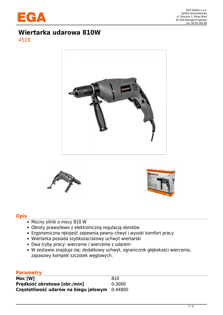 EGA Spółka z o.o. Spółka Komandytowa ul. Rzeczna 1, Nowa Wieś 83-200 Starogard Gdański tel. 58 56 300 80 Wiertarka udarowa 810W 4528 Opis Mocny silnik o mocy 810 W Obroty prawo/lewo z elektroniczną regulacją obrotów Ergonomiczna rękojeść zapewnia pewny chwyt i wysoki komfort pracy Wiertarka posiada szybkozaciskowy uchwyt wiertarski Dwa tryby pracy: wiercenie / wiercenie z udarem W zestawie znajduje się: dodatkowy uchwyt, ogranicznik głębokości wiercenia, zapasowy komplet szczotek węglowych. Parametry Moc [W] 810 Prędkość obrotowa [obr./min] 0-3000 Częstotliwość udarów na biegu jałowym 0-44800 1/2 EGA Spółka z o.o. Spółka Komandytowa ul. Rzeczna 1, Nowa Wieś 83-200 Starogard Gdański tel. 58 56 300 80 Średnica wiercenia 13 Warianty Lp. Nr katalogowy 1 4528 EAN 2/2 Powered by TCPDF (www.tcpdf.org)