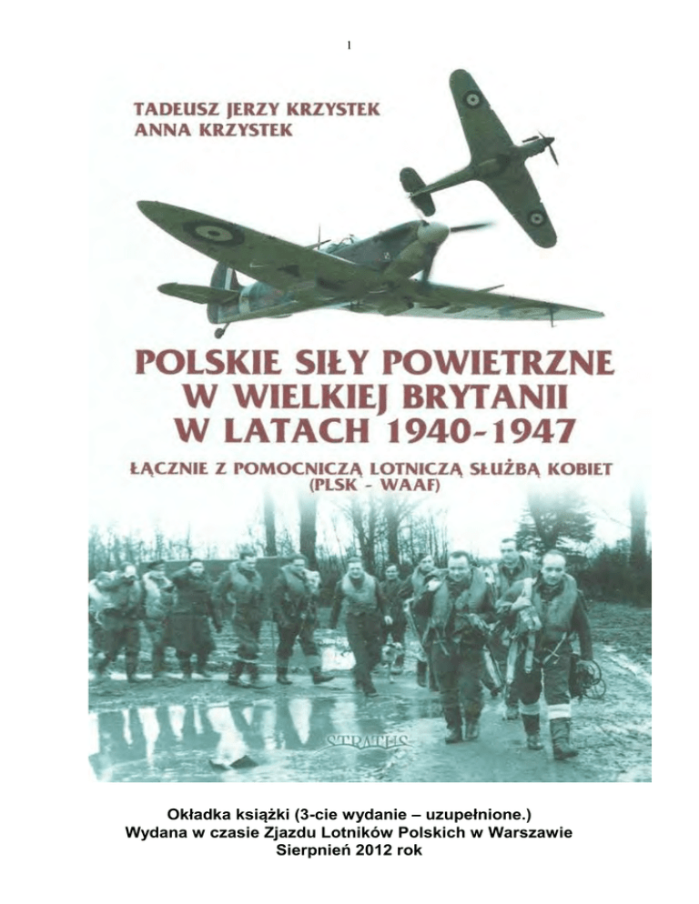 1 Okładka książki (3-cie wydanie – uzupełnione.) Wydana w czasie Zjazdu Lotników Polskich w Warszawie Sierpnień 2012 rok 2 Tadeusz Jerzy Krzystek Anna Józefa Krzystek POLSKIE SIŁY POWIERTRZNE W WIELKIEJ BRYTANII W LATACH 1940 -1947 ŁĄCZNIE Z POMOCNICZĄ LOTNICZĄ SŁUŻBĄ KOBIET (PLSK – WAAF) SPIS OBEJMUJĄCY PERSONEL PSP WSZYSTKICH STOPNI ORAZ SPECJALNOŚCI (CIĄGLE UZUPEŁNIANY) Ostatni zapis dokonano dnia 03.12.2012 © copyright by T.J. Krzystek & A.J. Krzystek ... Niech pamięć powróci do tych, co zapomnieli, a pozostanie na zawsze u tych, co pamiętają! ... Autorzy. ALTAIR - WARSZAWA 2007 – ISBN 83-86217-52-9 COMMANDOR – WARSZAWA 2008 – ISBN 978-83-7473-33-3 STRATUS – SANDOMIERZ 2012 ISBN 978-83-61421-59-7 OBECNA WERSJA JEST KONTYNUACJĄ MANUSCRYPTU. 3 Dowódca Sił Powietrznych - Gen. bryg. pil. Lech Majewski, Wraz z pierwszym lotem bojowym pod niebem niepodległej odradzającej się Polski, zaczęły powstawać różnego rodzaju publikacje dokumentujace te ważne i pełne sukcesów wydarzenia. To dzięki takim autorom jak Pan Tadeusz Krzystek i jego małżonka Anna możemy obcować z tematyką lotniczą, przeżywać i uczestniczyć we spaniałych chwilach, które dzięki lotnikom przynosiły chwałę polskim skrzydłom. Rok 2012 jest dla wszystkich ludzi w stalowych mundurach ważną datą, która skupia w sobie nie tylko historyczne wydarzenia i okrągłe jubileusze, lecz również jest okazją do spotkań lotniczych pokoleń w ramach VI Światowego Zjazdu Lotników Polskich. Dzieło pt.„Polskie Siły Powietrzne na Zachodzie” jest zbiorem unikalnej historii o polskich lotnikach, personelu zabezpieczającym, historią o ludziach, którzy z oddaniem walczyli o wolną niepodległą Polskę. Sukcesy polskich pilotów wojskowych i sportowych towarzyszyły im od momentu powstania lotnictwa wojskowego, polskich konstrukcji i myśli lotniczej. To właśnie lata II wojny światowej były czasem heroicznych zmagań polskich pilotów pod niebem Polski, Francji, Wielkiej Brytanii i Afryki. Dzięki tym wspaniałym zmaganiom 41 polskich pilotów uzyskało zaszczytny tytuł „Asa” potwierdzając tym samym kunszt, doświadczenie i renomę polskiej szkoły pilotażu. Uważam, że ta cenna publikacja, będzie szczególną lekturą dla młodych pokoleń nie tylko lotników, pasjonatów lotnictwa, lecz również wszystkich młodych ludzi, którzy chcieliby poznać historię swoich poprzedników. Jestem także przekonany o unikalności i użyteczności tej książki, która posiada walory zarówno czysto historyczne, jak również stanowi bazę encyklopedyczną dotyczącą tematyki lotniczej. Chciałbym również podkreślić, iż dumny jestem z tego, że znałem osobiście tak znamienitych pilotów, już dziś żywych tylko w pamięci, a mojej w szczególności. Pragnę podziękować autorom książki za ich 14 – letni trud włożony w żmudne poszukiwania i weryfikację materiałów archiwalnych oraz kontaktów z bohaterami tamtych dni. Publikacja ta jest kolejnym cennym dziełem, które nie pozwoli zapomnieć nam i przyszłym pokoleniom o bohaterach i czynach, które miały znaczący wpływ na kształt Państwa Polskiego. 4 Spis treści Przedmowa .......................................................................................................................... O Autorach ................................................................................................................. Requiem Fotografie 6 ................................................................................................................................ – Kamień upamiętniający zrzut AK – Prezentacja książki – Podziękowania ........................................................ 7 8 Polskie Siły Powietrzne (PSP) ............................................................................................. Dowódcy Lotnictwa w latach 1919 - 1948 Polskie Siły Powietrzne na Zachodzie Dywizjony Polskich Sił Powietrznych w Wielkiej Brytanii P.S.P. w Wielkiej Brytanii po zakończeniu II Wojny Światowej Polski Korpus Przysposobieni i Rozmieszczenia (PKPR) 10 Stowarzyszenie Lotników Polskich w Wielkiej Brytanii (SLP) Zakończenie Działalności SLP Fundacja Stowarzyszenia Lotników Polskich Zarząd Fundacji SLP w roku 2010 Statutowe cele Fundacji SLP Zakończenie działalności Fundacji SLP ....................................... 17 Osiągnięcia Stowarzyszenia Lotników Polskich od roku 1947 ....................................... 20 .................................................... 23 Pomocnicza Lotnicza Służba Kobiet (PLSK – WAAF) PLSK po zakończeniu Wojny Przewodniczące PLSK Młodociani Lotnicy ........................ ................................................................................. Lotnicza Szkoła Techniczna dla Małoletnich w Heliopolis (Egipt) Lotnicza Szkoła dla Małoletnich w Halton i Cranwell (UK) 25 Polska Eskadra Łącznikowa w Rosji do dyspozycji gen. W. Andersa 27 Polacy w działaniach Lotnictwa Transportowego RAF – ATA . 5 .......................... ........................................ 29 Objaśnienia ................................................................................................................... Stopnie Wojskowe Skróty używane, Polskich i Brytyjskich Odznaczeń Wojskowych Określenia Lotów Bojowych używana w czasie wojny w RAF’ie Bibliografia 30 Oficerskie numery ewidencyjne RAF’u (nowe / poprzednie) 33 ...................................... Załączniki: .......................................................................................................................... .. No 1. - Liczba Personelu PSP i PLSK No.2 – Straty Personelu PSP w latach 1940 – 1945 No.3 – Lotnicy innych narodowości w PSP No.4 .– Cmentarze grobów lotników polskich poległych w latach 1940 – 1945 37 Lista 49 nazwisk lotników polskich w „Pakistan A.F.” .................................................