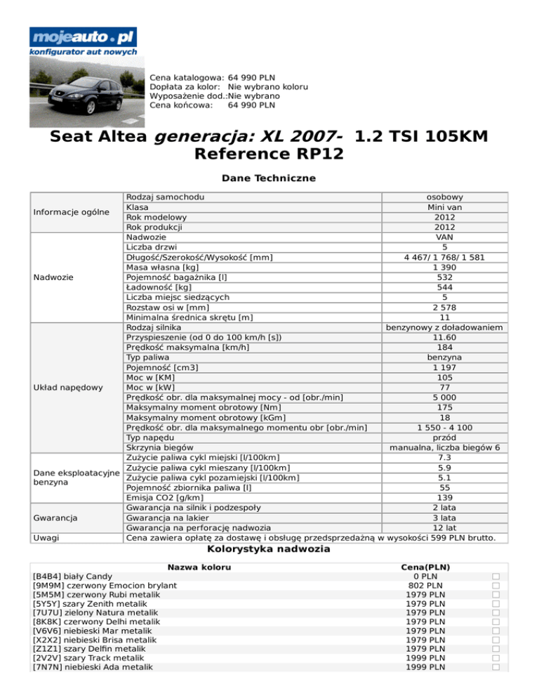 Cena katalogowa: 64 990 PLN Dopłata za kolor: Nie wybrano koloru Wyposażenie dod.:Nie wybrano Cena końcowa: 64 990 PLN Seat Altea generacja: XL 2007- 1.2 TSI 105KM Reference RP12 Dane Techniczne Rodzaj samochodu osobowy Klasa Mini van Informacje ogólne Rok modelowy 2012 Rok produkcji 2012 Nadwozie VAN Liczba drzwi 5 Długość/Szerokość/Wysokość [mm] 4 467/ 1 768/ 1 581 Masa własna [kg] 1 390 Nadwozie Pojemność bagażnika [l] 532 Ładowność [kg] 544 Liczba miejsc siedzących 5 Rozstaw osi w [mm] 2 578 Minimalna średnica skrętu [m] 11 Rodzaj silnika benzynowy z doładowaniem Przyspieszenie (od 0 do 100 km/h [s]) 11.60 Prędkość maksymalna [km/h] 184 Typ paliwa benzyna Pojemność [cm3] 1 197 Moc w [KM] 105 Układ napędowy Moc w [kW] 77 Prędkość obr. dla maksymalnej mocy - od [obr./min] 5 000 Maksymalny moment obrotowy [Nm] 175 Maksymalny moment obrotowy [kGm] 18 Prędkość obr. dla maksymalnego momentu obr [obr./min] 1 550 - 4 100 Typ napędu przód Skrzynia biegów manualna, liczba biegów 6 Zużycie paliwa cykl miejski [l/100km] 7.3 Zużycie paliwa cykl mieszany [l/100km] 5.9 Dane eksploatacyjne Zużycie paliwa cykl pozamiejski [l/100km] 5.1 benzyna Pojemność zbiornika paliwa [l] 55 Emisja CO2 [g/km] 139 Gwarancja na silnik i podzespoły 2 lata Gwarancja Gwarancja na lakier 3 lata Gwarancja na perforację nadwozia 12 lat Uwagi Cena zawiera opłatę za dostawę i obsługę przedsprzedażną w wysokości 599 PLN brutto. Kolorystyka nadwozia Nazwa koloru [B4B4] biały Candy [9M9M] czerwony Emocion brylant [5M5M] czerwony Rubi metalik [5Y5Y] szary Zenith metalik [7U7U] zielony Natura metalik [8K8K] czerwony Delhi metalik [V6V6] niebieski Mar metalik [X2X2] niebieski Brisa metalik [Z1Z1] szary Delfin metalik [2V2V] szary Track metalik [7N7N] niebieski Ada metalik Cena(PLN) 0 PLN 802 PLN 1979 PLN 1979 PLN 1979 PLN 1979 PLN 1979 PLN 1979 PLN 1979 PLN 1999 PLN 1999 PLN [K4K4] szary Luna metalik [Z4Z4] czarny Magico metalik 1999 PLN 1999 PLN Wyposażenie standardowe Nazwa elementu 15" obręcze kół stalowe 3 punktowe pasy bezpieczeństwa dla 5 miejsc 4 składane uchwyty we wnętrzu (nad drzwiami) 6 poduszek powietrznych (poduszka powietrzna kierowcy, poduszka powietrzna pasażera, boczne poduszki powietrzne, kurtyny powietrzne, dezaktywacja poduszki powietrznej pasażera) ABS antena dachowa z zabezpieczeniem przeciw kradzieżowym chromowana ramka na przednim grillu chromowane bimetalowe elementy regulacji wylotów powietrza chromowane bimetalowe elementy regulacji wylotów powietrza czarne klamki drzwi czarne relingi dachowe dojazdowe koło zapasowe drążek zmiany biegów z tworzywa dwa gniazdka 12V umieszczone w przedniej i tylnej części konsoli centralnej dwupoziomowy schowek w centralnej konsoli środkowej dynamic steering response elastyczna roleta bagażnika elektromechaniczne wspomaganie układu kierowniczego elektryczna regulacja wysokości świateł elektrycznie regulowane lusterka zewnętrzne felgi stalowe 16" z nowym wzornictwem osłon kół fotel kierowcy z regulacją wysokości kieszeń w oparciu fotela kierowcy klimatyzacja półautomatyczna "Climatic" komputer pokładowy, wskaźnik temperatury zewnętrznej mata wygłuszająca w centralnej konsoli możliwość zdalnego otwierania zamka bagażnika (dodatkowy przycisk w kluczyku) nowa klapa bagażnika wraz z tylnymi światłami nowe lusterka zewnętrzne nowe przednie i tylne zderzaki w kolorze nadwozia osłona przeciwsłoneczna kierowcy i pasażera z lusterkiem ostrzegawczy sygnał dźwiękowy informujący o włączonych światłach panel wskaźników z nową stylistyką, podświetlany na biało podświetlanie bagażnika podświetlany schowek pasażera podwójna, widoczna końcówka układu wydechowego (nie chromowana) przednie reflektory z systemem dwuogniskowym lamp przednie szyby regulowane elektrycznie z systemem "One Touch" przednie zagłówki z regulacją wysokości i kąta pochylenia przesuwana tylna kanapa przyciemniane szyby radio CD MP3 + 6 głośników regulacja wysokości fotela kierowcy regulacja wysokości przednich pasów bezpieczeństwa z napinaczami i ogranicznikiem obciążenia schowek na okulary nad drzwiami kierownicy oraz 3 składane uchwyty we wnętrzu (nad drzwiami) schowek pod fotelem kierowcy i pasażera siatki zamontowane w bocznej części bagażnika składany kluczyk z trzema przyciskami funkcyjnymi sygnał informujący o niezapięciu pasów bezpieczeństwa system ISOFIX system TCS (z możliwością wyłączenia) system wycieraczek przedniej szyby zintegrowany w przednich słupkach A sztywna półka bagażnika światła do jazdy dziennej tempomat (automatyczna regulacja prędkości) trójramienne koło kierownicy z tworzywa trzy 12V gniazda umieszczone w przedniej i tylnej części konsoli centralnej oraz w bagażniku tylna kanapa dzielona i składana 1/3 - 2/3 tylna kanapa z podłokietnikiem z dwoma uchwytami na kubki tylne oświetlenie wewnętrzne tylne zagłówki z regulacją wysokości tylne zawieszenie wielowahaczowe Multilink uchwyt otwierania bagażnika z logo SEAT uchwyty na kubek w centralnej konsoli wejście AUX-In zamek centralny sterowany pilotem w kluczyku zawieszenie Comfort Wyposażenie dodatkowe Lista wyposażenia dodatkowego [PCO] przyciemniane szyby boczne tylne w 35% [PCR] Pakiet Copa (przednie światła przeciwmgłowe z funkcją doświetlania zakrętów, wielofunkcyjne koło kierownicy, fotel pasażera z regulacją wysokości, przednie fotele z regulacją lędźwiową, złącze USB, klimatyzacja automatyczna Climatronic, specjalny wzór tapicerki) [PJC] 16 aluminiowe koła 205/55 ELIO [PRH] ESP + EBA + DSR + Hilla Holder + TMPS z sygnałem akustycznym [PSO] system Start&Stop z systemem odzyskiwania energii [PW5] Pakiet zimowy (podgrzewane przednie siedzenia, spryskiwacze przednich reflektorów, podgrzewane dysze spryskiwaczy) [RB5] Bluetooth + MP3 + DOT Matrix + wielofunkcyjne koło kierownicy + 8 głośników [RC4] Cup (złącze USB i Aux-in) [WPS] Pakiet Lif