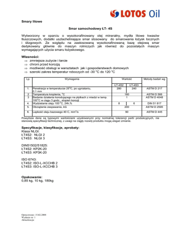 Smary litowe Smar samochodowy ŁT- 4S Wytworzony w oparciu o wysokorafinowany olej mineralny, mydła litowe kwasów tłuszczowych, dodatki uszlachetniające smar stosowany do smarowania łożysk tocznych i ślizgowych. Ze względu na zastosowaną wysokorafinowaną bazę olejową smar dedykowany głównie do maszyn rolniczych jak również do pozostałych maszyn wymagających użycia smaru łożyskowego. Własności: zmniejsza zużycie i tarcie chroni przed korozją możliwość obsługi w warsztatach jak i gospodarstwach domowych szeroki zakres temperatur roboczych od -30 oC do 120 oC Lp. 1. o 4. 5. Penetracja w temperaturze 25 C, po ugniataniu, 0.1 mm o Temperatura kroplenia, C Badanie działania korodującego na płytkach z miedzi w temp. o 100 C w ciągu 3 godz., stopień korozji o Wydzielanie oleju 100 C, 24h,% Obciążenie zespawania, kG 6. Lepkość oleju bazowego 40 C, mm /s 2 3 Wartość Wymagania 2 ŁT-4S2 280 Metody badań wg ŁT-4S3 240 180 1 8 ASTM D 217 ASTM D 566 ASTM D 4048 200 6 DIN 51 817 ASTM D 2595 90 ASTM D 445 Powyższe dane są typowymi wartościami uzyskiwanymi przy normalnej tolerancji partii produkcyjnych, nie stanowią specyfikacji technicznej, z uwagi na ciągły rozwój produktu mogą ulegać zmianie. Specyfikacje, klasyfikacje, aprobaty: Klasa NLGI: ŁT4S2: NLGI 2 ŁT4S3: NLGI 3 DIN51502/51825: ŁT4S2: KP2K-20 ŁT4S3: KP3K-20 ISO 6743: ŁT4S2: ISO-L-XCCHB 2 ŁT4S3: ISO-L-XCCHB 3 Opakowanie: 0,85 kg, 10 kg, 180kg Opracowano: 15.02.2008 Wydanie nr: 1 Aktualizacja: Postępowanie ze smarem: Smar nie zawiera składników niebezpiecznych stwarzających bezpośrednie zagrożenie dla zdrowia organizmów żywych i środowiska. Składowanie: Opakowania z produktem winny być trzymane pod dachem w pomieszczeniach zamkniętych lub jeśli nie jest to możliwe przykryte. Produktu nie należy przechowywać w warunkach temperatur wyższych niż 60C, wystawionych na działanie promieni słonecznych lub na bardzo niskie temperatury. Zdrowie, bhp, środowisko: Informacje o produkcie dotyczące zdrowia, bhp, i wpływu na środowisko są zawarte w Karcie Bezpieczeństwa. W dokumencie tym podano szczegóły dotyczące ewentualnych zagrożeń, przestrogi i środki pierwszej pomocy wraz z omówieniem wpływu na środowisko i sposobem utylizacji produktu zużytego. LOTOS Oil S.A. nie ponosi żadnej odpowiedzialności za wykorzystywanie produktu niezgodne z przeznaczeniem lub z innymi niż podano środkami ostrożności. Opracowano: 15.02.2008 Wydanie nr: 1 Aktualizacja: