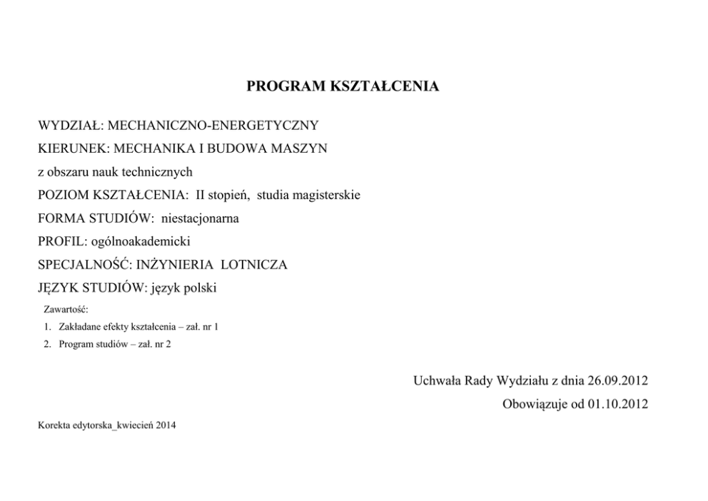 PROGRAM KSZTAŁCENIA WYDZIAŁ: MECHANICZNO-ENERGETYCZNY KIERUNEK: MECHANIKA I BUDOWA MASZYN z obszaru nauk technicznych POZIOM KSZTAŁCENIA: II stopień, studia magisterskie FORMA STUDIÓW: niestacjonarna PROFIL: ogólnoakademicki SPECJALNOŚĆ: INŻYNIERIA LOTNICZA JĘZYK STUDIÓW: język polski Zawartość: 1. Zakładane efekty kształcenia – zał. nr 1 2. Program studiów – zał. nr 2 Uchwała Rady Wydziału z dnia 26.09.2012 Obowiązuje od 01.10.2012 Korekta edytorska_kwiecień 2014 Zał. nr 2 do Programu kształcenia PROGRAM STUDIÓW 1. Opis Liczba semestrów: 4 Liczba punktów ECTS konieczna do uzyskania kwalifikacji: 90 Wymagania wstępne (w szczególności w przypadku studiów II stopnia): kwalifikacje I stopnia oraz kompetencje inżynierskie do kontynuowania kształcenia na studiach II stopnia: wiedza z zakresu matematyki, fizyki i chemii, umożliwiająca zrozumienie podstaw mechaniki, materiałoznawstwa i zasad konstrukcji maszyn, wiedza z zakresu mechaniki, wytrzymałości materiałów oraz podstaw konstrukcji maszyn, umożliwiająca zrozumienie i projektowanie podstawowych elementów maszyn, umiejętność wykorzystania do formułowania i rozwiązywania zadań inżynierskich metod analitycznych, symulacyjnych i eksperymentalnych, wiedza z zakresu przepływu płynów z uwzględnieniem wszystkich procesów cieplnych, wiedza na temat zapisu konstrukcji z wykorzystaniem CAD 2D i 3D, umiejętność komunikacji w języku angielskim oraz prezentacji i dokumentacji wyników eksperymentu oraz prezentacji i dokumentacji wyników zadania o charakterze projektowym. Po ukończeniu studiów absolwent uzyskuje tytuł zawodowy: magister inżynier Możliwość kontynuacji studiów: studia III stopnia doktoranckie. Sylwetka absolwenta, możliwości zatrudnienia: Absolwent posiada wiedzę i umiejętności w zakresie: mechaniki, projektowania, wytwarzania i eksploatacji maszyn i systemów wytwórczych oraz technologii proekologicznych i bezpieczeństwa technicznego. Jest przygotowany do: twórczego wykorzystania metod i technologii informatycznych wspomagających projektowanie, wytwarzanie i eksploatację maszyn oraz dobór materiałów inżynierskich; kwalifikacje II stopnia. 1 kierowania i rozwijania produkcji w przedsiębiorstwach przemysłowych oraz zarządzania procesami technologicznymi; prowadzenia badań w instytutach naukowo-badawczych; zarządzania pracowniami projektowymi z zakresu konstrukcji maszyn i procesów technologicznych; prowadzenia działalności gospodarczej. Posiada niezbędną wiedzę i umiejętności w zakresie projektowania, badania i eksploatacji statków powietrznych ze szczególnym uwzględnieniem planowania, organizacji i kontroli procesu obsługi statków powietrznych, ich napraw oraz remontów. Zna język obcy na poziomie biegłości B2+ oraz drugi język obcy na poziomie A1 lub A2. Wskazanie związku z misją Uczelni i strategią jej rozwoju: Program kształcenia zgodny jest z misją uczelni w zakresie przekazywania wiedzy i umiejętności z zachowaniem wysokiej jakości kształcenia oraz kształtowanie twórczych, krytycznych i tolerancyjnych osobowości studentów, poprzez rozwijanie i pielęgnowanie silnego poczucia wspólnoty akademickiej opartej na łączności intelektualnej i społecznej studentów i pracowników. 2. Dziedziny nauki i dyscypliny naukowe, do których odnoszą się efekty kształcenia: nauki techniczne 3. Zwięzła analiza zgodności zakładanych efektów kształcenia z potrzebami rynku pracy: Zakładane efekty kształcenia zapewniają przyrost kompetencji inżynierskich uzyskanych na I stopniu kształcenia, głównie w zakresie wiedzy i umiejętności, ze szczególnym uwzględnieniem kreatywności w rozwiązywaniu określonych problemów technicznych. Program kształcenia wyposaża więc absolwenta w atrybuty umożliwiające mu dostosowanie się do dynamicznie zmieniających się wymagań rynku pracy. 2 4. Lista modułów kształcenia: 4.1. Lista modułów obowiązkowych: 4.1.1. Lista modułów kierunkowych 4.1.1.1 Moduł Przedmioty obowiązkowe kierunkowe l p s 1,07 Mechatronika i systemy sterowania ć zajęć BK1 Sposób3 zaliczenia 3 1,5 T E 60 2 1,5 T Z 16 30 1 0,5 T Z K2MBM_U02 16 30 1 0,75 T Z K2MBM_U06 8 30 1 0,75 T Z 24 60 2 1 T 16 60 2 1 T ZZU CNPS łączna K2MBM_W01 16 90 K2MBM_U01 K2MBM_K02 K2MBM_K03 K2MBM_K04 16 K2MBM_W02 2 MNN0590 Mechatronika i systemy sterowania 3 MNN1382 Współczesne materiały inżynierskie 4 MNN1382 Współczesne materiały inżynierskie 5 MNN1363 Współczesne materiały inżynierskie 6 MNN0532 Mechanika analityczna K2MBM_W03 7 MNN0672 Modelowanie i optymalizacja K2MBM_W04 0,53 1,07 1,07 Liczba pkt. ECTS Forma2 kursu/ grupy kursów 1,6 MNN0590 w Liczba godzin Symbol kierunk. efektu kształcenia 1,07 1 Nazwa kursu/grupy kursów (grupę kursów oznaczyć symbolem GK) Tygodniowa liczba godzin 1,07 L.p. Kod kursu/ grupy kursów – liczba punktów ECTS przypisanych godzinom zajęć wymagających bezpośredniego kontaktu nauczycieli i studentów – T, zdalna – Z 3Egzamin – E, zaliczenie na ocenę – Z. W grupie kursów po literze E lub Z w nawiasie wpisać formę kursu końcowego (w, c, l, s, p) 4Kurs/ grupa kursów Ogólnouczelniany – O 5Kurs/ grupa kursów Praktyczny – P. W grupie kursów w nawiasie wpisać liczbę punktów ECTS dla kursów o charakterze praktycznym 6KO - kształcenia ogólnego, PD – podstawowy, K – kierunkowy, S – specjalnościowy 7W - wybieralny, Ob – obowiązkowy 1BK 2Tradycyjna Kurs/grupa kursów ogólno -uczelniany4 o charakt. praktycznym5 rodzaj6 typ7 K Ob K Ob K Ob P K Ob P K Ob Z K Ob E K Ob P 3 1,6 1,07 Modelowanie i optymalizacja Seminarium dyplomowe 10 MNN0032 Analiza awaryjności maszyn energetycznych 11 MNN0032 Analiza awaryjności maszyn energetycznych 12 MNN1437 Zintegrowane systemy wytwarzania 12 MNN1437 Zintegrowane systemy wytwarzania 0,53 MNN1520 Razem K2MBM_U03 24 90 3 2,25 T Z P K Ob K2MBM_U07 K2MBM_K01 K2MBM_K03 K2MBM_K04 K2MBM_K05 16 60 2 1,5 T Z