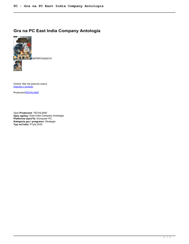 PC : Gra na PC East India Company Antologia Gra na PC East India Company Antologia GMTEPCAG0210 Ocena: Nie ma jeszcze oceny Zapytaj o produkt ProducentTECHLAND Opis Producent: TECHLAND Opis ogólny: East India Company Antologia Platforma (sprz?t): Komputer PC Kategoria gry / programu: Strategia Typ no?nika: P?yta DVD 1 / 1 Powered by TCPDF (www.tcpdf.org)