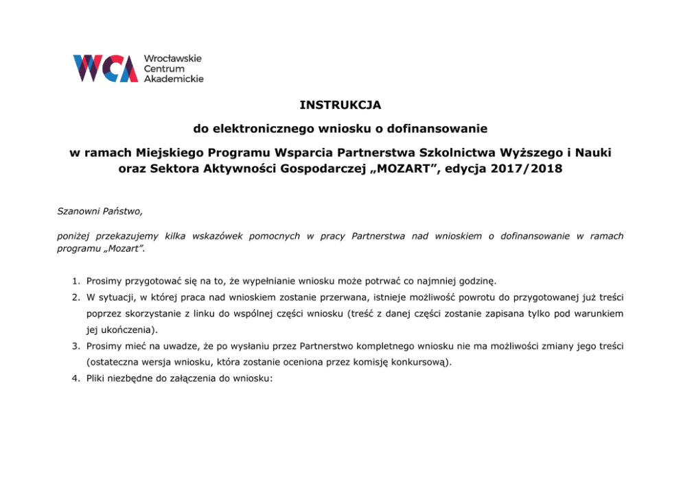 INSTRUKCJA do elektronicznego wniosku o dofinansowanie w ramach Miejskiego Programu Wsparcia Partnerstwa Szkolnictwa Wyższego i Nauki oraz Sektora Aktywności Gospodarczej „MOZART”, edycja 2017/2018 Szanowni Państwo, poniżej przekazujemy kilka wskazówek pomocnych w pracy Partnerstwa nad wnioskiem o dofinansowanie w ramach programu „Mozart”. 1. Prosimy przygotować się na to, że wypełnianie wniosku może potrwać co najmniej godzinę. 2. W sytuacji, w której praca nad wnioskiem zostanie przerwana, istnieje możliwość powrotu do przygotowanej już treści poprzez skorzystanie z linku do wspólnej części wniosku (treść z danej części zostanie zapisana tylko pod warunkiem jej ukończenia). 3. Prosimy mieć na uwadze, że po wysłaniu przez Partnerstwo kompletnego wniosku nie ma możliwości zmiany jego treści (ostateczna wersja wniosku, która zostanie oceniona przez komisję konkursową). 4. Pliki niezbędne do załączenia do wniosku: Naukowiec: a) lista publikacji naukowych; b) zaświadczenie o zatrudnieniu na uczelni/w instytucie. Przedsiębiorca: a) b) c) d) formularz informacji przedstawianych przy ubieganiu się o pomoc de minimis; oświadczenie o uzyskanej pomocy de minimis; oświadczenie Przedsiębiorcy o spełnieniu warunków określonych w uchwale; dokument potwierdzający formę prawną istnienia firmy – aktualny wyciąg z Centralnej Ewidencji i Informacji Działalności Gospodarczej/Krajowego Rejestru Sądowego Opcjonalnie: e) upoważnienie, na mocy którego działa osoba reprezentująca przedsiębiorcę, o ile umocowanie do reprezentacji nie wynika z treści dokumentów dostępnych w KRS/CEIDG; f) upoważnienie dla Gminy Wrocław do występowania do biur informacji gospodarczej o ujawnienie informacji gospodarczych (dotyczy przedsiębiorców – osób fizycznych prowadzących działalność gospodarczą); g) oświadczenie Przedsiębiorcy o współfinansowaniu wynagrodzenia naukowca (dotyczy przedsiębiorców, którzy wzięli udział we wcześniejszych edycjach Programu, z wyłączeniem edycji 2012/2013, i w partnerstwie z naukowcem zrealizowali projekt z tą samą kategorią transferu wiedzy, co projekt zgłoszony w edycji 2017/2018). 5. Program: W etapach programu należy uwzględnić działania, które będą wykonywane podczas realizacji projektu. Łączna suma wszystkich miesięcy winna wynosić 12 miesięcy. Nie ma ograniczenia co do liczby etapów, minimalny okres trwania danego etapu to 1 miesiąc, a maksymalny 4 miesiące. 6. Wszystkie numery: telefonu, NIP, REGON itp. należy wpisywać bez myślników. strona 2 z 23 7. Osoba do kontaktu we wniosku po stronie Przedsiębiorstwa to osoba, z którą będzie można wyjaśnić wątpliwości co do treści wniosku. 8. W sytuacji, kiedy część wspólna (B i C) została uzupełniona przez jedną ze stron, druga przy uzupełnianiu swoich danych będzie miała do niej wgląd oraz możliwość edycji. 9. Uzupełnianie wniosku: Strona rozpoczęcia wypełniania wniosku: strona 3 z 23 Część A – Naukowiec strona 4 z 23 strona 5 z 23 strona 6 z 23 strona 7 z 23 Część A – Przedsiębiorca Jeśli Przedsiębiorcę reprezentuje osoba działająca na mocy innych dokumentów aniżeli z bazy CEiDG czy KRS, to w powyższym polu należy wskazać dane właśnie tej osoby. strona 8 z 23 strona 9 z 23 W przypadku osób fizycznych prowadzących działalnośd gospodarczą na koocu części A pojawi się jeszcze formularz zgody na przetwarzanie danych osobowych! strona 10 z 23 Po uzupełnieniu części A wniosku – otrzymacie Państwo dwa emaile: a) jeden z linkiem, dzięki któremu otrzymacie Państwo dostęp do części wspólnej wniosku i tym samym możliwość jego edycji: b) drugi z linkiem, który należy przekazać drugiej stronie Partnerstwa w celu uzupełnienia danych i możliwości wglądu do części wspólnej wniosku z opcją jej edycji: strona 11 z 23 W sytuacji, w której praca nad wnioskiem zostanie przerwana, mają Państwo możliwość powrotu do przygotowanej już treści poprzez skorzystanie z linku do wspólnej części wniosku (treść z danej części zostanie zapisana tylko pod warunkiem jej ukończenia). Gdy korzysta się z linku drugiego dla partnera po kliknięciu „Zapisz i przejdź do części B” może pojawić się komunikat poniżej, w takim przypadku prosimy o cofnięcie się strzałką w przeglądarce i odczekać chwilę. Uwaga! Kolejne części B i C są częścią wspólną dla obu stron Partnerstwa. Cześć D zawiera tę samą treść dla Naukowca i Przedsiębiorcy, ale strony uzupełniają ją osobno. strona 12 z 23 Część B wniosku - przedstawia merytoryczny zakres i planowany sposób realizacji projektu Partnerstwa. Należy także podać inne informacje opisujące wymierne korzyści we współpracy ze sferą szkolnictwa wyższego i nauki ze szczególnym uwzględnieniem wsparcia wrocławskiego rynku pracy. strona 13 z 23 Ilość etapów dowolna, minimalny okres trwania danego etapu to 1 miesiąc, a maksymalny 4 miesiące. strona 14 z 23 strona 15 z 23 strona 16 z 23 Część C wniosku - dotyczy przede wszystkim wartości dodanej Partnerstwa, związanej z tym, co wynika z realizacji projektu Partnerstwa dla środowiska macierzystego Naukowca oraz związanej z długoterminową współpracą badawczą, w tym z działaniami finansowanymi z rozmaitych źródeł krajowych i wspólnotowych. Częśd C strona 17 z 23 Uwaga! W przypadku wypełniania części wspólnej C przez Naukowca pojawi się dodatkowo opcja załączenia zaświadczenia o zatrudnieniu (obowiązkowo do załączenia). strona 18 z 23 Uwaga! W przypadku wypełniania części wspólnej C przez Przedsiębiorcę pojawi się możliwość załączenia plików (obowiązkowo do załączenia): Uwaga! Dla wszystkich plików – załączników do wniosku wymagany jest jeden format – PDF. strona 19 z 23 Część D wniosku - Zapoznanie się z regulaminem Konkursu i potwierdzenie wniosku – Naukowiec: strona 20 z 23 Część 