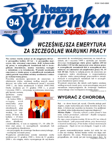 ISSN 1640-9566 94 styczeń 2006 WCZEŚNIEJSZA EMERYTURA ZA SZCZEGÓLNE WARUNKI PRACY Nie z awsz e trze ba cz ekać aż do osiągnię cia 60 lat w prz ypadku kobiet, 65 lat - w prz ypadku męż cz yz n, aby otrz ymać e me ryturę . Je śli wykonywało się pracę w sz cze gólnych warunkach lub w sz cze gólnym charakte rze , można wcze śnie j wystąpić z wnioskiem o to świadcze nie . Warunki uz yskania e me rytury z tytułu pracy w szkodliwych warunkach z ależ ą prze de wsz ystkim od daty urodzenia i rodz aju wykonywane j pracy. Przywilej uzy skania upra wnień do emerytury w obniżonym wieku, ustalanej we dług starych zasa d, dotyczy nie tylko osób urodzonych przed l stycznia 1949 r., ale także urodzonych w latach 1949-1968. Osoby uro dzone po 31 grudnia 1948 r., a przed l stycznia 1969 r., otrzymają wc ześnie jszą emeryturę, gdy łącznie zostaną spe łnione n astępujące warunki: - do końca 2006 r. o sią gną wi e k emerytalny przewi d z i a n y dla określonych grup zawo do wych i udowo dnią co najmniej 20-letni dla kobiety i 25-letni dla m ę ż c z y zn y okres skła dkowy i nieskładko wy, w tym co najmniej 15-, 10- albo 20letni staż pracy w szcze gólnych war unkach lub w szcze gólnym charakterze, - nie przystąpiły do otwartego fun dusz u emerytalnego, - rozwiąz ały stosunek pracy. Wyjątkowo potraktowane zostały natomiast osoby urodzone po 31 gr udn ia 1948 r., które do 31 gr udnia 2006 r. nie osiągną wiek u wyma gane go do uzy skania upra wnień do wc ześnie jsze j emerytury na starych zasadach, ale l stycznia 1999 r. spe łniały już war unki dotyczące wymaganego staż u pracy ogółem (20 lat dla kobie t i 25 lat dla męż cz yz n) oraz okresu pracy w sz cze gólnych warunkach lub w sz cze gólnym charakte rze (w z ależ ności od uciążliwości pracy 10, 15 lub 20 lat). Osoby te nabę dą pra wo do emerytury po osiągn ięciu wiek u określone go w rozporzą dzeniu w spra wie wiek u emerytalnego praco wnikó w zatrudnionych w szcze gólnych warunkach lub w sz cze gólnym charakterze (patrz niżej). Wysokość emerytury dla takich osób będz ie ustalana we dług no wych za sa d, przy czym przysługuje ona po d war unkiem nieprzystąpienia do otwartego f undusz u emerytalnego oraz rozwiązan ia stosunku pracy. (Ciąg dalszy na stronie 5) WYGRAĆ Z CHOROBĄ Rak – to słowo brzmi jak wyrok. Choroba atakuje podstępnie, często wykrywana jest, kiedy rozwinie się do stadium, w którym już za późno na leczenie. Czy poddawać się jednak mimo jednoznacznej tragicznej diagnozy? Marian Piętka – Chorobę wykryto u mnie ponad 4 lata temu. Lekarz powiedział „rakowiak”. Rzadko występuje, bardzo trudno się go leczy. Do tego czasu przepracowałem 36 lat na R-3 na różnych stanowiskach – jako pracownik taboru, przy konserwacji, w kontroli technicznej. 29 lat byłem również motorniczym zasilającym. Nigdy mi nic nie dolegało. I nagle to usłyszałem. Z guzem neuroendokrynnym można żyć wiele lat nic o nim nie wiedząc. Rośnie bardzo wolno nie dając żadnych objawów. Do czasu. Wykrywany jest najczęściej przypadkiem, ale wtedy już jest wystarczająco duży, by (Ciąg dalszy na stronie 2) Norweska solidarność Dowiedzieliśmy się o niezwykłym przykładzie solidarności okazanej trzynastu polskim pracownikom przez związki zawodowe i mieszkańców Bergen na zachodnim wybrzeżu Norwegii. Polacy zatrudnieni przez nieuczciwego pracodawcę (firma Exact ANS) wykonywali prace remontowo-budowlane i nie otrzymali wynagrodzenia za okres kilku miesięcy pracy. W dramatycznej sytuacji pomógł związek zawodowy Fellesforbundet (organizacja członkowska norweskiej centrali LO) oraz lokalne media, które na wniosek związku zwróciły się z apelem o pomoc do mieszkańców Bergen. Utworzono m.in. specjalne konto bankowe, na które zaczęły wpływać pieniądze dla ofiar nieuczciwego pracodawcy. W chwili obecnej lokalny oddział związku Fellesforbundet w Bergen liczy już 150 członków - pracowników z Polski. Zatrudniono również Polaka, który w imieniu norweskiego związku służy pomocą polskim pracownikom. NSZZ „S” rozpoczęła rozmowy z Fellesforbundet na temat nawiązania trwałej współpracy mającej służyć monitorowaniu działań nieuczciwych pracodawców i zapobieganiu dumpingowi społecznemu. Norweski przypadek jest przykładem współpracy pomiędzy NSZZ „S” i innymi europejskimi organizacjami związkowymi dotyczącej wspomagania pracowników poszukujących czasowo pracy za granicą. Dział Zagraniczny KK NSZZ „S” Pisać każdy może Zespół redakcyjny, wychodząc naprzeciw oczekiwaniom naszych czytelników, postanowił stworzyć w naszej gazecie dział łączności z czytelnikami. Oczekujemy na ciekawe wiadomości - dobre i złe - z życia zakładów oraz na propozycje innych tematów. Nasz adres: NASZA SYRENKA B i u l et y n NS ZZ „S ol i darnoś ć” MZA i TW 01-106 Warszawa, ul. Redutowa 27 tel./fax 837 93 51 e-mail: [email protected] 2 WYGRAĆ Z RAKIEM (Ciąg dalszy ze strony 1) pacjentowi pozostało niewiele czasu. Pan Marian zaczął walczyć z nowotworem. Marian Piętka – W ciągu tych 4 lat przeszedłem 15 kursów chemii – pięć trzydniowych i dziesięć pięciodniowych. Trzy razy byłem operowany. Niestety, pomagało to niewiele, wydawało się, że nie ma już dla mnie ratunku. Przeszedłem trzy reanimacje. Wtedy dr Jarosław Ćwikła, kierownik Pracowni Medycyny Nuklearnej Zakładu Diagnostyki Radiologicznej Centralnego Szpitala Klinicznego MSWiA na Wołoskiej po niepowodzeniu kolejnego sposobu leczenia – radioterapii, doradził leczenie radioizotopowe. Cały problem polegał na tym, że takiej terapii można się poddać za granicą. W Polsce się jej nie wykonuje. Pojechałem do Anglii, by poddać się zabiegom. W sumie wykonano ich cztery, skończyły się 6 września zeszłego roku. Już po pierwszym zacząłem się czuć lepiej. Kuracja poskutkowała. Ale pojawiła się kolejna przesz