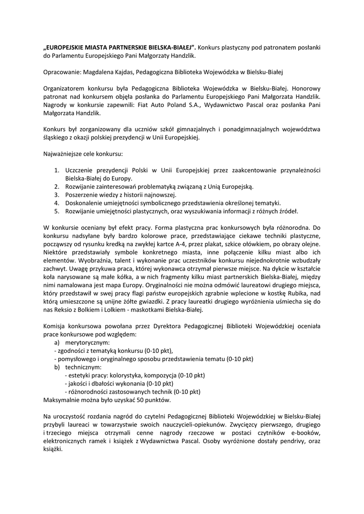 „EUROPEJSKIE MIASTA PARTNERSKIE BIELSKA-BIAŁEJ”. Konkurs plastyczny pod patronatem posłanki do Parlamentu Europejskiego Pani Małgorzaty Handzlik. Opracowanie: Magdalena Kajdas, Pedagogiczna Biblioteka Wojewódzka w Bielsku-Białej Organizatorem konkursu była Pedagogiczna Biblioteka Wojewódzka w Bielsku-Białej. Honorowy patronat nad konkursem objęła posłanka do Parlamentu Europejskiego Pani Małgorzata Handzlik. Nagrody w konkursie zapewnili: Fiat Auto Poland S.A., Wydawnictwo Pascal oraz posłanka Pani Małgorzata Handzlik. Konkurs był zorganizowany dla uczniów szkół gimnazjalnych i ponadgimnazjalnych województwa śląskiego z okazji polskiej prezydencji w Unii Europejskiej. Najważniejsze cele konkursu: 1. Uczczenie prezydencji Polski w Unii Europejskiej przez zaakcentowanie przynależności Bielska-Białej do Europy. 2. Rozwijanie zainteresowań problematyką związaną z Unią Europejską. 3. Poszerzenie wiedzy z historii najnowszej. 4. Doskonalenie umiejętności symbolicznego przedstawienia określonej tematyki. 5. Rozwijanie umiejętności plastycznych, oraz wyszukiwania informacji z różnych źródeł. W konkursie oceniany był efekt pracy. Forma plastyczna prac konkursowych była różnorodna. Do konkursu nadsyłane były bardzo kolorowe prace, przedstawiające ciekawe techniki plastyczne, począwszy od rysunku kredką na zwykłej kartce A-4, przez plakat, szkice ołówkiem, po obrazy olejne. Niektóre przedstawiały symbole konkretnego miasta, inne połączenie kilku miast albo ich elementów. Wyobraźnia, talent i wykonanie prac uczestników konkursu niejednokrotnie wzbudzały zachwyt. Uwagę przykuwa praca, której wykonawca otrzymał pierwsze miejsce. Na dykcie w kształcie koła narysowane są małe kółka, a w nich fragmenty kilku miast partnerskich Bielska-Białej, między nimi namalowana jest mapa Europy. Oryginalności nie można odmówić laureatowi drugiego miejsca, który przedstawił w swej pracy flagi państw europejskich zgrabnie wplecione w kostkę Rubika, nad którą umieszczone są unijne żółte gwiazdki. Z pracy laureatki drugiego wyróżnienia uśmiecha się do nas Reksio z Bolkiem i Lolkiem - maskotkami Bielska-Białej. Komisja konkursowa powołana przez Dyrektora Pedagogicznej Biblioteki Wojewódzkiej oceniała prace konkursowe pod względem: a) merytorycznym: - zgodności z tematyką konkursu (0-10 pkt), - pomysłowego i oryginalnego sposobu przedstawienia tematu (0-10 pkt) b) technicznym: - estetyki pracy: kolorystyka, kompozycja (0-10 pkt) - jakości i dbałości wykonania (0-10 pkt) - różnorodności zastosowanych technik (0-10 pkt) Maksymalnie można było uzyskać 50 punktów. Na uroczystość rozdania nagród do czytelni Pedagogicznej Biblioteki Wojewódzkiej w Bielsku-Białej przybyli laureaci w towarzystwie swoich nauczycieli-opiekunów. Zwycięzcy pierwszego, drugiego i trzeciego miejsca otrzymali cenne nagrody rzeczowe w postaci czytników e-booków, elektronicznych ramek i książek z Wydawnictwa Pascal. Osoby wyróżnione dostały pendrivy, oraz książki.