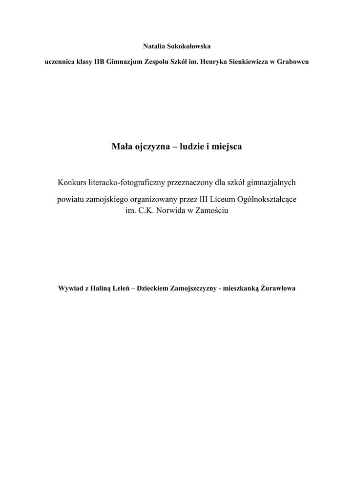 Natalia Sokokołowska uczennica klasy IIB Gimnazjum Zespołu Szkół im. Henryka Sienkiewicza w Grabowcu Mała ojczyzna – ludzie i miejsca Konkurs literacko-fotograficzny przeznaczony dla szkół gimnazjalnych powiatu zamojskiego organizowany przez III Liceum Ogólnokształcące im. C.K. Norwida w Zamościu Wywiad z Haliną Leleń – Dzieckiem Zamojszczyzny - mieszkanką Żurawlowa Pamięci tych, których już nie ma. N.S: Dzień dobry ciociu, dziękuję ci bardzo, że chciałaś się ze mną spotkać. Zdaję sobie sprawę z tego, że niektóre pytania mogą przywołać bolesne wspomnienia. Ale chciałabym poznać historię mojej rodziny, więc zacznijmy. Czy mogłabyś mi opowiedzieć o swoim dzieciństwie i latach szkolnych? H.L.: Szkoła do której uczęszczałam miała dwie klasy łączone; to znaczy, że gdy jedna miała czytanie, to druga ciche pisanie. W jednej małej salce siedzieliśmy wszyscy. Przedmiotów było cztery: język polski, matematyka, śpiew i wychowanie fizyczne. N.S: A Twój ulubiony przedmiot ? H.L: Byłam dzieckiem dosyć ruchliwym, więc lubiłam wychowanie fizyczne i śpiew. N.S: A dalej, jak wyglądała nauka w tej szkole? H.L: Nauczyciela mieliśmy tylko jednego aż do końca klasy szóstej. Klasa siódma rozpoczynała się w Grabowcu i tam już każdy przedmiot miał swojego wykładowcę. N.S: A nauczyciele, którego z nich wspominasz najmilej i najserdeczniej? H.L: Kierownikiem szkoły - bo tak kiedyś mówiono na dyrektora - był Pan Rybicki; człowiek wielkiego serca i naprawdę wspaniały wyrozumiały nauczyciel. Gdy teraz nawet po latach o nim mówię, jest mi ciepło na sercu. N.S: Na pewno miałaś przyjaciół, a czy któraś z przyjaźni przetrwała próbę czasu? H.L: To może wydać się niesamowite, ale moim przyjacielem, a potem wielką miłością był mój mąż. N.S: Jak to? H.L: Tak, to były piękne czasy. Gdy ja miałam trzy latka, on miał sześć i opiekował się mną jak starszy brat młodszą siostrą. Później na potańcówkach odgrywał rolę ojca, troskliwego opiekuna. Spędziliśmy razem bardzo dużo czasu. Sama nawet nie wiem, kiedy ta przyjaźń przerodziła się w wielką miłość. W wieku 21 lat zostałam jego żoną i przez 42 lata byliśmy małżeństwem. N.S: Może teraz kilka słów o rodzinie? H.L: Było nas troje - siostra i brat – to moje młodsze rodzeństwo. Rodzice zajmowali się pracą na roli i byli bardzo szczęśliwym małżeństwem, które przeżyło wspólnie 55 lat. Tatuś zmarł wcześniej, mamusia - będąc wdową - żyła jeszcze 15 lat. Jak już wspomniałam w wieku 21 lat wyszłam za mąż i urodziłam dwójkę dzieci: córkę Jolantę i syna Mariana, z których jestem naprawdę dumna. N.S: Teraz wróćmy jeszcze do odległej przeszłości, do trudniejszych i bolesnych wspomnień. Jak wspominasz czas wysiedlenia? Nagle na twarzy dotychczas uśmiechniętej starszej kobiety cieszącej się życiem ujrzałam ból i smutek . Pomyślałam, może to niepotrzebne, może już skończę tę rozmowę, ale po chwili podniosła wysoko głowę i z drżeniem głosu zaczęła opowiadać .... H.L: Był wczesny ranek 12 lutego 1943 roku, miałam wtedy 10 lat . Jak codziennie rano wybierałam się do szkoły, gdy nagle wszedł do kuchni SS-man z karabinem na ramieniu. Mówił coś po niemiecku, pokazywał coś na migi rękoma. Nie wiedziałam, co się dzieje, gdyż nic nie zrozumiałam z jego wypowiedzi. Po chwili wyszedł, a rodzice powiedzieli, żebyśmy się ubrali, bo za pół godziny wychodzimy, a jeżeli go nie posłuchamy, to nas zabije. Naprawdę niewiele można było spakować w ciągu tak krótkiego czasu. Tatuś przed opuszczeniem domu miał w majdołeczku chleb, trochę ubrań, a dla mojego młodszego brata, który miał półtora roku, pieluszki. Zaskoczyło mnie to i do dzisiaj jestem mu wdzięczna za to, że wziął rodzinną fotografię, gdyż teraz po latach jest to moja najcenniejsza rodzinna pamiątka. Niemiec - ten z karabinem - zaprowadził nas na środek wsi pod krzyż, gdzie byli już zebrani inni mieszkańcy Żurawlowa. Kazali zaprzęgać konie do wozów i my na tych wozach w ten mroźny lutowy dzień jechaliśmy w kierunku Zamościa. Za nami „podróżowali” mieszkańcy Szczelatyna i Skomoroch. Dotarliśmy do Miączyna, gdy nagle jeden z mężczyzn z naszej wioski - Marian Skóra zeskoczył z wozu i biegł poboczem, a z pobocza nagle skoczył w rów. Wówczas rozległ się straszliwy huk. Na moich oczach został zabity - zastrzelony z zimną krwią. Zobaczyłam po raz pierwszy śmierć, wtedy zrozumiałam, że zaczyna się coś tragicznego w moim życiu. Do Zamościa dotarliśmy już pod wieczór. Wszystkich nas zapędzono do baraku numer pięć. Zamknięto drzwi, zgaszono światło. Słychać było przeraźliwy płacz dzieci. Było tam tak ciasno, że nie mogliśmy się nawet położyć. Rano przeprowadzono nas rodzinami do następnego baraku tzw. rozdzielnika. Tam oddzielono starców, dzieci do lat czternastu i matki z małymi dziećmi. Osadzono nas w baraku nr 10. Panował tam straszliwy tłok, prycze zapełnione były przez osoby wcześniej przywiezione. Dla nas została zimna podłoga. Dzieci, które były wysiedlone wcześniej, były wystraszone, bardzo mizerne i słabe. Nie widziałam nigdy tylu tak wychudzonych i przerażonych dzieci. One umierały masowo jedno po drugim, a matki płacząc, wynosiły je na rękach do trupiarni... N.S: Nagle jej głos urwał się, a po policzkach popłynęły łzy, zakrywając się rękoma, dyskretnie obtarła je. Wówczas spytałam... Ciociu może skończymy tę opowieść? - a ona odpowiedziała: H.L: Nie dziecko, już jest dobrze, ale to nadal tak bardzo boli. N.S: Moje oczy też napełniły się łzami, miałam ochotę przytulić się do swojej kuzynki, ale co można powiedzieć, jak ukoić te bolesne wspomnienia. Nie byłam pewna czy kontynuować tę rozmowę. Cierpliwie czekałam, po chwili gdy już się uspokoiła, zaczęła opowiadać dale