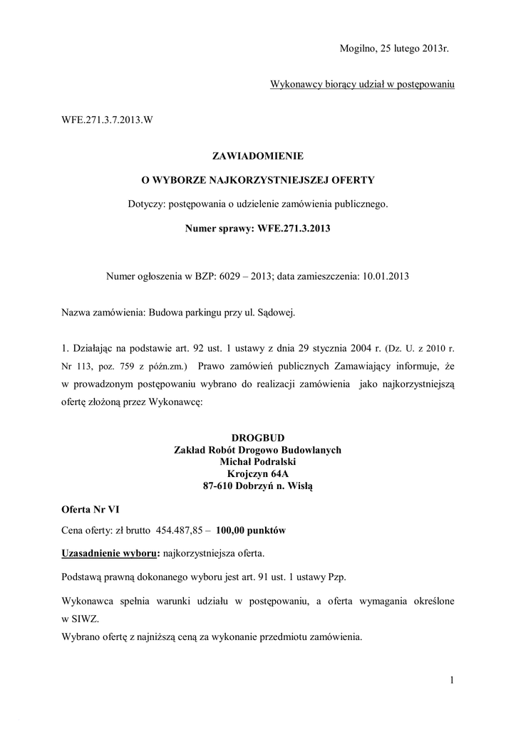 Mogilno, 25 lutego 2013r. Wykonawcy biorący udział w postępowaniu WFE.271.3.7.2013.W ZAWIADOMIENIE O WYBORZE NAJKORZYSTNIEJSZEJ OFERTY Dotyczy: postępowania o udzielenie zamówienia publicznego. Numer sprawy: WFE.271.3.2013 Numer ogłoszenia w BZP: 6029 – 2013; data zamieszczenia: 10.01.2013 Nazwa zamówienia: Budowa parkingu przy ul. Sądowej. 1. Działając na podstawie art. 92 ust. 1 ustawy z dnia 29 stycznia 2004 r. (Dz. U. z 2010 r. Nr 113, poz. 759 z późn.zm.) Prawo zamówień publicznych Zamawiający informuje, że w prowadzonym postępowaniu wybrano do realizacji zamówienia jako najkorzystniejszą ofertę złożoną przez Wykonawcę: DROGBUD Zakład Robót Drogowo Budowlanych Michał Podralski Krojczyn 64A 87-610 Dobrzyń n. Wisłą Oferta Nr VI Cena oferty: zł brutto 454.487,85 – 100,00 punktów Uzasadnienie wyboru: najkorzystniejsza oferta. Podstawą prawną dokonanego wyboru jest art. 91 ust. 1 ustawy Pzp. Wykonawca spełnia warunki udziału w postępowaniu, a oferta wymagania określone w SIWZ. Wybrano ofertę z najniższą ceną za wykonanie przedmiotu zamówienia. 1 W prowadzonym postępowaniu złożono następujące oferty: Numer oferty I Nazwa i adres firmy Przyznana punktacja Firma ’’DOM’’ Projektowanie, Nadzór, Wykonawstwo Robót Budowlanych Oferta odrzucona mgr Andrzej Teska ul.Wiosenna 2 Szubin-Wieś 89-200 Szubin II III Konsorcjum: Lider: Firma Usługowo-Handlowa ,,ANNA’’ Anna Białobrzycka ul.Wodna 18 62-200 Gniezno Partner: Firma Budowlano-Remontowo-Drogowa Dariusz Białobrzycki Os.K.Wielkiego 14A/1 62-200 Gniezno P.P.H.U.’’BUD-MIX’’ TYNKI-POSADZKI Michał Nowaczyk ul.Parkowa 4/2 62-220 Niechanowo 91,12 83,71 IV ’’BADERA’’ Firma Produkcyjno-Handlowo-Usługowa Tadeusz Badera Dalachów 354 46-325 Rudniki Oferta odrzucona V DROGI I MOSTY Henryk Boczek ul. Pakoska 9 88-100 Inowrocław 70,42 2 VI VII VIII IX X XI XII DROGBUD Zakład Robót Drogowo Budowlanych Michał Podralski Krojczyn 64A 87-610 Dobrzyń n. Wisłą Przedsiębiorstwo Usług Miejskich „PUMAK” Spółka z o.o. ul.Kcyńska 45 89-200 Szubin Przedsiębiorstwo Ogólnobudowlane TYNK-BUD Adam Żabierek Święte 10 62-511 Kramsk P.P.H.U ’’EVENTUS’’ Arkadiusz Kalinski ul.Orłowska 62 88-100 Inowrocław Przedsiębiorstwo Usługowo Handlowe ’’DRAINPOL’’s.c. Roman Szczuraszek&Jan Góra ul.Sienkiewicza 21 88-100 Inowrocław IZBRUK Maciej Rybicki Zakład Ogólnobudowlany Dziedzice 3a 62-404 Ciążeń P.W. ’’ PION-BUD’’ Paweł Pieszak ul.Prusa 22 88-320 Strzelno 100,00 70,23 75,34 82,95 Oferta odrzucona 70,84 Oferta odrzucona 3 XIII Przedsiębiorstwo El-Kajo Spółka z o.o. ul.T.Kościuszki 27 85-079 Bydgoszcz XIV KADA-BIS Grupa Budowlana Sp. z o.o. ul.Wydmy 3 85-188 Bydgoszcz XV XVI XVII XVIII XIX Przedsiębiorstwo Usług Budowlanych ’’BROSTER’’ Marek Brodecki & Mirosław Stec - Spółka Jawna ul. Łączna 5 88-160 Janikowo Przedsiębiorstwo Produkcyjno-HandlowoUsługowe ,,MEL-BUD’’Sp.z o.o. w Marcinkowie 88-110 Inowrocław 2 Zakład Usług Wodno-Melioracyjnych ’’WODMEL’’ Ryszard Grabarczyk Brzeźno ul.Konińska 17 62-513 Krzymów Firma Wielobranżowa EL-DOM Elżbieta Urbańska ul.Nastrojowa 6 85-830 Bydgoszcz Skanska S.A. ul.Gen.J.Zajączka 9 01-518 Warszawa Oddział Budownictwa Inżynieryjnego w Poznaniu ul.Bystra 7 61-366 Poznań 41 75,81 Oferta odrzucona 69,72 73,90 59,68 68,28 69,73 4 XX XXI XXII Przedsiębiorstwo Produkcyjno-Usługowe ,,AFFABRE’’ Spółka z o.o. ul.Inwalidów 1 85-727 Bydgoszcz Przedsiębiorstwo Handlowo-Usługowe ’’TRANS-POM’’ Piotr Pomagier Marcinkowo 37 88-110 Inowrocław 2 Przedsiębiorstwo Przemysłu Betonów „PREFABET-BIAŁE BŁOTA” S.A. ul.Betonowa 1 86-005 Białe Błota 71,28 Oferta odrzucona 87,02 2.Działając na podstawie art. 92 ust. 1 pkt. 3) Prawa zamówień publicznych Zamawiający informuje, że w prowadzonym postępowaniu został wykluczony Wykonawca: - ’’BADERA’’ Firma Produkcyjno – Handlowo - Usługowa, Tadeusz Badera, Dalachów 354, 46-325 Rudniki (oferta nr IV). Wykonawca został wykluczony na podstawie art. 24 ust.ust.2 pkt. 4 ustawy Prawo zamówień publicznych (Dz. U. z 2010 r. Nr 113, poz. 759 z późn.zm.), ponieważ na wezwanie Zamawiającego z dnia 4 lutego 2013r. Wykonawca dostarczył wyjaśnienie do referencji załączonej do oferty, że po dokładniejszej weryfikacji kosztorysu, kwota jest nieco niższa od kwoty wymaganej przez Zamawiającego. W związku z powyższym Wykonawca nie spełnił warunku przedstawionego w pkt. 5.1.2. i 6.2. SIWZ. - Przedsiębiorstwo Usługowo Handlowe ’’DRAINPOL’’s.c., Roman Szczuraszek & Jan Góra, ul. Sienkiewicza 21, 88-100 Inowrocław (oferta nr X). Wykonawca został wykluczony na podstawie art. 24 ust.2 pkt. 4 ustawy Prawo zamówień publicznych (Dz. U. z 2010 r. Nr 113, poz. 759 z późn.zm.), ponieważ: a) na wezwanie Zamawiającego z dnia 4 lutego 2013r. Wykonawca nie dostarczył w nieprzekraczalnym terminie do dnia 15 lutego 2013r. do godz.15:00 wyjaśnienia do referencji załączonej do oferty. b) na wezwanie Zamawiającego z dnia 5 lutego 2013r. Wykonawca nie dostarczył w nieprzekraczalnym terminie do dnia 15 lutego 2013r. do godz.15:00 dowodu wpłaty opłacenia polisy w wysokości 2.554,00 zł, której termin płatności został określony do dnia 25.06.2012r. 5 Wyjaśnienie referencji załączonej do oferty oraz dowód wpłaty opłacenia polisy Zamawiający otrzymał w formie pisemnej w dniu 18 lutego 2013r. tj. po terminie wyznaczonym przez Zamawiającego. 3.Działając na podstawie art. 92 ust. 1 pkt. 2) Prawa zamówień publicznych Zamawiający informuje, że w prowadzonym postępowaniu została odrzucona oferta: - nr I (Firma ’’DOM’’ Projektowanie, Nadzór, Wykonawstwo Robót Budowlanych, mgr Andrzej Teska, ul.Wiosenna 2, Szubin-Wieś, 89-200 Szubin. Zamawiający dokonał odrzucenia na podstawie art.89 ust.1 pkt.2 ustawy Prawo zamówień publicznych (Dz. U. z 2010 r. Nr 113, poz. 759 z późn