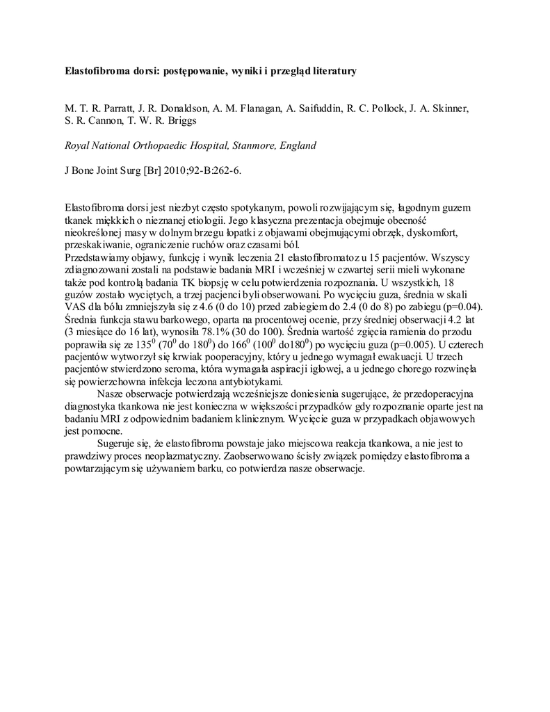 Elastofibroma dorsi: postępowanie, wyniki i przegląd literatury M. T. R. Parratt, J. R. Donaldson, A. M. Flanagan, A. Saifuddin, R. C. Pollock, J. A. Skinner, S. R. Cannon, T. W. R. Briggs Royal National Orthopaedic Hospital, Stanmore, England J Bone Joint Surg [Br] 2010;92-B:262-6. Elastofibroma dorsi jest niezbyt często spotykanym, powoli rozwijającym się, łagodnym guzem tkanek miękkich o nieznanej etiologii. Jego klasyczna prezentacja obejmuje obecność nieokreślonej masy w dolnym brzegu łopatki z objawami obejmującymi obrzęk, dyskomfort, przeskakiwanie, ograniczenie ruchów oraz czasami ból. Przedstawiamy objawy, funkcję i wynik leczenia 21 elastofibromatoz u 15 pacjentów. Wszyscy zdiagnozowani zostali na podstawie badania MRI i wcześniej w czwartej serii mieli wykonane także pod kontrolą badania TK biopsję w celu potwierdzenia rozpoznania. U wszystkich, 18 guzów zostało wyciętych, a trzej pacjenci byli obserwowani. Po wycięciu guza, średnia w skali VAS dla bólu zmniejszyła się z 4.6 (0 do 10) przed zabiegiem do 2.4 (0 do 8) po zabiegu (p=0.04). Średnia funkcja stawu barkowego, oparta na procentowej ocenie, przy średniej obserwacji 4.2 lat (3 miesiące do 16 lat), wynosiła 78.1% (30 do 100). Średnia wartość zgięcia ramienia do przodu poprawiła się ze 1350 (700 do 1800 ) do 1660 (1000 do1800 ) po wycięciu guza (p=0.005). U czterech pacjentów wytworzył się krwiak pooperacyjny, który u jednego wymagał ewakuacji. U trzech pacjentów stwierdzono seroma, która wymagała aspiracji igłowej, a u jednego chorego rozwinęła się powierzchowna infekcja leczona antybiotykami. Nasze obserwacje potwierdzają wcześniejsze doniesienia sugerujące, że przedoperacyjna diagnostyka tkankowa nie jest konieczna w większości przypadków gdy rozpoznanie oparte jest na badaniu MRI z odpowiednim badaniem klinicznym. Wycięcie guza w przypadkach objawowych jest pomocne. Sugeruje się, że elastofibroma powstaje jako miejscowa reakcja tkankowa, a nie jest to prawdziwy proces neoplazmatyczny. Zaobserwowano ścisły związek pomiędzy elastofibroma a powtarzającym się używaniem barku, co potwierdza nasze obserwacje.