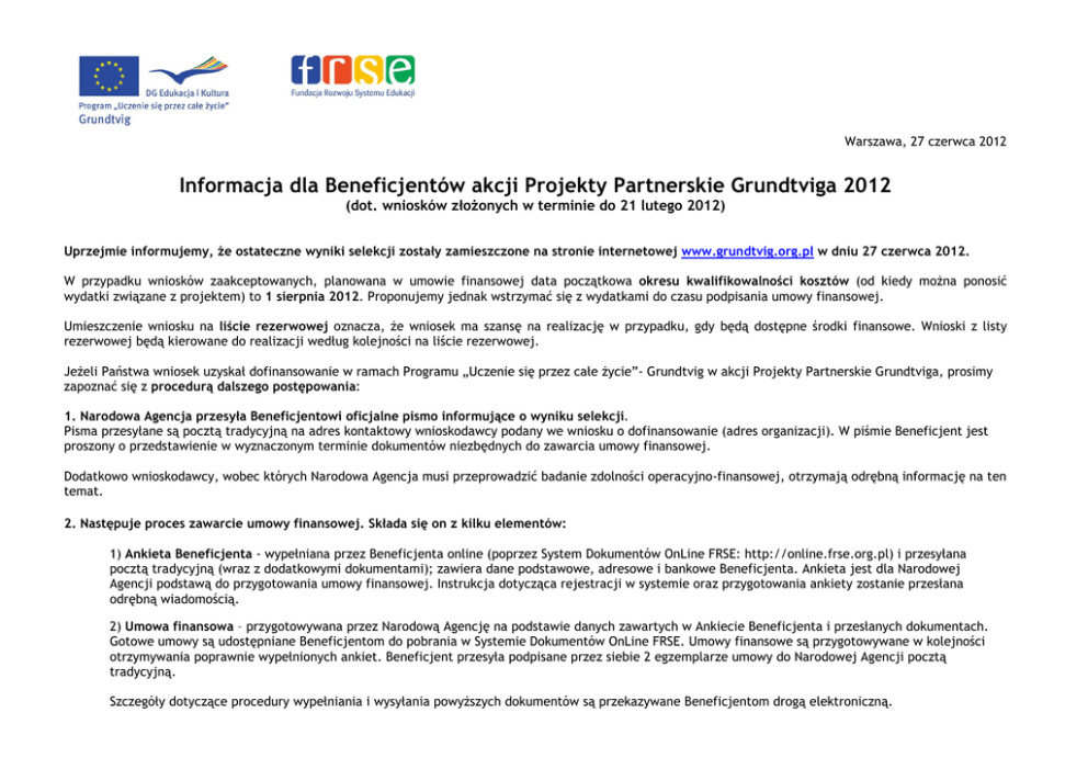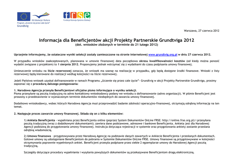 Warszawa, 27 czerwca 2012 Informacja dla Beneficjentów akcji Projekty Partnerskie Grundtviga 2012 (dot. wniosków złoŜonych w terminie do 21 lutego 2012) Uprzejmie informujemy, Ŝe ostateczne wyniki selekcji zostały zamieszczone na stronie internetowej www.grundtvig.org.pl w dniu 27 czerwca 2012. W przypadku wniosków zaakceptowanych, planowana w umowie finansowej data początkowa okresu kwalifikowalności kosztów (od kiedy moŜna ponosić wydatki związane z projektem) to 1 sierpnia 2012. Proponujemy jednak wstrzymać się z wydatkami do czasu podpisania umowy finansowej. Umieszczenie wniosku na liście rezerwowej oznacza, Ŝe wniosek ma szansę na realizację w przypadku, gdy będą dostępne środki finansowe. Wnioski z listy rezerwowej będą kierowane do realizacji według kolejności na liście rezerwowej. JeŜeli Państwa wniosek uzyskał dofinansowanie w ramach Programu „Uczenie się przez całe Ŝycie”- Grundtvig w akcji Projekty Partnerskie Grundtviga, prosimy zapoznać się z procedurą dalszego postępowania: 1. Narodowa Agencja przesyła Beneficjentowi oficjalne pismo informujące o wyniku selekcji. Pisma przesyłane są pocztą tradycyjną na adres kontaktowy wnioskodawcy podany we wniosku o dofinansowanie (adres organizacji). W piśmie Beneficjent jest proszony o przedstawienie w wyznaczonym terminie dokumentów niezbędnych do zawarcia umowy finansowej. Dodatkowo wnioskodawcy, wobec których Narodowa Agencja musi przeprowadzić badanie zdolności operacyjno-finansowej, otrzymają odrębną informację na ten temat. 2. Następuje proces zawarcie umowy finansowej. Składa się on z kilku elementów: 1) Ankieta Beneficjenta - wypełniana przez Beneficjenta online (poprzez System Dokumentów OnLine FRSE: http://online.frse.org.pl) i przesyłana pocztą tradycyjną (wraz z dodatkowymi dokumentami); zawiera dane podstawowe, adresowe i bankowe Beneficjenta. Ankieta jest dla Narodowej Agencji podstawą do przygotowania umowy finansowej. Instrukcja dotycząca rejestracji w systemie oraz przygotowania ankiety zostanie przesłana odrębną wiadomością. 2) Umowa finansowa – przygotowywana przez Narodową Agencję na podstawie danych zawartych w Ankiecie Beneficjenta i przesłanych dokumentach. Gotowe umowy są udostępniane Beneficjentom do pobrania w Systemie Dokumentów OnLine FRSE. Umowy finansowe są przygotowywane w kolejności otrzymywania poprawnie wypełnionych ankiet. Beneficjent przesyła podpisane przez siebie 2 egzemplarze umowy do Narodowej Agencji pocztą tradycyjną. Szczegóły dotyczące procedury wypełniania i wysyłania powyŜszych dokumentów są przekazywane Beneficjentom drogą elektroniczną. 4. Podpisanie umowy finansowej przez Narodową Agencję i odesłanie jednego egzemplarza do Beneficjenta. 5. Wypłata I raty dofinansowania. Po podpisaniu umowy przez drugą stronę - Narodową Agencję - następuje przelew środków finansowych (80% przyznanej kwoty dofinansowania – chyba, Ŝe w wyniku procedury badania zdolności operacyjno-finansowej Narodowa Agencja podjęła decyzję o rozłoŜeniu płatności na większą liczbę rat) na rachunek beneficjenta podane w umowie, w terminie do 45 dni od dnia podpisania umowy przez obie strony. 6. Realizacja projektu W trakcie realizacji projektu Narodowa Agencja moŜe przeprowadzić w siedzibie Beneficjenta wizytę monitoringową, jak równieŜ w przypadku wylosowania Beneficjenta kontrolę on-the-spot. O obu tych wizytach Beneficjent jest informowany z wyprzedzeniem. Po roku realizacji projektu Beneficjent jest zobowiązany przesłać raport postępów w terminie do 30 czerwca 2012. 7. ZłoŜenie raportu końcowego. Po zrealizowanym projekcie naleŜy rozliczyć się z jego realizacji zgodnie z zasadami określonymi w umowie. Beneficjent przesyła raport końcowy w terminie do 30 września 2014 roku do Narodowej Agencji. W tym tyerminie Beneficjent jest takŜe zobowiązany do uzupełniania bazy EST - http://www.llp.org.pl/est.html. Pod koniec realizacji projektu (na ok. 2 miesiące przed zakończeniem) Beneficjent otrzyma odnośnik do indywidualnego formularza raportu oraz instrukcje jego wypełniania. Wypłata II raty dofinansowania, zgodnie z umową finansową, będzie dokonana w terminie maksymalnie 90 dni od daty przysłania przez beneficjenta raportu końcowego do Narodowej Agencji. NaleŜy przechowywać dokumentację finansową i merytoryczną przez określony w umowie okres. Informujemy, Ŝe część umów finansowych podlega kontroli szczegółowej (tzw. desk-check). Wówczas Narodowa Agencja po otrzymaniu raportu końcowego moŜe zaŜądać na osobny wniosek przesłania oryginałów dokumentów finansowych. W tym przypadku NA zwróci się do Beneficjenta z oficjalnym pismem o konieczności dosłania oryginałów dokumentów (karty pokładowe/bilety, certyfikaty uczestnictwa w spotkaniach). Dokumenty, o których mowa wyŜej zostaną wyszczególnione w umowie finansowej. Spotkanie z Beneficjentami Projektów Partnerskich Grundtviga w roku 2012 Miło nam poinformować, Ŝe w 2012 r., podobnie jak w roku ubiegłym, planujemy organizację spotkania z Beneficjentami akcji Projekty Partnerskie Grundtviga (selekcja 2012). Spotkanie odbędzie się w pierwszej połowie sierpnia i będzie miało na celu zaznajomienie z najwaŜniejszymi zasadami akcji (w tym zasadami finansowymi), poznanie oczekiwań Komisji Europejskiej oraz Narodowej Agencji w stosunku do realizatorów projektów, a takŜe przekazanie doświadczeń ze zrealizowanych juŜ projektów. Udział w spotkaniu ma takŜe umoŜliwić poznanie się organizacji i późniejsze wzajemne wspieranie się w trakcie realizacji projektów. O szczegółach poinformujemy Państwa w oddzielnej wiadomości (mail). JuŜ teraz serdecznie zapraszamy wszystkich Beneficjentów do udziału w spotkaniu!