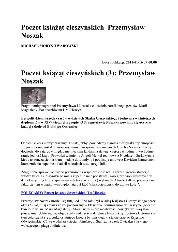 Poczet książąt cieszyńskich Przemysław Noszak MICHAEL MORYS-TWAROWSKI Data publikacji: 2011-01-16 09:00:00 Poczet książąt cieszyńskich (3): Przemysław Noszak Fragm tumby nagrobnej Przemysława I Noszaka z kościoła parafialnego p.w. św. Marii Magdaleny. Fot.: Archiwum UM Cieszyn. Był politykiem wszech czasów w dziejach Śląska Cieszyńskiego i jednym z ważniejszych dyplomatów w XIV-wiecznej Europie. O Przemysławie Noszaku powinno się uczyć w każdej szkole od Białki po Ostrawicę. Odniósł sukces niewyobrażalny. To tak, jakby, powiedzmy starosta cieszyński czy europoseł z tego regionu, został mianowany ministrem spraw zagranicznych Czech i Niemiec. Kiedy dochodzi do zatargów między niemieckimi landami z dawnej części zachodniej i wschodniej, ratuje jedność kraju. Prowadzi w imieniu Angeli Merkel rozmowy z Nicolasem Sarkozym, a kiedy te kończą się fiaskiem – jedzie do Londynu i podpisuje umowę z Davidem Cameronem, która zmienia zupełnie układ sił w krajach tzw. starej Unii. Zdaję sobie sprawę, że trudno przenosić na współczesność realia sprzed sześciu stuleci, a władza księcia cieszyńskiego miała zupełnie inne podstawy i zasięg niż osób wybranych w demokratycznych (czy sprawiających takie wrażenie) wyborach. Chodzi tylko o podkreślenie faktu, że tym wyjątkowym dyplomatą był ktoś "śląskocieszyński do szpiku kości". POLECAMY: Poczet książąt cieszyńskich (1): Mieszko Przemysław Noszak urodził się tutaj, od 1358 roku był władcą Księstwa Cieszyńskiego przez okres 52 lat, tutaj zmarł i został pochowany w klasztorze dominikanów w Cieszynie (obecnie kościół p.w. św. Marii Magdaleny). Starał się w miarę możliwości powiększyć swój stan posiadania. Udało mu się objąć rządy nad częścią dzielnicy bytomskiej z połową Bytomia (w tym celu ożenił się z córką ostatniego księcia bytomskiego), a także przejąć Księstwo Oświęcimskie. Córkę wydał za księcia lubińskiego. Stał też na czele Związku Śląskiego, walczącego z plagą zbójnictwa. I ten sam Przemysław Noszak był doradcą cesarza Karola IV Luksemburskiego, a później jego syna i następcy Wacława IV. Władca, rezydujący na Górze Zamkowej w Cieszynie, co jakiś czas opuszczał swoją siedzibę, by udać się w daleką podróż. Dwukrotnie był w Paryżu, gdzie za pierwszym razem próbował ratować sojusz czesko-francuski, a za drugim doprowadzić do zakończenia wojny stuletniej, którą prowadziły Francja i Anglia. W Londynie zaaranżował małżeństwo króla Ryszarda II z czeską królewną Anną; przy okazji otrzymał stałą pensję od zadowolonego monarchy. W 1384 roku doprowadził do, swoją drogą krótkotrwałego, rozejmu między walczącymi państwami niemieckimi. Dwa lata później był gubernatorem Czech pod nieobecność króla. Jak na władcę Księstwa Cieszyńskiego, kariera wręcz niesamowita. POLECAMY: Poczet książąt cieszyńskich (2): Kazimierz I Pod koniec XIV wieku w Czechach zaczęto patrzeć niechętnie na obcokrajowców w królewskim otoczeniu i Przemysław Noszak stracił miejsce w radzie królewskiej. Starał się dalej prowadzić aktywną działalność polityczną, mimo wieku i pogarszającego się stanu zdrowia. Ze względu na podagrę musiał być noszony w lektyce, stąd przydomek Noszak. Zmarł w 1410 roku, mając około 75 lat. W ostatnich latach można było przeczytać sporo w lokalnych mediach o dyskusjach wokół nazw ulic i rond. Może zamiast sięgać do panteonu bohaterów ogólnonarodowych warto zwrócić uwagę na wspomnianego księcia cieszyńskiego? Z pewnością nie będzie budził kontrowersji, a za to "ulica (czy rondo) Przemysława Noszaka" w pewien sposób będzie przypominała o najwybitniejszym z Piastów Cieszyńskich.
