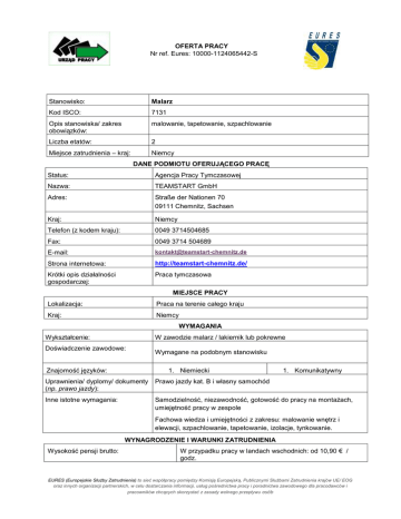 OFERTA PRACY Nr ref. Eures: 10000-1124065442-S Stanowisko: Malarz Kod ISCO: 7131 Opis stanowiska/ zakres obowiązków: malowanie, tapetowanie, szpachlowanie Liczba etatów: 2 Miejsce zatrudnienia – kraj: Niemcy DANE PODMIOTU OFERUJĄCEGO PRACĘ Status: Agencja Pracy Tymczasowej Nazwa: TEAMSTART GmbH Adres: Straße der Nationen 70 09111 Chemnitz, Sachsen Kraj: Niemcy Telefon (z kodem kraju): 0049 3714504685 Fax: 0049 3714 504689 E-mail: [email protected] Strona internetowa: http://teamstart-chemnitz.de/ Krótki opis działalności gospodarczej: Praca tymczasowa MIEJSCE PRACY Lokalizacja: Praca na terenie całego kraju Kraj: Niemcy WYMAGANIA Wykształcenie: W zawodzie malarz / lakiernik lub pokrewne Doświadczenie zawodowe: Znajomość języków: Wymagane na podobnym stanowisku 1. Niemiecki 1. Komunikatywny Uprawnienia/ dyplomy/ dokumenty (np. prawo jazdy): Prawo jazdy kat. B i własny samochód Inne istotne wymagania: Samodzielność, niezawodność, gotowość do pracy na montażach, umiejętność pracy w zespole Fachowa wiedza i umiejętności z zakresu: malowanie wnętrz i elewacji, szpachlowanie, tapetowanie, izolacje, tynkowanie. WYNAGRODZENIE I WARUNKI ZATRUDNIENIA Wysokość pensji brutto: W przypadku pracy w landach wschodnich: od 10,90 € / godz. EURES (Europejskie Służby Zatrudnienia) to sieć współpracy pomiędzy Komisją Europejską, Publicznymi Służbami Zatrudnienia krajów UE/ EOG oraz innych organizacji partnerskich, w celu dostarczania informacji, usług pośrednictwa pracy i poradnictwa zawodowego dla pracodawców i pracowników chcących skorzystać z zasady wolnego przepływu osób W przypadku pracy w landach zachodnich 12,80 € / godz. Waluta, w jakiej wypłacana jest pensja: Euro Dodatkowe świadczenia: - Zapewnione zakwaterowanie na montażach - wynagrodzenie za start – 150 € - dieta za każdy dzień pracy na montażu Nazwa firmy, z którą zostanie podpisana umowa: TEAMSTART GmbH Rodzaj umowy: Umowa o pracę Wymiar czasu pracy Pełen etat Czas trwania umowy: Umowa na czas nieokreślony Liczba godzin tygodniowo: 40 Zmiany i praca w dni wolne: Nie Data rozpoczęcia: Od 20.07.2015 SPOSÓB SKŁADANIA WNIOSKU Wymagane dokumenty: CV w j. niemieckim Język, w którym muszą być sporządzone przedkładane dokumenty: Niemiecki Do kogo należy wysłać dokumenty: Do Agencji Pracy Tymczasowej Gdzie należy wysłać dokumenty: Na adres e-mail [email protected] W tytule proszę wpisać “Maler” Dane teleadresowe doradcy EURES lub przedstawiciela pracodawcy: Pani Andrea Kluge tel. 00493714504685 WAŻNOŚĆ Data publikacji: 13.07.2015 r. Termin przedkładania podań o pracę / zakończenia ważności oferty: Do odwołania Agencja pracy tymczasowej TEAMSTART GmbH, że prowadzi działalność zgodnie z przepisami obowiązującymi na terenie Niemiec. UWAGA: 1. Umowa z zagranicznym pracodawcą zostanie zawarta zgodnie z prawem kraju zatrudnienia. Oznacza to, że wszystkie roszczenia odnośnie do warunków, które obejmuje umowa, można kierować wyłącznie do odpowiedniego sądu w kraju zatrudnienia. Publiczne służby zatrudnienia (EURES) nie mogą pośredniczyć ani reprezentować pracownika w sądzie kraju zatrudnienia w przypadku sporu z pracodawcą. 2. Publiczne służby zatrudnienia (EURES) dokładają wszelkich starań, aby zapewnić rzetelność i wiarygodność ofert pracy zgłoszonych w lokalnym urzędzie pracy. Należy wyjaśnić, że oferta pracy została zgłoszona przez stronę trzecią i EURES nie odpowiada za ewentualne rozbieżności między warunkami pracy określonymi w ofercie pracy i warunkami oferowanymi przez potencjalnego pracodawcę. 3. Publiczne służby zatrudnienia (EURES) informują, że będą zbierać, przetwarzać i przekazywać potencjalnym pracodawcom zgodnie z przepisami dotyczącymi ochrony danych osobowych wszystkie dane osobowe dostarczone przez osoby poszukujące pracy. EURES (Europejskie Służby Zatrudnienia) to sieć współpracy pomiędzy Komisją Europejską, Publicznymi Służbami Zatrudnienia krajów UE/ EOG oraz innych organizacji partnerskich, w celu dostarczania informacji, usług pośrednictwa pracy i poradnictwa zawodowego dla pracodawców i pracowników chcących skorzystać z zasady wolnego przepływu osób