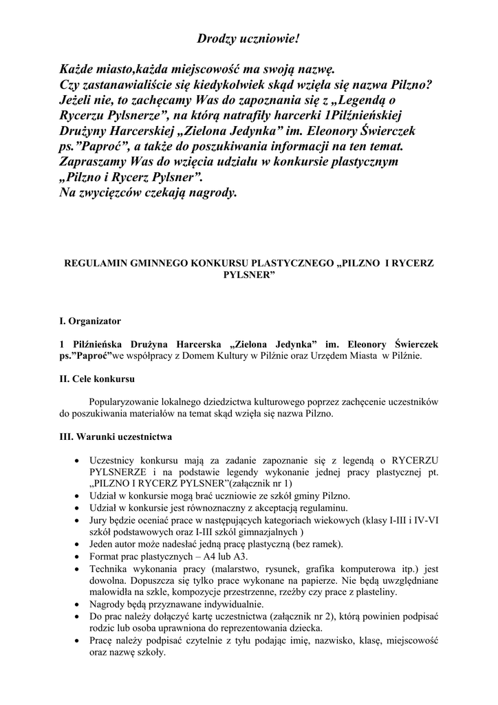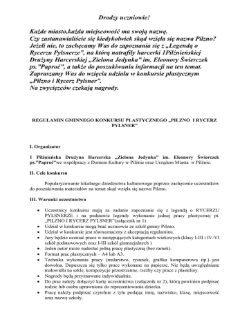 Drodzy uczniowie! Każde miasto,każda miejscowość ma swoją nazwę. Czy zastanawialiście się kiedykolwiek skąd wzięła się nazwa Pilzno? Jeżeli nie, to zachęcamy Was do zapoznania się z „Legendą o Rycerzu Pylsnerze”, na którą natrafiły harcerki 1Pilźnieńskiej Drużyny Harcerskiej „Zielona Jedynka” im. Eleonory Świerczek ps.”Paproć”, a także do poszukiwania informacji na ten temat. Zapraszamy Was do wzięcia udziału w konkursie plastycznym „Pilzno i Rycerz Pylsner”. Na zwycięzców czekają nagrody. REGULAMIN GMINNEGO KONKURSU PLASTYCZNEGO „PILZNO I RYCERZ PYLSNER” I. Organizator 1 Pilźnieńska Drużyna Harcerska „Zielona Jedynka” im. Eleonory Świerczek ps.”Paproć”we współpracy z Domem Kultury w Pilźnie oraz Urzędem Miasta w Pilźnie. II. Cele konkursu Popularyzowanie lokalnego dziedzictwa kulturowego poprzez zachęcenie uczestników do poszukiwania materiałów na temat skąd wzięła się nazwa Pilzno. III. Warunki uczestnictwa Uczestnicy konkursu mają za zadanie zapoznanie się z legendą o RYCERZU PYLSNERZE i na podstawie legendy wykonanie jednej pracy plastycznej pt. „PILZNO I RYCERZ PYLSNER”(załącznik nr 1) Udział w konkursie mogą brać uczniowie ze szkół gminy Pilzno. Udział w konkursie jest równoznaczny z akceptacją regulaminu. Jury będzie oceniać prace w następujących kategoriach wiekowych (klasy I-III i IV-VI szkół podstawowych oraz I-III szkól gimnazjalnych ) Jeden autor może nadesłać jedną pracę plastyczną (bez ramek). Format prac plastycznych – A4 lub A3. Technika wykonania pracy (malarstwo, rysunek, grafika komputerowa itp.) jest dowolna. Dopuszcza się tylko prace wykonane na papierze. Nie będą uwzględniane malowidła na szkle, kompozycje przestrzenne, rzeźby czy prace z plasteliny. Nagrody będą przyznawane indywidualnie. Do prac należy dołączyć kartę uczestnictwa (załącznik nr 2), którą powinien podpisać rodzic lub osoba uprawniona do reprezentowania dziecka. Pracę należy podpisać czytelnie z tyłu podając imię, nazwisko, klasę, miejscowość oraz nazwę szkoły. IV. Kontakt Osoba do kontaktu – w przypadku pytań odnośnie konkursu Maria Smoła-Wójcik tel.724 310 494 V. Termin i miejsce nadsyłania prac Prace należy przesłać lub dostarczyć osobiście do 29 kwietnia 2016 roku, na poniższy adres (z dopiskiem KONKURS PLASTYCZNY „PILZNO I RYCERZ PYLSNER”) Dom Kultury w Pilźnie ul. Węgierska 30 39-220 Pilzno VII. Rozstrzygnięcie konkursu Jury wybierze najciekawsze prace indywidualne w każdej kategorii wiekowej, ilustrujące najlepiej legendę o rycerzu Pylsnerze. Spośród nich wybrane zostaną po trzy najlepsze prace z każdej kategorii wiekowej. Jury dopuszcza możliwość przyznania dodatkowych nagród. VIII. Ogłoszenie wyników konkursu Dnia 6 maja 2016r. nastąpi rozstrzygniecie konkursu, a laureaci zostaną poinformowani o przyznaniu nagród. IX. Publikacja prac Wybrane przez jury prace umieszczone zostaną na wystawie, którą będzie można obejrzeć w Domu Kultury w Pilźnie w dniach od 11 do 31 maja 2016 roku. Prace mogą być wykorzystane w ramach promocji działań organizatora konkursu. X. Uwagi dodatkowe • • • • Prace niezgodne z regulaminem nie będą brane pod uwagę. Rozstrzygnięcie jury jest ostateczne (od werdyktu nie przysługuje odwołanie). Osoby nagrodzone i wyróżnione zostaną powiadomione o odbiorze nagród. Wszelkie sprawy nie uwzględnione w regulaminie rozstrzyga 1Pilźnieńska Drużyna Harcerska „Zielona Jedynka” im. Eleonory Świerczek ps.”Paproć”. Załącznik nr 1 „LEGENDA O RYCERZU PYLSNERZE” Dawno, dawno temu kiedy Wiślanie rządzili nad Wisłą, przez wiele krain i plemion w poszukiwaniu przygód wędrował rycerz Pylsner. Pochodził on z kraju świętego Wojciecha, jego herbem była srebrna lilia na błękitnej tarczy. Dzielny był to mąż, niesłychanej odwagi, szlachetny, sprawiedliwy i oddany Bogu. Ze swoimi wiernymi wojami brał udział w wielu potyczkach i wyprawach wojennych w poszukiwaniu chwały. Pewnego razu rycerze jechali na swych wspaniałych wierzchowcach,a droga ich wiodła Bursztynowym Szlakiem prowadzącym z Węgier nad Bałtyk. Znużeni podróżą zatrzymali się na popas, nad rwącą rzeką, nieopodal niewielkiej osady. Było to wspaniałe miejsce, piękne kwiaty kolorowały pola i łąki, liście drzew szumiały na wietrze, a w ich koronach słychać było śpiew ptaków. Wysoko na niebie mocno świeciło słońce. Zmęczeni upałem i srodze spragnieni wędrowcy zaczerpnęli wody z tutejszej rzeki. Po pierwszym łyku zgodnie zakrzyknęli „aquae dulcis”- jaka smaczna jest ta woda. Postanowili w tym pięknym otoczeniu zostać na nocleg. Położywszy się przy ognisku, twardo zasnęli. Nagle w oddali, wśród cichej, czarnej nocy wzniosła się łuna pożaru i straszliwe krzyki targnęły powietrzem. To rabusie napadli na pobliską osadę, palili i grabili. Przebudzeni rycerze zerwawszy się na równe nogi, skoczyli na ratunek. Przegonili zbójców i wraz z osadnikami ugasili pożar. Następnego dnia zebrał się wiec, na którym mieszkańcy podziękowali rycerzom za pomoc oraz powszechnie zgodzili się na to, ażeby oddać się pod opiekę Pylsnera i jego wojów. Rycerz postanowił przebudować osadę na gród i otoczyć go wałami dla lepszej obrony. Gród nazwano Pylsno - obecnie miasto Pilzno, a rzękę nad którą zatrzymali się rycerze Dulcis, obecnie - Dulcza. Załącznik nr 2 Karta uczestnika w konkursie plastycznym „Pilzno i Rycerz Pylsner” Imię i nazwisko autora: . . . . . . . . . . . . . . . . . . . . . . . . . . . . . . . . . . . . . . . . . . . . . . . . . . . . . . . ........................................................................... Klasa: . . . . . . . . . Adres zamieszkania: . . . . . . . . . . . . . . . . . . . . . . . . . . . . . . . . . . . . . . . . . . . . . . . . . . . . . . . . . ............................................................