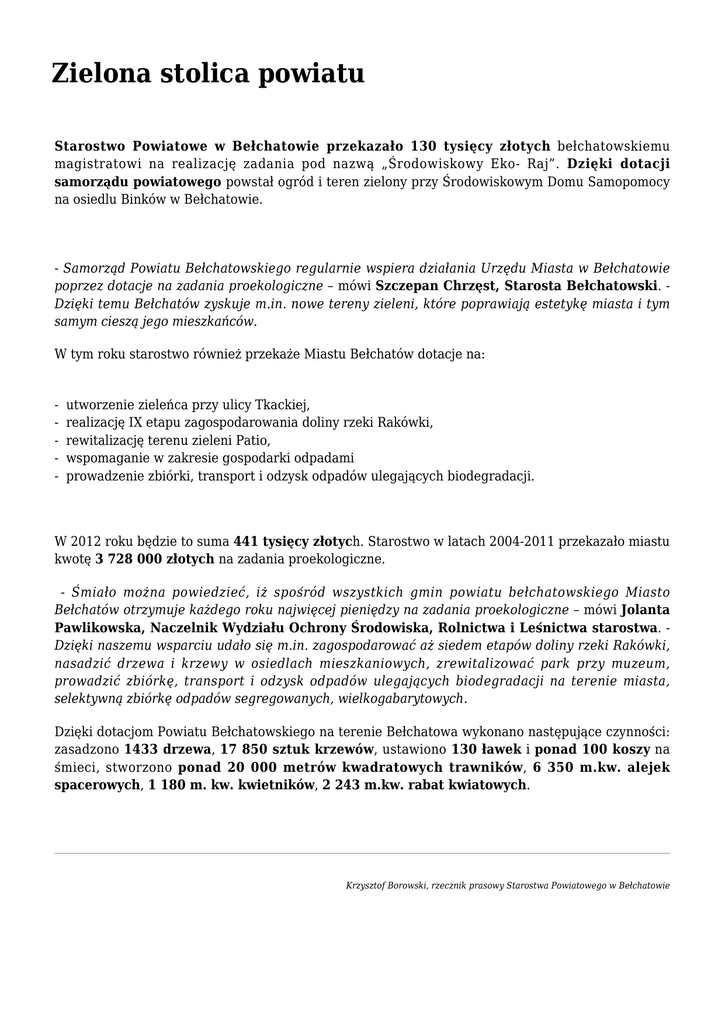 Zielona stolica powiatu Starostwo Powiatowe w Bełchatowie przekazało 130 tysięcy złotych bełchatowskiemu magistratowi na realizację zadania pod nazwą „Środowiskowy Eko- Raj”. Dzięki dotacji samorządu powiatowego powstał ogród i teren zielony przy Środowiskowym Domu Samopomocy na osiedlu Binków w Bełchatowie. - Samorząd Powiatu Bełchatowskiego regularnie wspiera działania Urzędu Miasta w Bełchatowie poprzez dotacje na zadania proekologiczne – mówi Szczepan Chrzęst, Starosta Bełchatowski. Dzięki temu Bełchatów zyskuje m.in. nowe tereny zieleni, które poprawiają estetykę miasta i tym samym cieszą jego mieszkańców. W tym roku starostwo również przekaże Miastu Bełchatów dotacje na: - utworzenie zieleńca przy ulicy Tkackiej, realizację IX etapu zagospodarowania doliny rzeki Rakówki, rewitalizację terenu zieleni Patio, wspomaganie w zakresie gospodarki odpadami prowadzenie zbiórki, transport i odzysk odpadów ulegających biodegradacji. W 2012 roku będzie to suma 441 tysięcy złotych. Starostwo w latach 2004-2011 przekazało miastu kwotę 3 728 000 złotych na zadania proekologiczne. - Śmiało można powiedzieć, iż spośród wszystkich gmin powiatu bełchatowskiego Miasto Bełchatów otrzymuje każdego roku najwięcej pieniędzy na zadania proekologiczne – mówi Jolanta Pawlikowska, Naczelnik Wydziału Ochrony Środowiska, Rolnictwa i Leśnictwa starostwa. Dzięki naszemu wsparciu udało się m.in. zagospodarować aż siedem etapów doliny rzeki Rakówki, nasadzić drzewa i krzewy w osiedlach mieszkaniowych, zrewitalizować park przy muzeum, prowadzić zbiórkę, transport i odzysk odpadów ulegających biodegradacji na terenie miasta, selektywną zbiórkę odpadów segregowanych, wielkogabarytowych. Dzięki dotacjom Powiatu Bełchatowskiego na terenie Bełchatowa wykonano następujące czynności: zasadzono 1433 drzewa, 17 850 sztuk krzewów, ustawiono 130 ławek i ponad 100 koszy na śmieci, stworzono ponad 20 000 metrów kwadratowych trawników, 6 350 m.kw. alejek spacerowych, 1 180 m. kw. kwietników, 2 243 m.kw. rabat kwiatowych. Krzysztof Borowski, rzecznik prasowy Starostwa Powiatowego w Bełchatowie