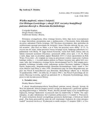 Bp Andrzej F. Dziuba Łowicz, dnia 19 września 2013 roku L.dz. 2146 /2013 Wielka mądrość, wiara i świętość. List Biskupa Łowickiego z okazji XXV rocznicy beatyfikacji patrona diecezji o. Honorata Koźmińskiego Czcigodni Kapłani, Drogie Siostry Zakonne, Umiłowani Siostry i Bracia, Dzisiejszy ewangeliczny obraz winnego krzewu, który daje życie wszczepionym w niego latoroślom, przypomina nam o zjednoczeniu z Chrystusem, które dokonało się przez sakrament Chrztu świętego. Od Chrystusa otrzymujemy dary potrzebne do zrealizowania naszego powołania do świętości. Jezus Chrystus mówiąc do nas, swoich uczniów: „Kto trwa we Mnie, a ja w Nim, ten przynosi owoc obfity” (J 15, 5), wzywa nas do wiary, która przynosi owoce świętego życia, będącego pokornym wypełnieniem woli Bożej. W ciągu historii Kościoła, wielu było ludzi, którzy stali się takimi wiernymi uczniami Chrystusa i przynosili obfity owoc (por. J 15, 8). Pisze o nich, dając nam za przykład, papież Benedykt XVI w Liście apostolskim na Rok Wiary Porta fidei: „Ze względu na wiarę na przestrzeni wieków mężczyźni i kobiety każdego wieku, (…) wyznali piękno pójścia za Panem Jezusem tam, gdzie byli wzywani, żeby dać świadectwo swojego bycia chrześcijanami”(nr13). Dziś pragnę przypomnieć wybitnego świadka wiary, pokornego ucznia Chrystusa, kapłana z Zakonu Ojców Kapucynów, błogosławionego Honorata Koźmińskiego, który zmarł w Nowym Mieście nad Pilicą w roku 1916. Dwadzieścia pięć lat temu błogosławiony papież Jan Paweł II beatyfikował ojca Honorata. Beatyfikacja odbyła się w Rzymie 16 października 1988 r. Za kilka lat, 25 marca 1992 r. Jan Paweł II powołując do istnienia Diecezję Łowicką, ogłosił jej patronem bł. o. Honorata Koźmińskiego, który przez to stał się nam jeszcze bliższy. 1. Świadek wiary Drodzy Bracia i Siostry! Z okazji dwudziestopięciolecia beatyfikacji patrona naszej diecezji, kieruję do Was list pasterski, którym pragnę zwrócić uwagę na duchowość i gorliwość apostolską błogosławionego o. Honorata. Warto, abyśmy poznali lepiej życie świątobliwego kapucyna, którego Opatrzność wyznaczyła nam na orędownika w Niebie. Nie zapominajmy, że jako młodzieniec był więźniem politycznym w Cytadeli w Warszawie. W czasie uwięzienia doznał szczególnego przeżycia duchowego, o którym po latach pisał: „Pan Jezus przyszedł do mnie do celi więziennej i łaskawie do wiary przyprowadził” (notatnik duchowy). Wydarzenie to miało miejsce 15 sierpnia 1846 r. w Uro- Bp Andrzej F. Dziuba 58 czystość Wniebowzięcia Najświętszej Maryi Panny. Od tego momentu Jezus Chrystus był dla naszego Błogosławionego wszystkim. Wiara stała się siłą jego życia. Nie zniechęcały go działania, jakie rząd carski kierował przeciw Kościołowi. Jego posługa zakonna i kapłańska została przez zaborcę ograniczona do murów klasztoru. Ojciec Honorat nie mógł prowadzić pracy apostolskiej wśród ludzi na zewnątrz klasztoru, ale wiele modlił się, sprawował Eucharystię oraz dużo czasu poświęcał na spowiedź. Do jego konfesjonału garnęli się młodzi z różnych stron dawnej Rzeczpospolitej. Dzięki ich wyznaniom widział świat i poznawał problemy duchowe i ekonomiczne zniewolonego narodu polskiego. 2. Wezwany do specjalnej misji Błogosławiony Honorat zjednoczony z Bogiem duchowo był bliski uciemiężonym rodakom. Głęboko przeżywał ich problemy społeczne. Bliski mu był lud wiejski po uwłaszczeniu. Martwił się o zachowanie jego wiary, tożsamości i niezależności ekonomicznej. Poznawał problemy świata robotniczego, zwłaszcza kobiet uciemiężonych i wykorzystywanych. Troszczył się, aby robotnicy w powstających fabrykach mieli godne warunki pracy. Zabiegał, by w rzemiośle były przestrzegane zasady moralności i religii chrześcijańskiej. Zatroskany był o szkolnictwo. Zależało mu, aby dzieci i młodzież mogły być kształcone i wychowywane w duchu chrześcijańskim. Nie zapominał o trudnej sytuacji wiejskich dziewcząt, które pracowały jako służące. Dostrzegał też zagrożenia dla rodziny chrześcijańskiej. Zależało mu, aby wszystkie te grupy otoczone były troską apostolską. W drugiej połowie XIX wieku o. Honorat myślał o ludziach ograniczonych bezwzględną polityką zaborców, nierównością społeczną i niesprawiedliwością. Miłość do uciemiężonej Ojczyzny mobilizowała go, aby szukać środków zaradczych. Przez posługę konfesjonału formował chłopców i dziewczęta. Kierował ich do zakładanych przez siebie wspólnot religijnych pomagających w znalezieniu pracy zawodowej i miejsca zamieszkania. Tę działalność traktował jako niesienie pomocy w duchu wiary. Zalecał organizowanie środowisk, w których rodacy mogliby poczuć się razem we wspólnocie. Chodziło mu o kształtowanie wspólnot opartych na Ewangelii, w których osoba ludzka mogłaby się rozwijać i dojrzewać w wolności i dobru. 3. Błogosławione owoce Miłość apostolska bł. Honorata objawiała się w konkretnych formach. Jego penitenci i penitentki, młodzi heroiczni ludzie, zapaleni duchem Chrystusowej wiary i miłości udawali się do środowisk, które wskazywał im spowiednik. Pan Bóg pobłogosławił trudom swego wiernego sługi. Powstawały liczne środowiska. Tysiące ludzi: sierot, chorych, opuszczonych, zaniedbanych, upadłych, zagubionych, wydziedziczonych odnalazło się w środowiskach rodzinnych, we wsiach i miastach otoczonych opieką przez honorackie zgromadzenia. To nie były instytuty dobroczynne czy opiekuńcze, to były środowiska. To dzieło było silne obecnością dobra świadczonego bezinteresownie, w duchu ewangelicznej miłości. Siostry ze zgromadzeń honorackich zakładały pierwsze szkoły o profilu zawodowym, by przygotować młodych ludzi do życia. Opiekowały się młodzieżą zagubioną. Organizowały warsztaty rzemieślnicze, domy opieki d