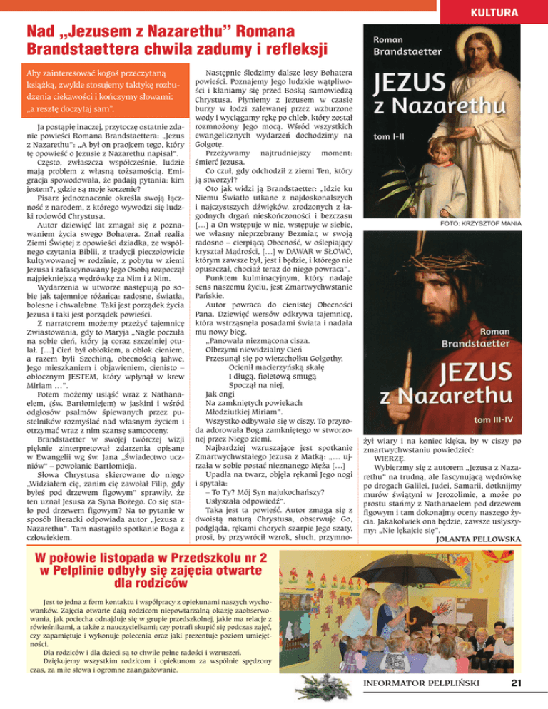 KULTURA Nad „Jezusem z Nazarethu” Romana Brandstaettera chwila zadumy i refleksji Aby zainteresować kogoś przeczytaną książką, zwykle stosujemy taktykę rozbudzenia ciekawości i kończymy słowami: „a resztę doczytaj sam”. Ja postąpię inaczej, przytoczę ostatnie zdanie powieści Romana Brandstaettera: „Jezus z Nazarethu”: „A był on praojcem tego, który tę opowieść o Jezusie z Nazarethu napisał”. Często, zwłaszcza współcześnie, ludzie mają problem z własną tożsamością. Emigracja spowodowała, że padają pytania: kim jestem?, gdzie są moje korzenie? Pisarz jednoznacznie określa swoją łączność z narodem, z którego wywodzi się ludzki rodowód Chrystusa. Autor dziewięć lat zmagał się z poznawaniem życia swego Bohatera. Znał realia Ziemi Œwiętej z opowieści dziadka, ze wspólnego czytania Biblii, z tradycji pieczołowicie kultywowanej w rodzinie, z pobytu w ziemi Jezusa i zafascynowany Jego Osobą rozpoczął najpiękniejszą wędrówkę za Nim i z Nim. Wydarzenia w utworze następują po sobie jak tajemnice różańca: radosne, światła, bolesne i chwalebne. Taki jest porządek życia Jezusa i taki jest porządek powieści. Z narratorem możemy przeżyć tajemnicę Zwiastowania, gdy to Maryja „Nagle poczuła na sobie cień, który ją coraz szczelniej otulał. […] Cień był obłokiem, a obłok cieniem, a razem byli Szechiną, obecnością Jahwe, Jego mieszkaniem i objawieniem, cienisto – obłocznym JESTEM, który wpłynął w krew Miriam …”. Potem możemy usiąść wraz z Nathanaelem, (św. Bartłomiejem) w jaskini i wśród odgłosów psalmów śpiewanych przez pustelników rozmyślać nad własnym życiem i otrzymać wraz z nim szansę samooceny. Brandstaetter w swojej twórczej wizji pięknie zinterpretował zdarzenia opisane w Ewangelii wg św. Jana „Œwiadectwo uczniów” – powołanie Bartłomieja. Słowa Chrystusa skierowane do niego „Widziałem cię, zanim cię zawołał Filip, gdy byłeś pod drzewem figowym” sprawiły, że ten uznał Jesusa za Syna Bożego. Co się stało pod drzewem figowym? Na to pytanie w sposób literacki odpowiada autor „Jezusa z Nazarethu”. Tam nastąpiło spotkanie Boga z człowiekiem. Następnie śledzimy dalsze losy Bohatera powieści. Poznajemy Jego ludzkie wątpliwości i kłaniamy się przed Boską samowiedzą Chrystusa. Płyniemy z Jezusem w czasie burzy w łodzi zalewanej przez wzburzone wody i wyciągamy rękę po chleb, który został rozmnożony Jego mocą. Wśród wszystkich ewangelicznych wydarzeń dochodzimy na Golgotę. Przeżywamy najtrudniejszy moment: śmierć Jezusa. Co czuł, gdy odchodził z ziemi Ten, który ją stworzył? Oto jak widzi ją Brandstaetter: „Idzie ku Niemu Œwiatło utkane z najdoskonalszych i najczystszych dźwięków, zrodzonych z łagodnych drgań nieskończoności i bezczasu […] a On wstępuje w nie, wstępuje w siebie, we własny nieprzebrany Bezmiar, w swoją radosno – cierpiącą Obecność, w oślepiający kryształ Mądrości, […] w DAWAR w SŁOWO, którym zawsze był, jest i będzie, i którego nie opuszczał, chociaż teraz do niego powraca”. Punktem kulminacyjnym, który nadaje sens naszemu życiu, jest Zmartwychwstanie Pańskie. Autor powraca do cienistej Obecności Pana. Dziewięć wersów odkrywa tajemnicę, która wstrząsnęła posadami świata i nadała mu nowy bieg. „Panowała niezmącona cisza. Olbrzymi niewidzialny Cień Przesunął się po wierzchołku Golgothy, Ocienił macierzyńską skałę I długą, fioletową smugą Spoczął na niej, Jak ongi Na zamkniętych powiekach Młodziutkiej Miriam”. Wszystko odbywało się w ciszy. To przyroda adorowała Boga zamkniętego w stworzonej przez Niego ziemi. Najbardziej wzruszające jest spotkanie Zmartwychwstałego Jezusa z Matką: „… ujrzała w sobie postać nieznanego Męża […] Upadła na twarz, objęła rękami Jego nogi i spytała: – To Ty? Mój Syn najukochańszy? Usłyszała odpowiedź”. Taka jest ta powieść. Autor zmaga się z dwoistą naturą Chrystusa, obserwuje Go, podgląda, rękami chorych szarpie Jego szaty, prosi, by przywrócił wzrok, słuch, przymno- FOTO: KRZYSZTOF MANIA żył wiary i na koniec klęka, by w ciszy po zmartwychwstaniu powiedzieć: WIERZÐ. Wybierzmy się z autorem „Jezusa z Nazarethu” na trudną, ale fascynującą wędrówkę po drogach Galilei, Judei, Samarii, dotknijmy murów świątyni w Jerozolimie, a może po prostu stańmy z Nathanaelem pod drzewem figowym i tam dokonajmy oceny naszego życia. Jakakolwiek ona będzie, zawsze usłyszymy: „Nie lękajcie się”. JOLANTA PELLOWSKA W połowie listopada w Przedszkolu nr 2 w Pelplinie odbyły się zajęcia otwarte dla rodziców Jest to jedna z form kontaktu i współpracy z opiekunami naszych wychowanków. Zajęcia otwarte dają rodzicom niepowtarzalną okazję zaobserwowania, jak pociecha odnajduje się w grupie przedszkolnej, jakie ma relacje z rówieśnikami, a także z nauczycielkami; czy potrafi skupić się podczas zajęć, czy zapamiętuje i wykonuje polecenia oraz jaki prezentuje poziom umiejętności. Dla rodziców i dla dzieci są to chwile pełne radości i wzruszeń. Dziękujemy wszystkim rodzicom i opiekunom za wspólnie spędzony czas, za miłe słowa i ogromne zaangażowanie. INFORMATOR PELPLIÑSKI 21