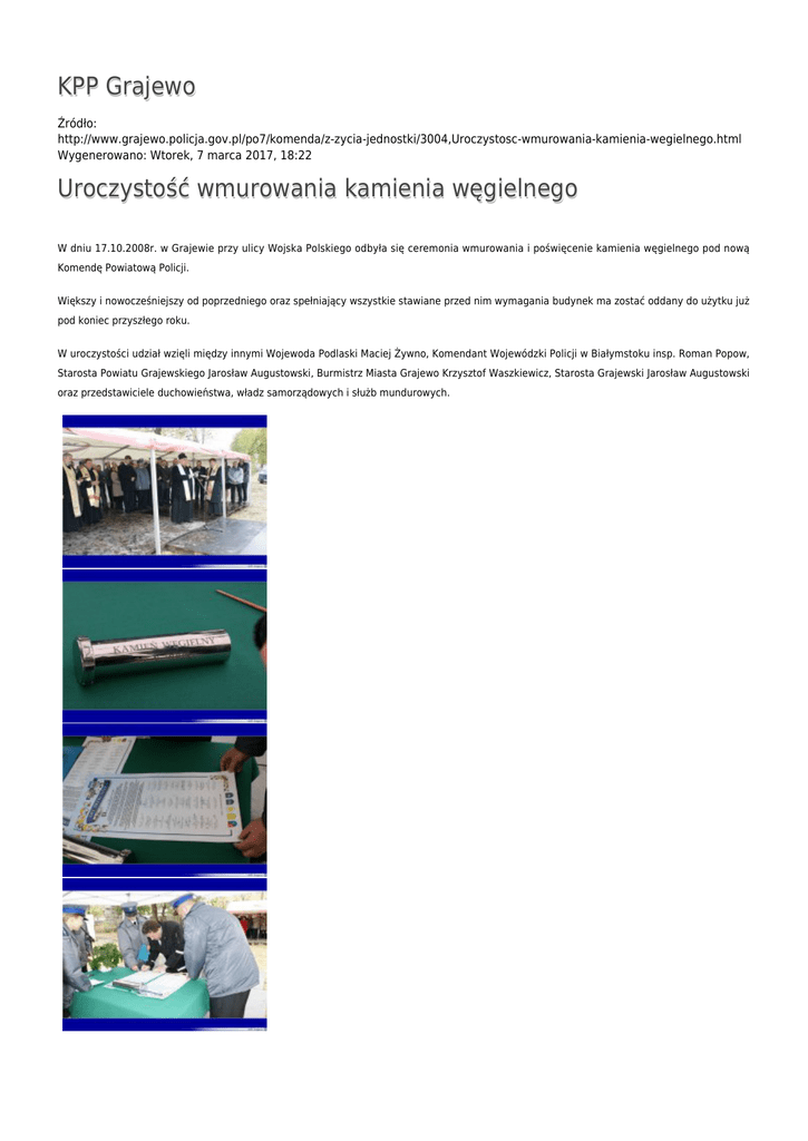 KPP Grajewo Źródło: http://www.grajewo.policja.gov.pl/po7/komenda/z-zycia-jednostki/3004,Uroczystosc-wmurowania-kamienia-wegielnego.html Wygenerowano: Wtorek, 7 marca 2017, 18:22 Uroczystość wmurowania kamienia węgielnego W dniu 17.10.2008r. w Grajewie przy ulicy Wojska Polskiego odbyła się ceremonia wmurowania i poświęcenie kamienia węgielnego pod nową Komendę Powiatową Policji. Większy i nowocześniejszy od poprzedniego oraz spełniający wszystkie stawiane przed nim wymagania budynek ma zostać oddany do użytku już pod koniec przyszłego roku. W uroczystości udział wzięli między innymi Wojewoda Podlaski Maciej Żywno, Komendant Wojewódzki Policji w Białymstoku insp. Roman Popow, Starosta Powiatu Grajewskiego Jarosław Augustowski, Burmistrz Miasta Grajewo Krzysztof Waszkiewicz, Starosta Grajewski Jarosław Augustowski oraz przedstawiciele duchowieństwa, władz samorządowych i służb mundurowych. Ocena: 0/5 (0) Tweetnij