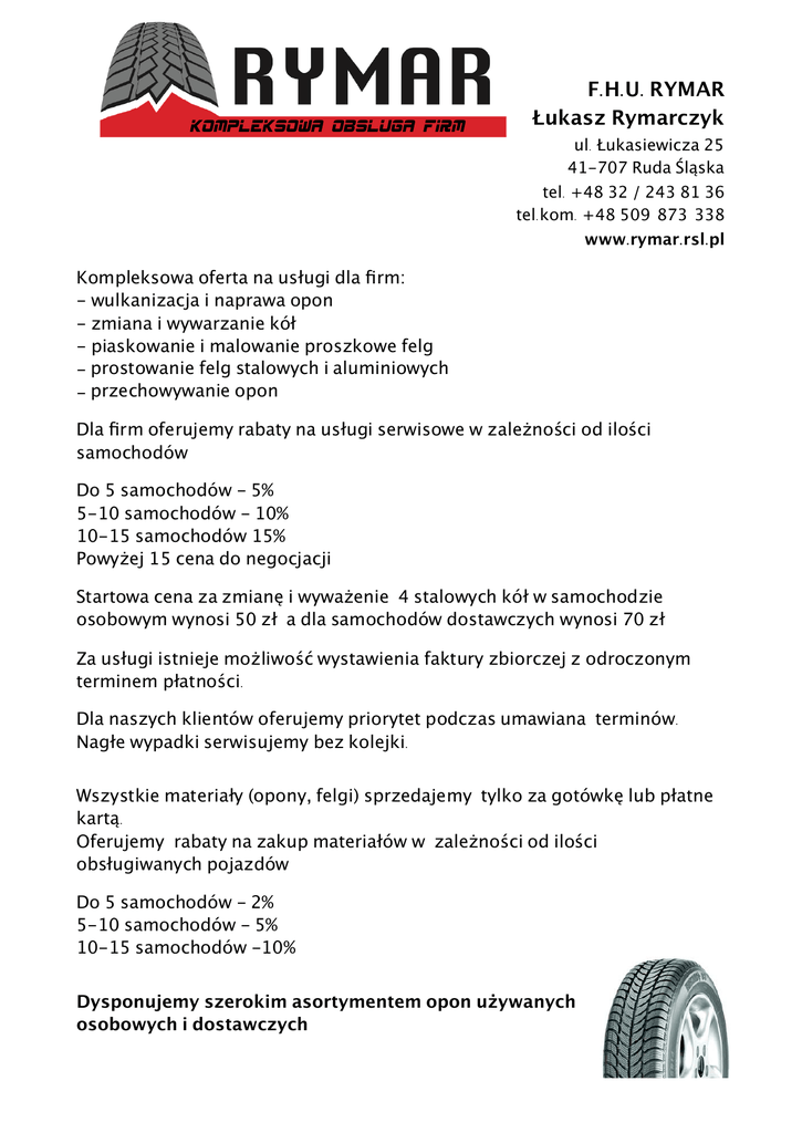 Kompleksowa obsluga firm F.H.U. RYMAR Łukasz Rymarczyk ul. Łukasiewicza 25 41-707 Ruda Śląska tel. +48 32 / 243 81 36 tel.kom. +48 509 873 338 www.rymar.rsl.pl Kompleksowa oferta na usługi dla firm: - wulkanizacja i naprawa opon - zmiana i wywarzanie kół - piaskowanie i malowanie proszkowe felg - prostowanie felg stalowych i aluminiowych - przechowywanie opon Dla firm oferujemy rabaty na usługi serwisowe w zależności od ilości samochodów Do 5 samochodów - 5% 5-10 samochodów - 10% 10-15 samochodów 15% Powyżej 15 cena do negocjacji Startowa cena za zmianę i wyważenie 4 stalowych kół w samochodzie osobowym wynosi 50 zł a dla samochodów dostawczych wynosi 70 zł Za usługi istnieje możliwość wystawienia faktury zbiorczej z odroczonym terminem płatności. Dla naszych klientów oferujemy priorytet podczas umawiana terminów. Nagłe wypadki serwisujemy bez kolejki. Wszystkie materiały (opony, felgi) sprzedajemy tylko za gotówkę lub płatne kartą. Oferujemy rabaty na zakup materiałów w zależności od ilości obsługiwanych pojazdów Do 5 samochodów - 2% 5-10 samochodów - 5% 10-15 samochodów -10% Dysponujemy szerokim asortymentem opon używanych osobowych i dostawczych Przykładowe ceny i rozmiary opon nowych dla najpopularniejszych samochodów ROZMIAR 145/70/ R13 155/80/ R13 165/70/ R14 185/65/ R15 195/65/ R15 205/55/ R16 PRZYKŁADOWE SAMOCHODY Fiat Seicento Fiat Panda Fiat Punto Skoda Fabia Astra, Focus VW Golf, Skoda Octavia VW Passat Opel Vectra Dębica 135 zł Fulda 162 zł Dayton 185 zł Dębica 220 zł Dębica 225 zł Dayton 335 zł Dębica 167 zł Dębica 190 zł Hankook 220 zł Hankook 235 zł Firestone 390 zł Firestone 245 zł Firestone 245 zł Powyższe ceny mogą ulec zmianie w zależności od cen producenta lub okresowych promocji. Podane ceny są cenami brutto. Wszelkie zapytania prosimy kierować telefonicznie lub osobiście.