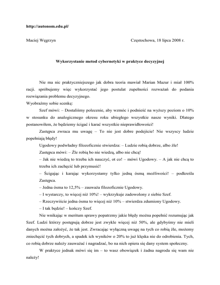 http://autonom.edu.pl/ Maciej Węgrzyn Częstochowa, 18 lipca 2008 r. Wykorzystanie metod cybernetyki w praktyce decyzyjnej Nie ma nic praktyczniejszego jak dobra teoria mawiał Marian Mazur i miał 100% racji. spróbujemy więc wykorzystać jego postulat zupełności rozważań do podania rozwiązania problemu decyzyjnego. Wyobraźmy sobie scenkę: Szef mówi: – Dostaliśmy polecenie, aby wzmóc i podnieść na wyższy poziom o 10% w stosunku do analogicznego okresu roku ubiegłego wszystkie nasze wyniki. Dlatego postanowiłem, że będziemy ścigać i karać wszystkie nieprawidłowości! Zastępca zwraca mu uwagę – To nie jest dobre podejście! Nie wszyscy ludzie popełniają błędy! Ugodowy podwładny filozoficznie stwierdza: – Ludzie robią dobrze, albo źle! Zastępca mówi: – Źle robią bo nie wiedzą, albo nie chcą! – Jak nie wiedzą to trzeba ich nauczyć, ot co! – mówi Ugodowy. – A jak nie chcą to trzeba ich zachęcić lub przymusić! – Ścigając i karając wykorzystamy tylko jedną ósmą możliwości! – podkreśla Zastępca. – Jedna ósma to 12,5% – zauważa filozoficznie Ugodowy. – I wystarczy, to więcej niż 10%! – wykrzykuje zadowolony z siebie Szef. – Rzeczywiście jedna ósma to więcej niż 10% – stwierdza zdumiony Ugodowy. – I tak będzie! – kończy Szef. Nie wnikając w meritum sprawy popatrzmy jakie błędy można popełnić rozumując jak Szef. Ludzi którzy postępują dobrze jest zwykle więcej niż 50%, ale gdybyśmy nie mieli danych można założyć, że tak jest. Zwracając wyłączną uwagę na tych co robią źle, możemy zniechęcić tych dobrych, a spadek ich wyników o 20% to już klęska nie do odrobienia. Tych, co robią dobrze należy zauważać i nagradzać, bo na nich opiera się dany system społeczny. W praktyce jednak mówi się im – to wasz obowiązek i żadna nagroda się wam nie należy! Przyjmując, że w wieku produkcyjnym są egzostatycy, statycy i endostatycy, ten argument dociera tylko do statyków, dla których cnota jest wartością samą w sobie. Egzostatycy chcą być chwaleni za dotrzymywanie warunków umowy, endostatycy chcą mieć premię za to samo. Z tych, co robią źle więcej jak 50% robi to z nieświadomości, chyba, że chodzi o jakiś ruch nieposłuszeństwa społecznego. Przyjmując jednak, że z braku danych nie możemy tego oszacować, to 25% ludzi działających błędnie z nieświadomości, to bardzo dużo niewykorzystanego potencjału społecznego. Nauczanie jest niezwykle ważnym czynnikiem, niestety zupełnie lekceważonym na co dzień. Wyjątkiem są sekty, rozwijające się właśnie dzięki wszechobecnemu nauczaniu i korygowaniu niewłaściwego postępowania. Nauczaniem można skorygować dużo więcej, niż innymi środkami! Tych, co wiedzą i robią źle można zachęcić lub przymusić, też z jednakowym prawdopodobieństwem. Zachęcanie daje jednak większy przyrost prawidłowych zachowań z uwagi na to, że przymus nie na wszystkich działa jednakowo – egzostatycy będą krnąbrni dla popisu, endostatycy będą knuć podstępy, żeby nie dać się przyłapać, więc tylko jedna trzecia takich rygorystycznych działań, czyli 4,23% będzie skuteczna. Czyli nasz Szef ze scenki wcale nie miał racji ciesząc się z prostego sposobu na polepszenie wyników. Niestety, Szefowie to na ogół endostatycy, przywiązani do swoich zasad postępowania, a że gromadzą moc socjologiczną i nikt im się nie chce sprzeciwiać, więc bizantyński rygoryzm święci triumfy pomimo żenująco niskiej skuteczności. Zmiana metody musi oznaczać zmianę Szefa – tak postępują adepci sekt, w których są akceptowani ze wszystkimi swoimi wadami. Chrześcijaństwo pierwszych wieków też się tak właśnie rozwijało: przez utwierdzanie sprawiedliwych, nauczanie grzeszników, aby ich z błędów wyprowadzić i przez zachęcanie do zmiany pogańskich obyczajów. Kary były wyjątkiem, bo skruszonemu grzesznikowi należy się przebaczenie. Podobne metody socjotechniczne można zastosować do każdej sytuacji, dobierając sposoby oddziaływania indywidualnie do każdego przypadku charakterologicznego. Tyle, że trzeba wiedzieć, z kim się ma do czynienia, bo nie ma Człowieka Uśrednionego – są indywidualne okazy Homo Sapiens. Ze zwykłego lenistwa jednak, zasłaniając się argumentami o równości powinności, nie przeprowadza się badań diagnostycznych, traktując wszystkich poddanych władzy w sposób jednakowy.