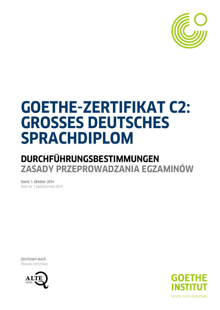 GOETHE-ZERTIFIKAT C2: GROSSES DEUTSCHES SPRACHDIPLOM DURCHFÜHRUNGSBESTIMMUNGEN ZASADY PRZEPROWADZANIA EGZAMINÓW Stand: 1. Oktober 2014 Stan na: 1 października 2014 Zertifiziert durch Posiada certyfikat GOETHE-ZERTIFIKAT C2: GROSSES DEUTSCHES SPRACHDIPLOM Durchführungsbestimmungen ZASADY PRZEPROWADZANIA EGZAMINÓW Durchführungsbestimmungen zur Prüfung GOETHE-ZERTIFIKAT C2: GROSSES DEUTSCHES SPRACHDIPLOM Zasady Przeprowadzania Egzaminów Goethe-Zertifikat C2: Grosses Deutsches Sprachdiplom Stand: 1. Oktober 2014 Stan na dz. 1 października 2014 Die Durchführungsbestimmungen zur Prüfung GOETHEZERTIFIKAT C2: GDS sind Bestandteil der Prüfungsordnung des Goethe-Instituts in ihrer jeweils aktuellen Fassung. Zasady Przeprowadzania Egzaminów Goethe-Zertifikat C2: GDS stanowią część Regulaminu Egzaminów Goethe-Institut w jego aktualnym brzmieniu. Das GOETHE-ZERTIFIKAT C2: GDS wurde vom GoetheInstitut e.V. entwickelt. Die Prüfung wird an den in § 2 der Prüfungsordnung genannten Prüfungszentren weltweit nach einheitlichen Kriterien durchgeführt und bewertet. Die literaturgebundenen Aufgaben im Modul SCHREIBEN werden in Zusammenarbeit mit der Ludwig-MaximiliansUniversität München erstellt und bewertet. Egzamin Goethe-Zertifikat C2: GDS został stworzony przez Goethe-Institut e.V. Egzamin przeprowadzany i oceniany jest na całym świecie według jednolitych kryteriów w centrach egzaminacyjnych, o których mowa w § 2 Regulaminu Egzaminów. Zadania odnoszące się do lektur w części PISANIE tworzone i oceniane są we współpracy z Uniwersytetem Ludwika Maximiliana w Monachium. Die Prüfung dokumentiert die sechste Stufe – C2 – der im Gemeinsamen europäischen Referenzrahmen für Sprachen (GER) beschriebenen sechsstufigen Kompetenzskala und damit die Fähigkeit zur kompetenten Sprachverwendung. Egzamin ten poświadcza osiągnięcie szóstego poziomu – C2 – w sześciostopniowej skali oceny kompetencji Europejskiego Systemu Opisu Kształcenia Językowego, a tym samym umiejętność porozumiewania się na poziomie biegłości. §1 Prüfungsbeschreibung §1 Opis egzaminu § 1.1 Bestandteile der Prüfung § 1.1 Części egzaminu 2 / 11 Die Prüfung GOETHE-ZERTIFIKAT C2: GDS besteht aus vier Modulen, die einzeln oder in Kombination abgelegt werden können: drei schriftliche Module als Gruppenprüfung: LESEN, HÖREN, SCHREIBEN, ein mündliches Modul als Einzelprüfung: SPRECHEN. Egzamin Goethe-Zertifikat C2: GDS składa się z czterech modułów, które można zdawać pojedynczo lub w zestawieniu ze sobą: trzy pisemne moduły jako egzamin grupowy CZYTANIE, SŁUCHANIE i PISANIE, moduł ustny jako egzamin przeprowadzany indywidualnie: MÓWIENIE. § 1.2 § 1.2 Prüfungsmaterialien Materiały egzaminacyjne Die Prüfungsmaterialien bestehen aus Kandidatenblättern mit Antwortbögen (Lesen, Hören, Schreiben), Prüferblättern mit den Bögen Schreiben – Bewertung, Sprechen – Bewertung, Schreiben – Gesamtergebnis sowie einem Tonträger. Na materiały egzaminacyjne składają się arkusze egzaminacyjne wraz z arkuszami na odpowiedzi (Czytanie, Słuchanie, Pisanie), materiały dla egzaminatorów z kartami oceny Pisanie-Ocena, Mówienie-Ocena, Pisanie-Wynik łączny oraz nośniki dźwięku. Stand: 1. Oktober 2014 Stan na: 1 października 2014 GOETHE-ZERTIFIKAT C2: GROSSES DEUTSCHES SPRACHDIPLOM Durchführungsbestimmungen ZASADY PRZEPROWADZANIA EGZAMINÓW 3 / 11 Die Kandidatenblätter enthalten die Aufgaben für die Prüfungsteilnehmenden: Texte und Aufgaben zum Modul LESEN (Teil 1–4); Aufgaben zum Modul HÖREN (Teil 1–3); Aufgaben zum Modul SCHREIBEN (Teil 1 und Teil 2 mit zwei freien Themen sowie ein separates Blatt zu Teil 2 mit zwei literaturgebundenen Themen für das jeweilige Kalenderjahr; siehe § 2.2, Punkt 3); Aufgaben zum Modul SPRECHEN (Teil 1 Produktion und Teil 2 Interaktion mit jeweils zwei Themen zur Wahl). Arkusze egzaminacyjne zawierają zadania dla zdających: In die Antwortbögen tragen die Prüfungsteilnehmenden ihre Lösungen bzw. ihren Text ein. Den Prüfungsteilnehmenden wird vom Prüfungszentrum gestempeltes Konzeptpapier zur Verfügung gestellt. Na arkusze odpowiedzi zdający nanoszą rozwiązania lub napisane przez siebie teksty. Zdający otrzymują od centrum egzaminacyjnego także ostemplowane arkusze papieru z przeznaczeniem na brudnopis. Die Prüferblätter enthalten für das Modul LESEN die Lösungen, das Modul HÖREN die Lösungen und die Transkriptionen der Hörtexte, die Module SCHREIBEN und SPRECHEN die Kriterien zur Bewertung der Leistungen sowie die Lösungen zum Modul SCHREIBEN Teil 1, das Modul SCHREIBEN zwei Leistungsbeispiele für das Niveau C2, das Modul SPRECHEN Hinweise zur Führung des Prüfungsgesprächs. Materiały dla egzaminujących zawierają moduł CZYTANIE - rozwiązania, moduł SŁUCHANIE - rozwiązania i transkrypcję tekstów, moduły PISANIE i MÓWIENIE - kryteria oceny oraz rozwiązania do modułu PISANIE cz. 1, moduł PISANIE - dwa przykłady realizacji zadań na poziomie C2, moduł MÓWIENIE - wskazówki dotyczące przeprowadzenia rozmowy egzaminacyjnej. In die Antwortbögen Lesen und Hören bzw. in die Bögen Schreiben – Bewertung und Sprechen – Bewertung tragen die Prüfenden ihre Bewertung ein. Die Ergebnisse des Moduls SCHREIBEN werden auf den Bogen Schreiben – Gesamtergebnis übertragen. Na arkusze odpowiedzi Czytanie i Słuchanie wzgl. na arkusze Pisanie-Ocena i Mówienie-Ocena egzaminatorzy nanoszą ocenę odpowiedzi zdających. Wyniki modułu PISANIE nanoszone są na arkusz PisanieWynik łączny. Der Tonträger enthält die Texte zum Modul HÖREN sowie alle Anweisungen und Informationen. Nośniki dźwięku zawierają teksty do modułu SŁUCHANIE oraz wszystkie instrukcje i informacje. § 1.3 § 1.3 Module teksty i zadania do modułu CZYTANIE (zadania 1 - 4); zadania do modułu SŁUCHANIE (zadania 1 - 3); zadania do modułu PISANIE (część 1 i część 2 z dwoma wolnymi tematami i oddzielny arkusz do cz.