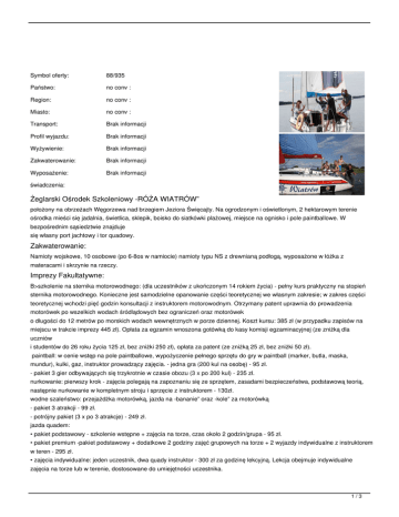 Symbol oferty: 88/935 Państwo: no conv : Region: no conv : Miasto: no conv : Transport: Brak informacji Profil wyjazdu: Brak informacji Wyżywienie: Brak informacji Zakwaterowanie: Brak informacji Wyposażenie: Brak informacji świadczenia: Żeglarski Ośrodek Szkoleniowy -RÓŻA WIATRÓW” położony na obrzeżach Węgorzewa nad brzegiem Jeziora Święcajty. Na ogrodzonym i oświetlonym, 2 hektarowym terenie ośrodka mieści się jadalnia, świetlica, sklepik, boisko do siatkówki plażowej, miejsce na ognisko i pole paintballowe. W bezpośrednim sąsiedztwie znajduje się własny port jachtowy i tor quadowy. Zakwaterowanie: Namioty wojskowe, 10 osobowe (po 6-8os w namiocie) namioty typu NS z drewnianą podłogą, wyposażone w łóżka z materacami i skrzynie na rzeczy. Imprezy Fakultatywne: B>szkolenie na sternika motorowodnego: (dla uczestników z ukończonym 14 rokiem życia) - pełny kurs praktyczny na stopień sternika motorowodnego. Konieczne jest samodzielne opanowanie części teoretycznej we własnym zakresie; w zakres części teoretycznej wchodzi pięć godzin konsultacji z instruktorem motorowodnym. Otrzymany patent uprawnia do prowadzenia motorówek po wszelkich wodach śródlądowych bez ograniczeń oraz motorówek o długości do 12 metrów po morskich wodach wewnętrznych w porze dziennej. Koszt kursu: 385 zł (w przypadku zapisów na miejscu w trakcie imprezy 445 zł). Opłata za egzamin wnoszona gotówką do kasy komisji egzaminacyjnej (ze zniżką dla uczniów i studentów do 26 roku życia 125 zł, bez zniżki 250 zł), opłata za patent (ze zniżką 25 zł, bez zniżki 50 zł). paintball: w cenie wstęp na pole paintballowe, wypożyczenie pełnego sprzętu do gry w paintball (marker, butla, maska, mundur), kulki, gaz, instruktor prowadzący zajęcia. - jedna gra (200 kul na osobę) - 95 zł. - pakiet 3 gier odbywających się trzykrotnie w czasie obozu (3 x po 200 kul) - 235 zł. nurkowanie: pierwszy krok - zajęcia polegają na zapoznaniu się ze sprzętem, zasadami bezpieczeństwa, podstawową teorią, następnie nurkowanie w kompletnym stroju i sprzęcie z instruktorem - 130zł. wodne szaleństwo: przejażdżka motorówką, jazda na -bananie” oraz -kole” za motorówką - pakiet 3 atrakcji - 99 zł. - potrójny pakiet (3 x po 3 atrakcje) - 249 zł. jazda quadem: • pakiet podstawowy - szkolenie wstępne + zajęcia na torze, czas około 2 godzin/grupa - 95 zł. • pakiet premium -pakiet podstawowy + dodatkowe 2 godziny zajęć grupowych na torze + 2 wyjazdy indywidualne z instruktorem w teren - 295 zł. • zajęcia indywidualne: jeden uczestnik, dwa quady instruktor - 300 zł za godzinę lekcyjną. Lekcja obejmuje indywidualne zajęcia na torze lub w terenie, dostosowane do umiejętności uczestnika. 1/3 całodzienny spływ kajakowy: rzeką Sapiną - 80 zł. Transport: zorganizowany dojazd z pilotem za dodatkową opłatą z miejscowości podanych w rozkładzie jazdy dojazd może zostać odwołany, jeśli ilość uczestników z danej miejscowości na określony turnus jest mniejsza niż 6 osób. Dokładne informacje odnośnie miejsca zbiórki oraz godziny odjazdu wysyłamy do każdego Klienta na adres mailowy podany przy rezerwacji. Dane dotyczące miejsca odjazdu podane w tabeli są tylko orientacyjne i mogą ulec zmianie ze względu na zmiany w rozkładzie jazdy pociągów oraz sezonowe remonty i przebudowy dróg. Wymagany ekwipunek: dowód tożsamości, legitymacja szkolna, karta obozowa, śpiwór (dla osób zakwaterowanych w namiotach i na jachtach), ciepły polar, dres, 2-3 ciepłe swetry, 2-3 pary spodni, ciepła bielizna, czapka wełniana i przeciwsłoneczna, ubranie przeciwdeszczowe (sztormiak), przybory toaletowe, krem ochronny z filtrem UV, okulary przeciwsłoneczne, ręczniki, buty turystyczne, trampki (lub inne na miękkiej, gumowej podeszwie), zeszyt, długopis, podręcznik do nauki teorii; mile widziane: latarka, rękawiczki, sandały / klapki, śpiewnik, instrumenty muzyczne. Świadczenia: zakwaterowanie: 13 noclegów, wyżywienie: 3 x dziennie (od obiadokolacji lub obiadu w dniu przyjazdu do śniadania w dniu wyjazdu + suchy prowiant na drogę powrotną), szkolenie żeglarskie teoretyczne i praktyczne zgodne z rozporządzeniem MSiT na jachtach kabinowych, opieka kadry (na każdą załogę 4-5osobową - 1 instruktor - sternik posiadający odpowiedni stopień żeglarski i doświadczenie), ubezpieczenie NNW (10.000zł) AXA Polska. Uwagi: Podczas zajęć całodniowych uczestnicy jedzą śniadanie i obiadkoloację w jadalni ośrodka oraz dostają suchy prowiant na czas zajęć. • Uczestnicy nie muszą posiadać doświadczenia i wiedzy żeglarskiej. • Wymagane jest ukończenie 14 roku życia nie później, niż w dniu egzaminu. • Szkolenie jest bardzo intensywne i wymaga zaangażowania ze strony uczestników, co powoduje, że mają niewielką ilość czasu wolnego. • Cena egzaminu: opłata wnoszona gotówką do kasy komisji egzaminacyjnej (zniżka uczniowie i studenci do 26 roku życia 125 zł, pozostali- 250 zł). • Ze względu na bogaty program obozu korzystanie z zajęć fakultatywnych może wymagać rezygnacji z niektórych zajęć podstawowych. • Każdy uczestnik może wykupić dodatkowo dobrowolne ubezpieczenie od kosztów rezygnacji z imprezy - 49zł. • Przyjazd indywidualny w dniu rozpoczęcia od godz. 14:00. Atrakcje: Program: Szkolenie: pełny teoretyczny i praktyczny kurs na stopień żeglarza jachtowego, prowadzony według rozporządzenia MSiT i zakończony egzaminem. Uczestnicy podzieleni zostaną zgodnie z grupami wiekowymi na załogi (koedukacyjne). Każda z załóg będzie miała swojego instruktora prowadzącego, odpowiedzialnego za przebieg jej szkolenia, który będzie prowadził zajęcia praktyczne oraz asystował przy nauce teorii. Zajęcia praktyczne z manewrowania jachtem będą się odbywały na jachtach kabinowych (typu Mak lub podobnych). Liczba jednostek będzie równa liczbie załóg. Uzyskany patent upra