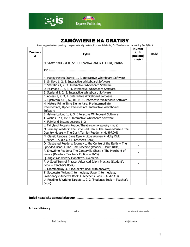 ZAMÓWIENIE NA GRATISY Przed wypełnieniem prosimy o zapoznanie się z ofertą Express Publishing for Teachers na rok szkolny 2013/2014 Zaznacz X Numer (lub poziom) części Tytuł Ilość ZESTAW NAUCZYCIELSKI DO ZAMAWIANEGO PODRĘCZNIKA Tytuł............................................................................. A. Happy Hearts Starter, 1, 2. Interactive Whiteboard Software B. Smileys 1, 2, 3. Interactive Whiteboard Software C. Star Kids 1, 2, 3. Interactive Whiteboard Software D. Fairyland 1, 2, 3, 4. Interactive Whiteboard Software E. Starland 1, 2, 3. Interactive Whiteboard Software F. Access 1, 2, 3, 4. Interactive Whiteboard Software G. Upstream A1+, A2, B1, B1+. Interactive Whiteboard Software H. Matura Prime Time Elementary, Pre-intermediate, Intermediate, Upper Intermediate. Interactive Whiteboard Software I. Matura Upload 1, 2, 3. Interactive Whiteboard Software J. Wishes B2.1, B2.2. Interactive Whiteboard Software K. Fairyland Instant Lessons 1, 2 L. Fairyland Poppets Puppet Theatre (zestaw teatralny A lub B) M. Primary Readers: The Little Red Hen + The Town Mouse & the Country Mouse + The Giant Turnip (Reader + Multi-ROM) N. Classic Readers: Jane Eyre + Little Women + Moby Dick (Reader + Audio CD + Teacher's Book) O. Illustrated Readers: Journey to the Centre of the Earth + The Speckled Band + The Time Machine (Reader + Multi-ROM) P. Showtime Readers: The Canterville Ghost + The Merchant of Venice (Reader - Teacher's Edition + DVD) Q. Angielskie wyrazy kłopotliwe. Ćwiczenia R. A Good Turn of Phrase. Advanced Idiom Practice (Student's Book + Teacher's Book) S. Grammarway 3, 4 (Student's Book with answers) T. Successful Writing Intermediate, Upper Intermediate, Proficiency (Student's Book + Teacher's Book + Audio CD) U. Reading & Writing Targets 1, 2, 3 (Student's Book + Teacher's Book) - - Imię i nazwisko zamawiającego .............................................................................................. Adres odbiorcy ............................................................................................................................ ulica nr domu/mieszkania ..................................................................................................................................................... kod pocztowy miejscowość 1 Telefon ........................................................................................................................................ prywatny służbowy E-mail ......................................................................................................................................... Data i czytelny podpis ................................................................................................................ W przypadku zakupów w księgarni warunkiem otrzymania gratisów jest dołączenie dowodu zakupu w postaci kopii paragonu lub faktury. Formularz zamówienia gratisów należy przesłać na adres: EGIS Sp. z o.o. Dział Sprzedaży Wysyłkowej, ul. Kochanowskiego 30, 33-100 Tarnów, fax: (14) 631 96 10. 2