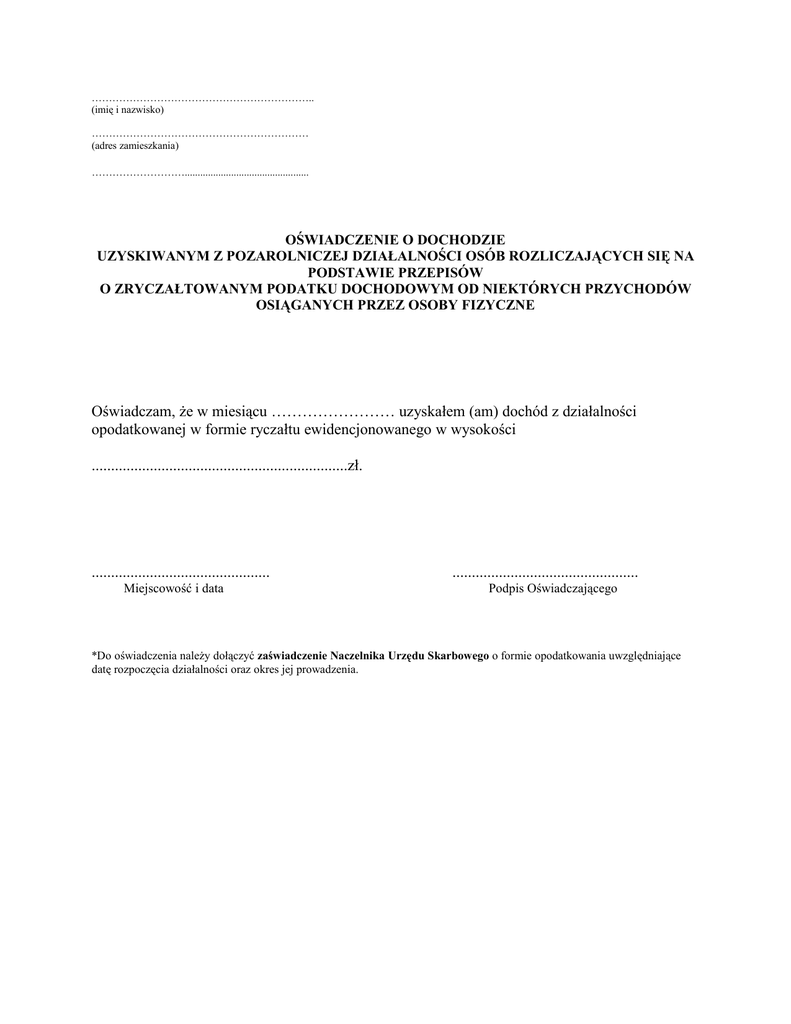 ……………………………………………………….. (imię i nazwisko) ……………………………………………………… (adres zamieszkania) ………………………................................................ OŚWIADCZENIE O DOCHODZIE UZYSKIWANYM Z POZAROLNICZEJ DZIAŁALNOŚCI OSÓB ROZLICZAJĄCYCH SIĘ NA PODSTAWIE PRZEPISÓW O ZRYCZAŁTOWANYM PODATKU DOCHODOWYM OD NIEKTÓRYCH PRZYCHODÓW OSIĄGANYCH PRZEZ OSOBY FIZYCZNE Oświadczam, Ŝe w miesiącu …………………… uzyskałem (am) dochód z działalności opodatkowanej w formie ryczałtu ewidencjonowanego w wysokości ..................................................................zł. .............................................. Miejscowość i data ................................................ Podpis Oświadczającego *Do oświadczenia naleŜy dołączyć zaświadczenie Naczelnika Urzędu Skarbowego o formie opodatkowania uwzględniające datę rozpoczęcia działalności oraz okres jej prowadzenia.