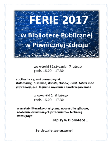 FERIE 2017 w Bibliotece Publicznej w Piwnicznej-Zdroju we wtorki 31 stycznia i 7 lutego godz. 16.00 – 17.30 spotkania z grami planszowymi: Kalambury, 5 sekund, Boost!, Dooble, Dixit, Tabu i inne gry rozwijające logiczne myślenie i spostrzegawczość w czwartki 2 i 9 lutego godz. 16.00 – 17.30 warsztaty literacko-plastyczne, nowości książkowe, zdobienie drewnianych przedmiotów techniką decoupage Zapisy w Bibliotece… Serdecznie zapraszamy!