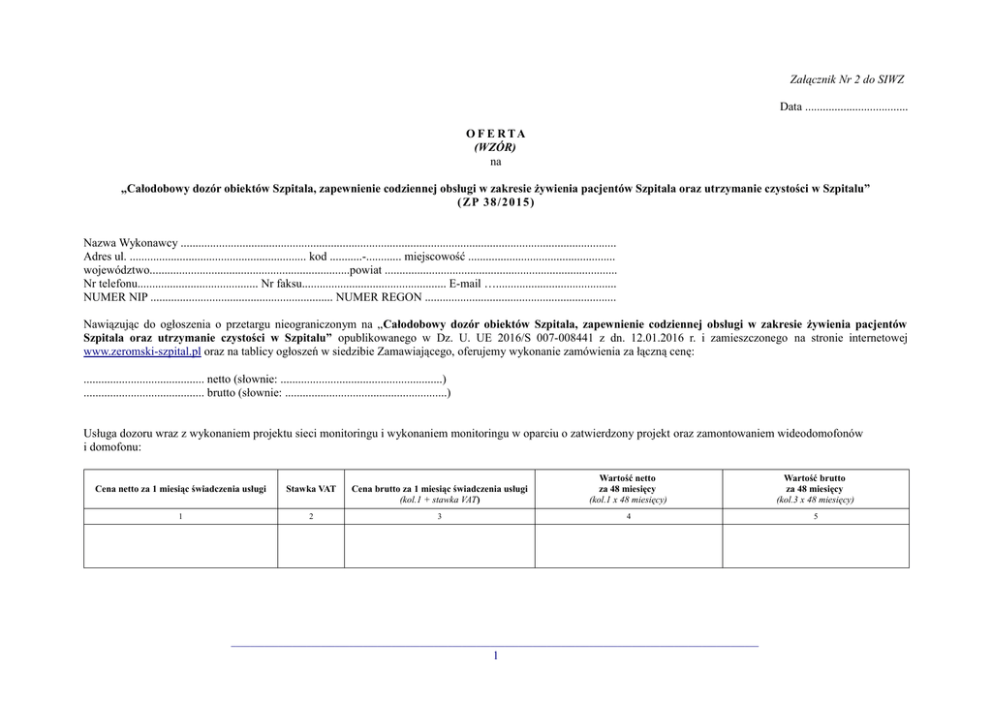 Załącznik Nr 2 do SIWZ Data ................................... O F E RTA (WZÓR) na „Całodobowy dozór obiektów Szpitala, zapewnienie codziennej obsługi w zakresie żywienia pacjentów Szpitala oraz utrzymanie czystości w Szpitalu” ( Z P 38/ 2015) Nazwa Wykonawcy .................................................................................................................................................... Adres ul. ............................................................ kod ...........-............ miejscowość .................................................. województwo....................................................................powiat ............................................................................... Nr telefonu......................................... Nr faksu................................................. E-mail …......................................... NUMER NIP .............................................................. NUMER REGON ................................................................. Nawiązując do ogłoszenia o przetargu nieograniczonym na „Całodobowy dozór obiektów Szpitala, zapewnienie codziennej obsługi w zakresie żywienia pacjentów Szpitala oraz utrzymanie czystości w Szpitalu” opublikowanego w Dz. U. UE 2016/S 007-008441 z dn. 12.01.2016 r. i zamieszczonego na stronie internetowej www.zeromski-szpital.pl oraz na tablicy ogłoszeń w siedzibie Zamawiającego, oferujemy wykonanie zamówienia za łączną cenę: ......................................... netto (słownie: .......................................................) ......................................... brutto (słownie: .......................................................) Usługa dozoru wraz z wykonaniem projektu sieci monitoringu i wykonaniem monitoringu w oparciu o zatwierdzony projekt oraz zamontowaniem wideodomofonów i domofonu: Cena netto za 1 miesiąc świadczenia usługi Stawka VAT Cena brutto za 1 miesiąc świadczenia usługi (kol.1 + stawka VAT) Wartość netto za 48 miesięcy (kol.1 x 48 miesięcy) Wartość brutto za 48 miesięcy (kol.3 x 48 miesięcy) 1 2 3 4 5 ________________________________________________________________________________________________________________ 1 Usługa żywienia pacjentów Szpitala, w tym przygotowywanie posiłków w Kuchni Mlecznej oraz utylizacja odpadów pokonsumpcyjnych: Cena netto za 1 osobodzień świadczenia usług Stawka VAT 1 Cena brutto za 1 osobodzień świadczenia usług (kol.1 + stawka VAT) Cena netto za jeden miesiąc świadczenia usługi (kol.1 x 310 x 30 dni) Cena brutto za jeden miesiąc świadczenia usługi (kol.3 x 310 x 30 dni) Wartość netto za 84 miesiące (kol.4 x 84 miesiące) Wartość brutto za 84 miesiące (kol.5 x 84 miesiące) 3 4 5 6 7 2 Wykonanie w oparciu o Program Funkcjonalno-Użytkowy projektu przebudowy budynku Kuchnia-Pralnia i wykonanie robót budowlanych, w oparciu o przygotowany projekt, niezbędnych do uruchomienia przygotowywania posiłków w pomieszczeniach Kuchni Centralnej mieszczącej się w budynku Kuchnia-Pralnia Szpitala: Wartość netto Stawka VAT Wartość brutto (kol.1 + stawka VAT) 1 2 3 Usługa utrzymania czystości w Szpitalu: L.p. Przedmiot zamówienia Powierzchnia Cena netto za 1m2/1ha Stawka VAT Cena brutto za 1m2/1ha (kol.4 + kol.5) Cena netto za 1 miesiąc świadczenia usługi (kol.3 x kol.4 x 30 dni) Cena brutto za 1 miesiąc świadczenia usługi (kol.3 x kol.6 x 30 dni) Wartość netto za 48 miesięcy (kol.7 x 48 miesięcy) Wartość brutto za 48 miesięcy (kol.8 x 48 miesięcy) 1 2 3 4 5 6 7 8 9 10 1 2 Utrzymanie czystości w zakresie strefy „białej” łącznie z kosztami materiałowymi Utrzymanie czystości w zakresie strefy „szarej' łącznie z kosztami materiałowymi 14.373 m2 7.096 m2 ________________________________________________________________________________________________________________ 2 3 4 Utrzymanie czystości terenów zewnętrznych łącznie z kosztami materiałowymi Utrzymanie czystości terenów zielonych łącznie z kosztami materiałowymi 5 2 ha 2 ha RAZEM 1. Oświadczamy, że remont budynku Kuchnia-Pralnia Szpitala wykonamy w terminie do …............ (max. 12 miesięcy) od daty podpisania umowy na zapewnienie codziennej obsługi w zakresie żywienia pacjentów Szpitala. Oświadczamy, że ilość miesięcy, w których zostanie rozliczona wartość robót budowlanych na podstawie kompensaty wynosi …......................................... Oświadczamy, że zapoznaliśmy się ze SIWZ i nie wnosimy do niej zastrzeżeń oraz że zdobyliśmy konieczne informacje do przygotowania oferty. Oświadczamy, że wykonamy zamówienie zgodnie z opisem przedmiotu zamówienia i w terminach w nim wskazanych. Oświadczamy, że czujemy się związani niniejszą ofertą przez okres wskazany w SIWZ. Oświadczamy, że zawarty w SIWZ projekt umowy został przez nas zaakceptowany i zobowiązujemy się w przypadku wybrania naszej oferty do zawarcia umowy na wyżej wymienionych warunkach w miejscu i terminie wyznaczonym przez Zamawiającego. 7. Oświadczamy, że płatność nastąpi przelewem w terminie 60 dni od dnia otrzymania faktury. 8. Oświadczamy, że posiadamy możliwość udzielania ulgi we wpłatach na PFRON i zobowiązujemy się przez cały okres obowiązywania umowy do przedkładania w terminie 3 dni od otrzymania wynagrodzenia za usługi w danym miesiącu kalendarzowym zaświadczeń pozwalających Zamawiającemu na obniżenie za dany miesiąc składek na PFRON (dotyczy wyłącznie Wykonawcy, który jest zakładem pracy chronionej). 9. Oświadczamy, że zapewnimy utrzymanie stanu zatrudnienia, koniecznego do wykonywania ciągłości usługi. 10. Oświadczamy, że zgodnie z pkt. VII. 1 SIWZ wnieśliśmy wadium w formie ............................................ w wysokości: .......................... zł 11. Wadium w formie pieniężnej powinno zostać zwrócone na rachunek bankowy: .........................