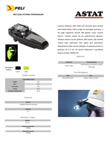 VB3 2220 LATARKA PERSONALNA Latarka diodowa VB3 2220 LED LE posiada dwie bardzo jasne białee diody, które mogą mog nie wymagać wymiany, a do tego zapewnia ewnia ponad 100 godzin czasu zużycia baterii. Latarka zapala się po podniesieniu głowicy. gł Głowica obraca się do pełłnych 180 stopni, aby światło można było skierować tam, gdzie jest potrzebne. Wbudowany klips można zakładać zakł na powierzchniach o grubości ści do 1,3 cm. Do latarki dołączono do 2 guzikowe baterie litowe CR2032 3V. Materiał Obudowa Typ przełącznika Uruchomienie po uniesieniu modułu Polimer Xylex świetlnego Dostępne kolory: Czarny Żółty Typ katalogowy Źródło światła Tryb pełnej mocy Źródło LED Moc 9 lm Czas pracy 34 h Zasięg 12 m Światłość maksymalna 38 cd Zasilanie Baterie 2 CR2032 Litowe (w zestawie) Napięcie 3 V Wymiary i waga Długość 8.9 cm Waga (z bateriami) 0.09 kg Waga (bez baterii) 0.02 kg KTM Opis PE-2220-010-245E Latarka taktyczna 2220