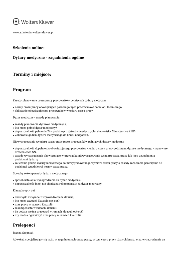 www.szkolenia.wolterskluwer.pl Szkolenie online: Dyżury medyczne - zagadnienia ogólne Terminy i miejsce: Program Zasady planowania czasu pracy pracowników pełniących dyżury medyczne ● ● normy czasu pracy obowiązujące poszczególnych pracowników podmiotu leczniczego; obliczanie obowiązującego pracowników wymiaru czasu pracy. Dyżur medyczny - zasady planowania ● ● ● ● zasady planowania dyżurów medycznych; kto może pełnić dyżur medyczny? dopuszczalność pełnienia 24 - godzinnych dyżurów medycznych - stanowiska Ministerstwa i PIP; Zaliczanie godzin dyżuru medycznego do limitu nadgodzin. Niewypracowanie wymiaru czasu pracy przez pracowników pełniących dyżury medyczne ● ● ● dopuszczalność dopełnienia obowiązującego pracownika wymiaru czasu pracy godzinami dyżuru medycznego - najnowsze orzecznictwo SN; zasady wynagradzania obowiązujące w przypadku niewypracowania wymiaru czasu pracy lub jego uzupełnienia godzinami dyżuru; zaliczanie godzin dyżury medycznego do niewypracowanego wymiaru czasu pracy a zasady rozliczania przeciętnie 48 godzinnej tygodniowej normy czasu pracy. Sposoby rekompensaty dyżuru medycznego. ● ● sposób ustalania wynagrodzenia za dyżur medyczny; dopuszczalność innej niż pieniężna rekompensaty za dyżur medyczny. Klauzula opt - out ● ● ● ● ● ● obowiązki związane z wprowadzeniem klauzuli; kto może zawrzeć klauzulę opt-out? czas pracy w ramach klauzuli; rekompensata w ramach klauzuli; ile godzin można pracować w ramach klauzuli opt-out? czy można ograniczyć czas pracy w ramach klauzuli? Prelegenci Joanna Stępniak Adwokat, specjalizujący się m.in. w zagadnieniach czasu pracy, w tym czasu pracy różnych branż, oraz wynagrodzenia za pracę. Szkoleniowiec z dużym doświadczeniem prowadzący zarówno szkolenia otwarte jak i zamknięte. Autor licznych publikacji z zakresu prawa pracy.W Departamencie Prawnym oraz Nadzoru i Kontroli GIP była ogólnopolskim koordynatorem kontroli dotyczących czasu pracy oraz wypłat wynagrodzeń za pracę i innych świadczeń ze stosunku pracy. Absolwentka Wydziału Prawa i Administracji Uniwersytetu Warszawskiego. Kontakt w sprawie szkolenia: