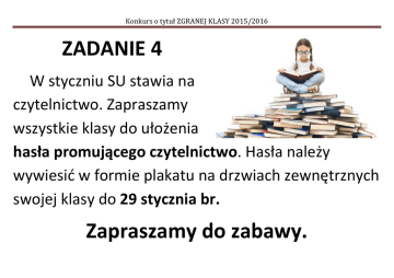 Konkurs o tytuł ZGRANEJ KLASY 2015/2016 ZADANIE 4 W styczniu SU stawia na czytelnictwo. Zapraszamy wszystkie klasy do ułożenia hasła promującego czytelnictwo. Hasła należy wywiesić w formie plakatu na drzwiach zewnętrznych swojej klasy do 29 stycznia br. Zapraszamy do zabawy.