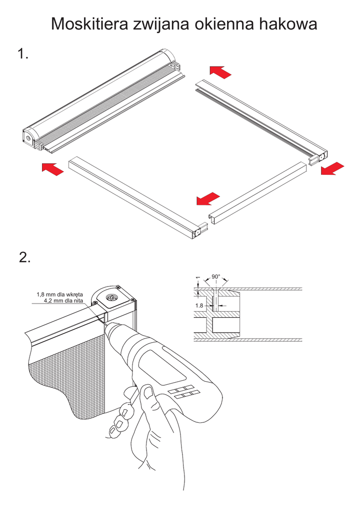 Moskitiera zwijana okienna hakowa 1. 1 2. 1,8 mm dla wkręta 4,2 mm dla nita 1.8 90° 3. 4. 1,8 mm 1 1.8 90° 5. Elementy moskitiery zabezpieczyć przed rozusnięciem wkrętami lub nitami w zależności od wielkości wkręta ( o 8 mm 8 3,5) 6. 7. 8. Obsługa moskitiery 9. 2 1 Instrukcja użytkowania Moskitiery rolowanej Pomiar i montaż · Pomiaru oraz montażu powinien dokonywać przeszkolony montażysta · Producent nie ponosi odpowiedzialności za wadliwy pomiar lub montaż Użytkowanie · Do otwierania moskitiery służy listwa wyposażona w uchwyt · Użytkować moskitierę tylko wtedy gdy w zasięgu pracy produktu nie znajdują się żadne przeszkody. · W przypadku błędnego działania moskitiery fakt ten należy zgłosić sprzedawcy. Pielęgnacja produktu · Moskitierę należy przynajmniej raz w miesiącu czyścić. · Podczas remontów oraz dużego zapylenia pomieszczenia należy zwinąć siatkę Producent nie ponosi odpowiedzialności za: · Zły naciąg siatki w wyniku niewłaściwego użytkowania · Niezgodny z przeznaczeniem montaż tj. w pomieszczeniach o dużej wilgotności, w pobliżu źródeł ciepła gdzie następuje deformacja siatki · Za utratę estetyki w wyniku zabrudzenia, uszkodzenia środkami chemicznymi itp. · Przerabianie oraz naprawianie dokonywane przez klienta w wyniku, których nastąpiło uszkodzenie moskitiery · Zadrapania powierzchni lakierniczej oraz uszkodzenia siatki moskitiery w czasie rozpakowywania produktu · Uszkodzenia mechaniczne oraz uszkodzenia powstałe w wyniku: - niewłaściwego użytkowania produktu, - niedbałego przechowywania oraz nadmiernego przeciążenia, - nie zastosowania się do zaleceń instrukcji montażu producenta. - zdarzeń losowych jak np.: zalanie mieszkania, oddziaływanie zwierząt, przed silnym wiatrem mrozem i śniegiem Aby ochronić moskitierę należy pozostawić ją w pozycji zwiniętej