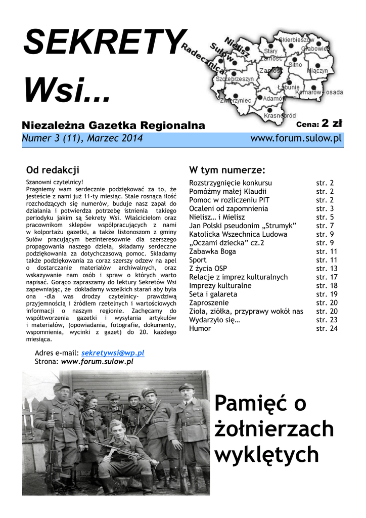 SEKRETY Wsi... Niezależna Gazetka Regionalna Numer 3 (11), Marzec 2014 Cena: 2 zł www.forum.sulow.pl Od redakcji W tym numerze: Szanowni czytelnicy! Pragniemy wam serdecznie podziękować za to, że jesteście z nami już 11-ty miesiąc. Stale rosnąca ilość rozchodzących się numerów, buduje nasz zapał do działania i potwierdza potrzebę istnienia takiego periodyku jakim są Sekrety Wsi. Właścicielom oraz pracownikom sklepów współpracujących z nami w kolportażu gazetki, a także listonoszom z gminy Sułów pracującym bezinteresownie dla szerszego propagowania naszego dzieła, składamy serdeczne podziękowania za dotychczasową pomoc. Składamy także podziękowania za coraz szerszy odzew na apel o dostarczanie materiałów archiwalnych, oraz wskazywanie nam osób i spraw o których warto napisać. Gorąco zapraszamy do lektury Sekretów Wsi zapewniając, że dokładamy wszelkich starań aby była ona -dla was drodzy czytelnicy- prawdziwą przyjemnością i źródłem rzetelnych i wartościowych informacji o naszym regionie. Zachęcamy do współtworzenia gazetki i wysyłania artykułów i materiałów, (opowiadania, fotografie, dokumenty, wspomnienia, wycinki z gazet) do 20. każdego miesiąca. Rozstrzygnięcie konkursu Pomóżmy małej Klaudii Pomoc w rozliczeniu PIT Ocaleni od zapomnienia Nielisz… i Mielisz Jan Polski pseudonim „Strumyk” Katolicka Wszechnica Ludowa „Oczami dziecka” cz.2 Zabawka Boga Sport Z życia OSP Relacje z imprez kulturalnych Imprezy kulturalne Seta i galareta Zaproszenie Zioła, ziółka, przyprawy wokół nas Wydarzyło się… Humor str. 2 str. 2 str. 2 str. 3 str. 5 str. 7 str. 9 str. 9 str. 11 str. 11 str. 13 str. 17 str. 18 str. 19 str. 20 str. 20 str. 23 str. 24 Adres e-mail: [email protected] Strona: www.forum.sulow.pl Pamięć o żołnierzach wyklętych 2 Rozstrzygnięcie konkursu! Zgodnie z zapowiedzią, 20 lutego rozstrzygnięto konkurs ze znajomości naszej gazetki oraz regionu. Konkurs został ogłoszony w styczniowym numerze „Sekretów Wsi”. Warunkiem wzięcia udziału było prawidłowe wypełnienie kuponu i odesłanie go na adres redakcji. W wyniku losowania wyłoniono zwyciężczynię, którą okazała się mieszkanka Sułowca - Pani Jadwiga Płachta. Część zespołu redakcyjnego odwiedziła laureatkę w jej domu w celu złożenia gratulacji i wręczenia nagrody. Dla Pani Jadwigi była to wielka radość i zaskoczenie, gdyż jak stwierdziła „ brałam udział w wielu różnych konkursach ogłaszanych w innych gazetach a to jest moja pierwsza nagroda”. Dodajmy, że Pani Jadwiga jest naszą wierną czytelniczką, wszystkie numery naszej gazetki przechowuje na półce w regale swojego pokoju. Pomóżmy małej Klaudii w walce z chorobą Zbliża się czas rozliczania PIT-ów, w wiązku z tym zwracamy się do Państwa z ogromną prośbą o przekazanie swojego 1% podatku na leczenie naszej córeczki Klaudii Wyłupek. W październiku 2013 roku u Klaudii został zdiagnozowany nowotwór złośliwy nerki, tzw. „guz Wilmsa”. Została ona poddana leczeniu chemioterapią, które będzie trwało jeszcze przez długi czas. Ze względu na długie pobyty na oddziale, dojazdy do szpitala oraz coraz większe potrzeby chorego dziecka nasza sytuacja finansowa jest coraz cięższa, dlatego bardzo potrzebujemy pomocy. Będziemy bardzo mocno wdzięczni za wszelką pomoc. Poniższe dane, które należy odpowiednio wpisać na formularzu PIT: FUNDACJA FUGA MUNDI ORGANIZACJA POŻYTKU PUBLICZNEGO UL. HUTNICZA 20 B, 20-218 LUBLIN KRS: 0000 106 416 KONIECZNIE Z DOPISKIEM: „KLAUDIA WYŁUPEK” Dziękujemy w imieniu Klaudii i własnym Rodzice Małgorzata i Zbigniew Wyłupek Pomoc w rozliczeniu PIT Wójt Gminy Sułów w porozumieniu z Naczelnikiem Urzędu Skarbowego w Zamościu oferuje pomoc w rozliczeniu i przesłaniu drogą elektroniczną zeznania o wysokości osiągniętego dochodu PIT-37 za 2013 r. W dniach od 20 lutego do 30 kwietnia 2014 roku, w każde dni robocze w godzinach od 10.00 do 14.00 w Urzędzie Gminy w Sułowie możliwe będzie przesłanie rozliczenia rocznego drogą elektroniczną. Udostępnione będzie stanowisko komputerowe oraz pełnić będą dyżur pracownicy Urzędu Gminy przeszkoleni przez pracowników Urzędu Skarbowego, udzielający instruktażu z zakresu sposobu przygotowania i przesłania dokumentów podatkowych drogą elektroniczną. Do wypełnienia i przesłania rozliczenia rocznego PIT-37 niezbędne są następujące dokumenty: informacje o osiągniętych w 2013 roku dochodach (dokumenty PIT-11, PIT-11A lub PIT-40A, PIT-8C); zeznanie PIT-37 za rok 2012 (informacja o wysokości osiągniętych przychodów w 2012 roku jest niezbędna do podpisu i wysyłki deklaracji elektronicznej) W przypadku korzystania z ulg podatkowych: ulgi na dzieci - numer PESEL dziecka/dzieci lub imię, nazwisko, datę urodzenia; ulgi z tytułu użytkowania sieci internet - dokumenty potwierdzające zakup usług internetowych. W przypadku przekazania 1 % podatku na rzecz OPP : nr KRS organizacji. (Materiał z UG Sułów) „SEKRETY WSI” – Niezależna Gazetka Regionalna 3 Ocaleni od zapomnienia Żołnierze wyklęci „Ponieważ żyli prawem wilka, historia o nich głucho milczy” Od 2011 roku 1 marca obchodzimy Narodowy Dzień Pamięci Żołnierzy Wyklętych. Tego dnia przypominamy o ich poświęceniu, walce o Wolną Polskę, o ich bohaterskiej postawie. Działania władz komunistycznych, a także obecnych skupiały i skupiają się na tym, aby pamięć o Żołnierzach Niezłomnych zniszczyć. Jednak widoczne jest, że coraz więcej ludzi zna historię, a także bierze udział w marszach i wydarzeniach ku pamięci ostatnich żołnierzy Podziemia Niepodległościowego. Kim byli, o co walczyli Żołnierze Wyklęci i dlaczego? Po zakończeniu II Wojny Światowej władzę w Polsce przejęli Sowieci, używając do tego marionetkowego Tymczasowego Rządu Jedności Narodowej. Z takim obrotem spraw nie mogli pogodzić się do końca wierni 