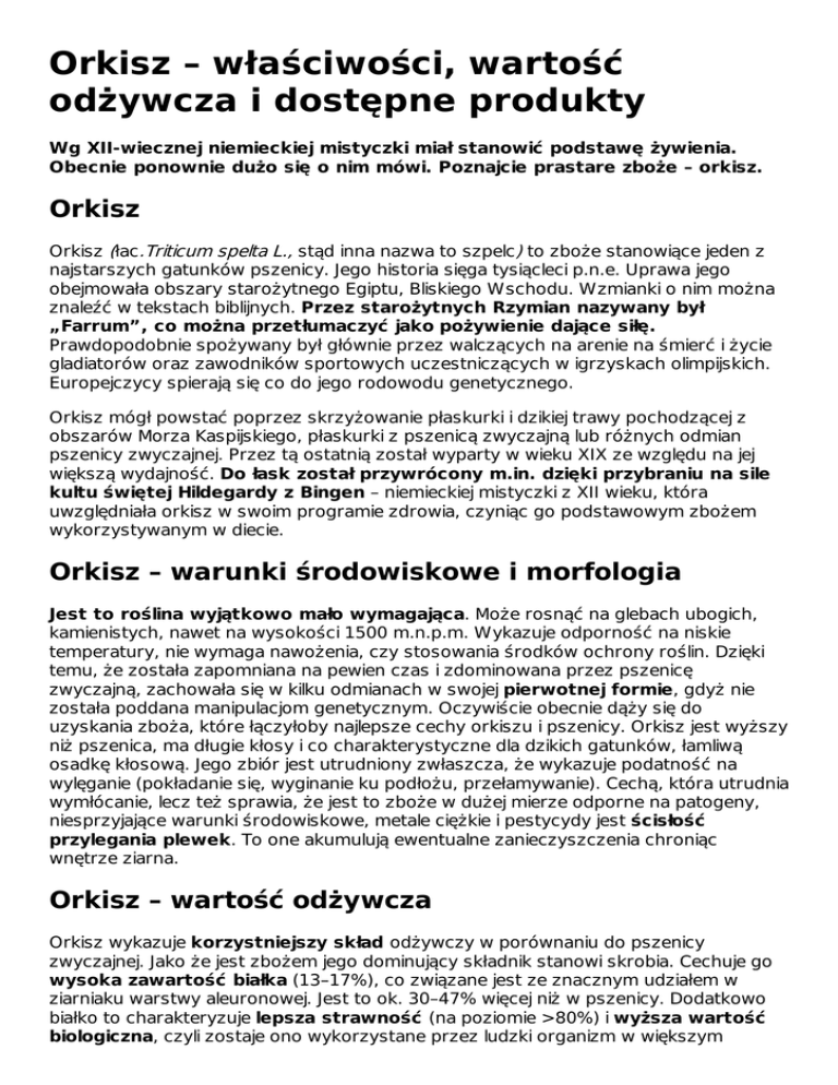 Orkisz – właściwości, wartość odżywcza i dostępne produkty Wg XII-wiecznej niemieckiej mistyczki miał stanowić podstawę żywienia. Obecnie ponownie dużo się o nim mówi. Poznajcie prastare zboże – orkisz. Orkisz Orkisz (łac.Triticum spelta L., stąd inna nazwa to szpelc) to zboże stanowiące jeden z najstarszych gatunków pszenicy. Jego historia sięga tysiącleci p.n.e. Uprawa jego obejmowała obszary starożytnego Egiptu, Bliskiego Wschodu. Wzmianki o nim można znaleźć w tekstach biblijnych. Przez starożytnych Rzymian nazywany był „Farrum”, co można przetłumaczyć jako pożywienie dające siłę. Prawdopodobnie spożywany był głównie przez walczących na arenie na śmierć i życie gladiatorów oraz zawodników sportowych uczestniczących w igrzyskach olimpijskich. Europejczycy spierają się co do jego rodowodu genetycznego. Orkisz mógł powstać poprzez skrzyżowanie płaskurki i dzikiej trawy pochodzącej z obszarów Morza Kaspijskiego, płaskurki z pszenicą zwyczajną lub różnych odmian pszenicy zwyczajnej. Przez tą ostatnią został wyparty w wieku XIX ze względu na jej większą wydajność. Do łask został przywrócony m.in. dzięki przybraniu na sile kultu świętej Hildegardy z Bingen – niemieckiej mistyczki z XII wieku, która uwzględniała orkisz w swoim programie zdrowia, czyniąc go podstawowym zbożem wykorzystywanym w diecie. Orkisz – warunki środowiskowe i morfologia Jest to roślina wyjątkowo mało wymagająca. Może rosnąć na glebach ubogich, kamienistych, nawet na wysokości 1500 m.n.p.m. Wykazuje odporność na niskie temperatury, nie wymaga nawożenia, czy stosowania środków ochrony roślin. Dzięki temu, że została zapomniana na pewien czas i zdominowana przez pszenicę zwyczajną, zachowała się w kilku odmianach w swojej pierwotnej formie, gdyż nie została poddana manipulacjom genetycznym. Oczywiście obecnie dąży się do uzyskania zboża, które łączyłoby najlepsze cechy orkiszu i pszenicy. Orkisz jest wyższy niż pszenica, ma długie kłosy i co charakterystyczne dla dzikich gatunków, łamliwą osadkę kłosową. Jego zbiór jest utrudniony zwłaszcza, że wykazuje podatność na wylęganie (pokładanie się, wyginanie ku podłożu, przełamywanie). Cechą, która utrudnia wymłócanie, lecz też sprawia, że jest to zboże w dużej mierze odporne na patogeny, niesprzyjające warunki środowiskowe, metale ciężkie i pestycydy jest ścisłość przylegania plewek. To one akumulują ewentualne zanieczyszczenia chroniąc wnętrze ziarna. Orkisz – wartość odżywcza Orkisz wykazuje korzystniejszy skład odżywczy w porównaniu do pszenicy zwyczajnej. Jako że jest zbożem jego dominujący składnik stanowi skrobia. Cechuje go wysoka zawartość białka (13–17%), co związane jest ze znacznym udziałem w ziarniaku warstwy aleuronowej. Jest to ok. 30–47% więcej niż w pszenicy. Dodatkowo białko to charakteryzuje lepsza strawność (na poziomie >80%) i wyższa wartość biologiczna, czyli zostaje ono wykorzystane przez ludzki organizm w większym stopniu. W porównaniu do pszenicy, orkisz zawiera także więcej glutenu, nie jest więc odpowiedni dla chorujących na celiakię. Choć zdania na ten temat są podzielone i można spotkać się z opinią, że niekiedy orkisz w odróżnieniu od pszenicy jest tolerowany. Kolejna przewaga odżywcza tego prastarego zboża to większa ilość tłuszczu, w tym kwasów tłuszczowych nienasyconych (zwłaszcza jednonienasyconych) o korzystnym wpływie na układ sercowo-naczyniowy. Współdziałają one wraz z fitosterolami (których również jest więcej niż w pszenicy) w obniżaniu poziomu cholesterolu we krwi i ochronie przed miażdżycą. Orkisz jest bogatszy w witaminy rozpuszczalne w tłuszczu: A, D, E, przy czym aktywność tej ostatniej jest wyższa o ok. 1/3, witaminy rozpuszczalne w wodzie z grupy B: tiaminę, ryboflawinę, niacynę, pirydoksynę. Charakteryzuje go także wyższy poziom składników mineralnych: żelaza, cynku, miedzi, magnezu, wapnia, fosforu, manganu, potasu, kobaltu. Orkisz zawiera kwas krzemowy o korzystnym działaniu na ludzki organizm, m.in. wzmacnia odporność, stymuluje syntezę kolagenu, czym poprawia stan skóry, włosów i paznokci, pobudza różnicowanie komórek kościotwórczych. Dość unikalnym składnikiem obecnym w orkiszu jest rodanid – substancja o cechach naturalnego antybiotyku kształtująca odporność niemowląt karmionych piersią (mleko kobiecie bowiem także zawiera ten związek). Wykazuje on działanie przeciwzapalne, przeciwalergiczne, przeciwnowotworowe, wzmacniające. Orkisz – właściwości Święta Hildegarda przypisywała mu właściwości ogrzewające, wzmacniające, odżywcze, natłuszczające, wspomagające ukrwienie, budujące mocne mięśnie. Uznawała je za najlepsze spośród ziaren i najbardziej z nich łagodne. Terapeuci czerpiący z dorobku mistyczki określają orkisz jako pomocny w profilaktyce oraz wspomaganiu leczenia wielu chorób m.in.: stan osłabienia organizmu, zmęczenie, spadek wydolności choroby nowotworowe reumatyzm zagrożenie zawałem mięśnia sercowego czy udarem mózgu choroby sercowo-naczyniowe hipercholesterolemia alergie (również skaza białkowa) choroby jelit (wrzodziejące zapalenie jelit, choroba Leśniowskiego-Crohna) i zaburzenia ich pracy (skurcze, zaparcia, biegunka), hemoroidy choroby nerek i wątroby (w tym kamica woreczka żółciowego) choroby krwi zaburzenia nastroju, nerwice, depresja Produkty orkiszowe W związku z obecnym wielkim renesansem orkiszu ilość i zróżnicowanie produktów powstałych na jego bazie, obecnych na rynku spożywczym, jest zadziwiająca. Kupić możemy go w postaci ziaren całych, wypolerowanych (ryż), posiekanych (kasza), zmielonych (grysik), mąki, otrębów, płatków, ciastek, makaronu, a nawet kawy. Powszechne jest także pieczywo z domieszką mąki orkiszowej. W technologii wypieku chleba prawdopodobnie unika się 