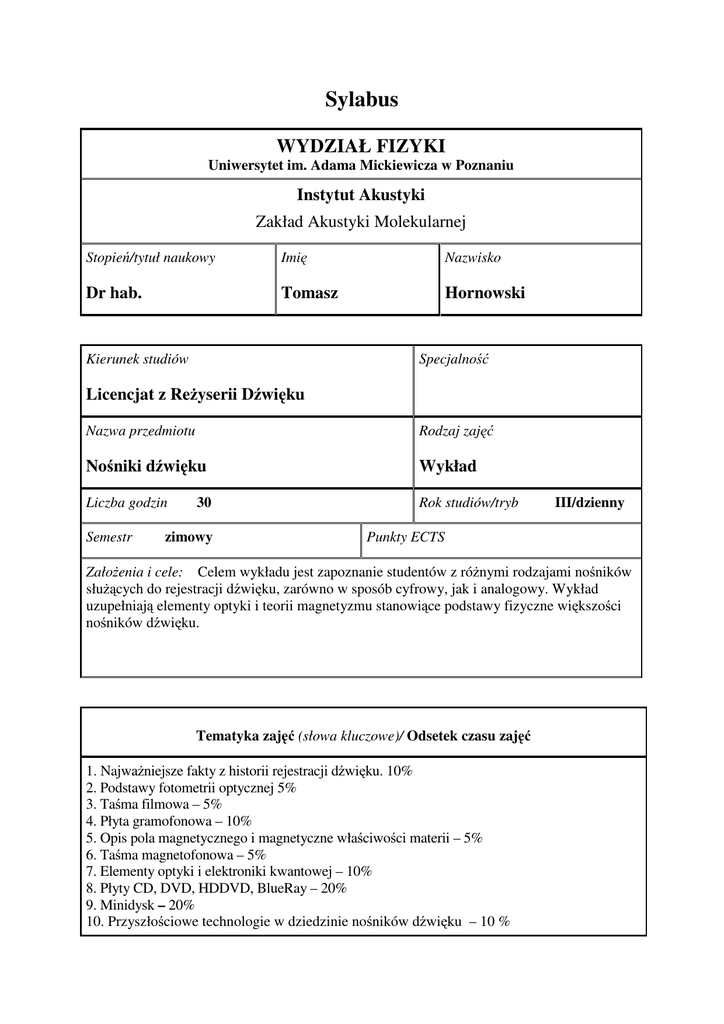 Sylabus WYDZIAŁ FIZYKI Uniwersytet im. Adama Mickiewicza w Poznaniu Instytut Akustyki Zakład Akustyki Molekularnej Stopie /tytuł naukowy Imi Nazwisko Dr hab. Tomasz Hornowski Kierunek studiów Specjalno Licencjat z Re yserii D wi ku Nazwa przedmiotu Rodzaj zaj No niki d wi ku Wykład Liczba godzin Semestr 30 zimowy Rok studiów/tryb III/dzienny Punkty ECTS Zało enia i cele: Celem wykładu jest zapoznanie studentów z ró nymi rodzajami no ników słu cych do rejestracji d wi ku, zarówno w sposób cyfrowy, jak i analogowy. Wykład uzupełniaj elementy optyki i teorii magnetyzmu stanowi ce podstawy fizyczne wi kszo ci no ników d wi ku. Tematyka zaj (słowa kluczowe)/ Odsetek czasu zaj 1. Najwa niejsze fakty z historii rejestracji d wi ku. 10% 2. Podstawy fotometrii optycznej 5% 3. Ta ma filmowa – 5% 4. Płyta gramofonowa – 10% 5. Opis pola magnetycznego i magnetyczne wła ciwo ci materii – 5% 6. Ta ma magnetofonowa – 5% 7. Elementy optyki i elektroniki kwantowej – 10% 8. Płyty CD, DVD, HDDVD, BlueRay – 20% 9. Minidysk – 20% 10. Przyszło ciowe technologie w dziedzinie no ników d wi ku – 10 % Sposoby oceny pracy studenta ocena ci gła (bie ce przygotowanie do zaj Udział w ocenie ko cowej i aktywno ) ródsemestralne kolokwia pisemne/ustne ko cowe zaliczenie pisemne/ustne egzamin pisemny egzamin ustny 90 % kontrola obecno ci 10 % Praca ko cowa semestralna/roczna inne: Literatura obowi zkowa 1. A. Czy ewski, D wi k cyfrowy, EXIT, Warszawa 2001 2. B. Urba ski, Technika zapisywania i odtwarzania d wi ków, Wyd. Komunikacji i Ł czno ci, Warszawa 1978. 3. A. Piekara, Nowe oblicze optyki, PWN, Warszawa 1976. Literatura dodatkowa 1. K. Pohlmann, Principles of Digital Audio, IV ed. McGraw Hill, 2000. 2. C. D. Mae, E. D. Daniel, Magnetic Storage Handbook,.McGraw Hill, 1996.