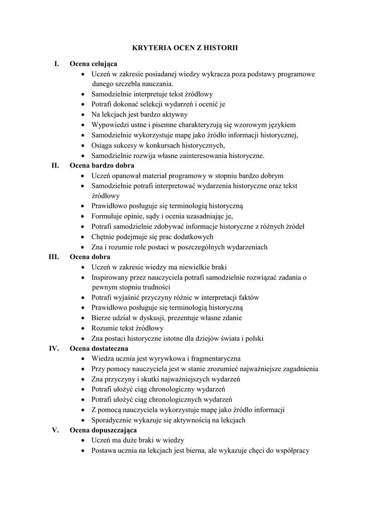 KRYTERIA OCEN Z HISTORII I. II. III. IV. V. Ocena celująca Uczeń w zakresie posiadanej wiedzy wykracza poza podstawy programowe danego szczebla nauczania. Samodzielnie interpretuje tekst źródłowy Potrafi dokonać selekcji wydarzeń i ocenić je Na lekcjach jest bardzo aktywny Wypowiedzi ustne i pisemne charakteryzują się wzorowym językiem Samodzielnie wykorzystuje mapę jako źródło informacji historycznej, Osiąga sukcesy w konkursach historycznych, Samodzielnie rozwija własne zainteresowania historyczne. Ocena bardzo dobra Uczeń opanował materiał programowy w stopniu bardzo dobrym Samodzielnie potrafi interpretować wydarzenia historyczne oraz tekst źródłowy Prawidłowo posługuje się terminologią historyczną Formułuje opinie, sądy i ocenia uzasadniając je, Potrafi samodzielnie zdobywać informacje historyczne z różnych źródeł Chętnie podejmuje się prac dodatkowych Zna i rozumie role postaci w poszczególnych wydarzeniach Ocena dobra Uczeń w zakresie wiedzy ma niewielkie braki Inspirowany przez nauczyciela potrafi samodzielnie rozwiązać zadania o pewnym stopniu trudności Potrafi wyjaśnić przyczyny różnic w interpretacji faktów Prawidłowo posługuje się terminologią historyczną Bierze udział w dyskusji, prezentuje własne zdanie Rozumie tekst źródłowy Zna postaci historyczne istotne dla dziejów świata i polski Ocena dostateczna Wiedza ucznia jest wyrywkowa i fragmentaryczna Przy pomocy nauczyciela jest w stanie zrozumieć najważniejsze zagadnienia Zna przyczyny i skutki najważniejszych wydarzeń Potrafi ułożyć ciąg chronologiczny wydarzeń Potrafi ułożyć ciąg chronologicznych wydarzeń Z pomocą nauczyciela wykorzystuje mapę jako źródło informacji Sporadycznie wykazuje się aktywnością na lekcjach Ocena dopuszczająca Uczeń ma duże braki w wiedzy Postawa ucznia na lekcjach jest bierna, ale wykazuje chęci do współpracy VI. Przy pomocy nauczyciela potrafi przedstawić najważniejsze informacje o przeszłości Szereguje wydarzenia w ciągach chronologicznych Potrafi przyporządkować pojęcia i nazwiska okresowi historycznemu Zna podstawowe wydarzenia Ocena niedostateczna Uczeń nie opanował w stopniu minimalnym zagadnień poruszanych na lekcji Nie zna podstawowych pojęć Nawet przy pomocy nauczyciela nie potrafi powtórzyć poznanych informacji. Nie włącza się w pracę na lekcji Przeszkadza innym w pracy Stan wiedzy nie pozwala na kontynuację nauki KRYTERIA OCEN Z WOS I. II. III. Ocena celująca Widza ucznia znacznie wykracza poza program omawiany na lekcji Korzysta ze źródeł zdobytych poza lekcjami WOS Jest bardzo aktywny na lekcji – pobudza innych do aktywności Posiada bardzo dużo informacji na temat aktualnych wydarzeń w kraju i na świecie Samodzielnie wyciąga wnioski Aktywnie uczestniczy w dyskusji prezentując swoje poglądy Pełni rolę asystenta nauczyciela Wykonuje prasówkę Jest aktywny społecznie Ocena bardzo dobra Uczeń zna i rozumie wszystkie zagadnienia oraz pojęcia zdobyte na lekcjach Posiada dużo informacji na temat aktywnych wydarzeń w kraju i na świecie Ma pomysły i chętnie się z nimi dzieli Jest aktywny społecznie Pobudza innych do aktywności Potrafi samodzielnie argumentować swoje zdanie W sposób jasny prezentuje swoje myśli Samodzielnie tworzy uogólnienia i wyciąga wnioski Wykonuje prasówkę Ocena dobra Uczeń zna i rozumie większość pojęć oraz zagadnień poruszanych na lekcji Zadania powierzone mu przez grupę wykonuje samodzielnie Czynnie uczestniczy w lekcji IV. V. VI. Potrafi samodzielnie znajdować argumenty uzasadniające wypowiedź, prezentować swoje myśli, stosować zdobytą wiedzę w praktyce Ocena dostateczna Uczeń zna i rozumie podstawowe zagadnienia i pojęcia omawiane na lekcji Orientuje się w najważniejszych wydarzeniach w kraju i na świecie Współpracuje z grupą w realizacji zadania Pod kierunkiem nauczyciela potrafi: podać argument uzasadniający zdanie, czasami prezentować swoje myśli, opisywać sytuację problemową Ocena dopuszczająca Uczeń nie orientuje się w bieżącej sytuacji w kraju i na świecie W minimalnym stopniu opanował zagadnienia poruszanie na lekcji Przy pomocy nauczyciela potrafi wyjaśnić znacznie najprostszych pojęć Jest biernym uczestnikiem zajęć i nie przeszkadza w ich prowadzeniu Ocena niedostateczna Uczeń nie opanował w stopniu minimalnym zagadnień poruszanych na lekcji Nie zna podstawowych pojęć Nie orientuje się w sytuacji w kraju i na świecie Nie włącza się w realizację zadań Przeszkadza innym w pracy Stan wiedzy nie pozwala na kontynuację nauki Szczegółowe zasady oceniania z historii i wiedzy o społeczeństwie Krótkie sprawdziany – kartkówki i odpowiedzi ustne obejmujące bieżący materiał lekcyjny (trzy ostatnie lekcje ) mogą być przeprowadzane na bieżąco, bez wcześniejszej zapowiedzi. Informacja o tematyce sprawdzianów podsumowujących całe działy będzie podana co najmniej z tygodniowym wyprzedzeniem. W ciągu semestru będą przeprowadzane co najmniej dwa sprawdziany. Na lekcjach uczeń otrzymuje plusy za aktywność (pięć plusów – ocena bardzo dobra) Szczególne zaangażowanie w pracę na lekcji (praca w grupach, drama, projekt) może być nagrodzona oceną bardzo dobrą lub celującą. Uczeń nieobecny na lekcjach zobowiązany jest do uzupełnienia ćwiczeń oraz zapoznania się z omawianymi treściami programowymi. Tylko w razie choroby uczeń może dostać dodatkowy czas (około 2 tygodnie) na zaliczenie sprawdzianu. Po tym terminie uczeń otrzyma ocenę niedostateczną. Uczeń musi w ciągu semestru wykonać tłumaczenie 30 pojęć z historii i wos. Każdy uczeń obowiązkowo co najmniej raz w semestrze musi wykonać prasówkę, która zawiera informacje o najważniejszych wydarzeniach z kraju i na świecie (z jednego tygodnia). Przy ocenianiu z wiedzy o społeczeństwie będzie brana pod uwagę postawa społeczna ucznia. Wykonała Ewa Czwartacka Teresa Mi