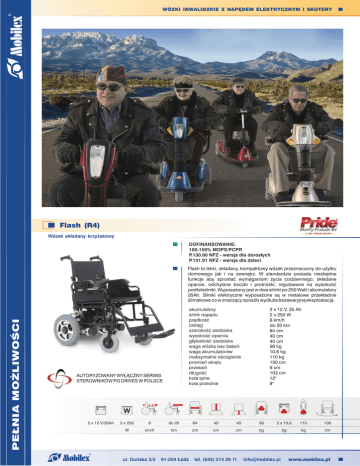 WÓ ZKI INWALIDZKIE Z NAPĘDEM ELEKTRYCZNYM I SKUTERY Flash (R4) Wózek składany krzyżakowy DOFINANSOWANIE: 100-150% MOPS/PCPR P.130.00 NFZ - wersja dla dorosłych P.131.01 NFZ - wersja dla dzieci PEŁNIA MOŻLIWOŚ CI Flash to lekki, sk³adany, kompaktowy wózek przeznaczony do u¿ytku domowego jak i na zewn¹trz. W standardzie posiada niezbêdne funkcje aby sprostaæ wymaganiom ¿ycia codziennego: sk³adane oparcie, odchylane boczki i podnó¿ki, regulowane na wysokoœæ pod³okietniki. Wyposa¿ony jest w dwa silniki po 250 Watt i akumulatory 35Ah. Silniki elektryczne wyposa¿one s¹ w metalowe przek³adnie œlimakowe co w znacz¹cy sposób wyd³u¿a bezawaryjn¹ eksploatacjê. akumulatory silnik napędu prędkość zasięg szerokość siedziska wysokość oparcia głębokość siedziska waga wózka bez baterii waga akumulatorów maksymalne obciążenie promień skrętu prześwit długość koła tylne koła przednie AUTORYZOWANY WYŁĄCZNY SERWIS STEROWNIKÓ W PG DRIVES W POLSCE 2 x 12 V/35Ah 2 x 12 V, 35 Ah 2 x 250 W 6 km/h do 20 km 64 cm 40 cm 45 cm 56 kg 10,6 kg 110 kg 130 cm 6 cm 103 cm 12" 8" 2 x 250 6 do 20 64 40 45 56 2 x 10,6 110 130 W km/h km cm cm cm kg kg kg cm ul. Duńska 3/5 91-204 Łódź tel. (042) 214 29 11 [email protected] www.mobilex.pl