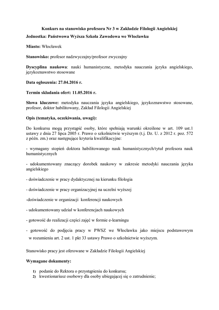Konkurs na stanowisko profesora Nr 3 w Zakładzie Filologii Angielskiej Jednostka: Państwowa Wyższa Szkoła Zawodowa we Włocławku Miasto: Włocławek Stanowisko: profesor nadzwyczajny/profesor zwyczajny Dyscyplina naukowa: nauki humanistyczne, metodyka nauczania języka angielskiego, językoznawstwo stosowane Data ogłoszenia: 27.04.2016 r. Termin składania ofert: 11.05.2016 r. Słowa kluczowe: metodyka nauczania języka angielskiego, językoznawstwo stosowane, profesor, doktor habilitowany, Zakład Filologii Angielskiej Opis (tematyka, oczekiwania, uwagi): Do konkursu mogą przystąpić osoby, które spełniają warunki określone w art. 109 ust.1 ustawy z dnia 27 lipca 2005 r. Prawo o szkolnictwie wyższym (t.j. Dz. U. z 2012 r. poz. 572 z późn. zm.) oraz następujące kryteria kwalifikacyjne: - wymagany stopień doktora habilitowanego nauk humanistycznych/tytuł profesora nauk humanistycznych - udokumentowany znaczący dorobek naukowy w zakresie metodyki nauczania języka angielskiego - doświadczenie w pracy dydaktycznej na kierunku filologia - doświadczenie w pracy organizacyjnej na uczelni wyższej -doświadczenie w organizacji konferencji naukowych - udokumentowany udział w konferencjach naukowych - gotowość do realizacji części zajęć w formie e-learningu - gotowość do podjęcia pracy w PWSZ we Włocławku jako miejscu podstawowym w rozumieniu art. 2 ust. 1 pkt 33 ustawy Prawo o szkolnictwie wyższym. Stanowisko pracy jest oferowane w Zakładzie Filologii Angielskiej Wymagane dokumenty: 1) podanie do Rektora o przystąpieniu do konkursu; 2) kwestionariusz osobowy dla osoby ubiegającej się o zatrudnienie; 3) życiorys zawodowy; 4) odpisy dokumentów potwierdzających posiadanie tytułu i/lub stopnia naukowego; 5) informacja o dorobku naukowym, dydaktycznym i organizacyjnym (autoreferat 6) 7) 8) 9) 10) 11) uwzględniający najważniejsze dziedziny badawcze oraz osiągnięcia naukowe, dydaktyczne i inne kandydata); wykaz publikacji (z podaniem wydawnictwa, roku opublikowania i ilości stron); dokumenty potwierdzające dorobek praktyczny; oświadczenie o niekaralności zgodnie z art. 109 ust. 1 pkt 3 ustawy Prawo o szkolnictwie wyższym; oświadczenie stwierdzające, że Państwowa Wyższa Szkoła Zawodowa we Włocławku będzie podstawowym miejscem pracy w rozumieniu ustawy Prawo o szkolnictwie wyższym - w przypadku wygrania konkursu; oświadczenie o wyrażeniu zgody na przetwarzanie danych osobowych zawartych w ofercie pracy dla potrzeb niezbędnych do realizacji procesu rekrutacji, zgodnie z ustawą z dnia 29 sierpnia 1997r. o ochronie danych osobowych (t.j. Dz.U. z 2015 r., poz. 2135 ze zm.); oświadczenie dotyczące wliczenia do minimum kadrowego na kierunku filologia. Dodatkowe informacje: Dokumenty należy składać w Dziale Organizacji i Kadr, ul. 3 Maja 17, pokój 31 w zamkniętej kopercie z dopiskiem „Konkurs na stanowisko profesora Nr 3 w Zakładzie Filologii Angielskiej Państwowej Wyższej Szkoły Zawodowej we Włocławku” (Konkurs Nr 1) w terminie do dnia 11.05.2016 r. Rozstrzygnięcie konkursu nastąpi do dnia 11.06.2016 r. Planowane zatrudnienie od dnia 1 października 2016 r. PWSZ we Włocławku zastrzega sobie prawo zamknięcia konkursu bez wyłonienia kandydata. Niepoinformowanie kandydata o wynikach konkursu jest równoznaczne z odrzuceniem jego oferty. Wygranie konkursu nie jest gwarancją zatrudnienia. PWSZ we Włocławku nie zapewnia mieszkania. Wzory oświadczeń są dostępne na stronie pwsz.wloclawek.pl w zakładce BIP UWAGA! NIE WOLNO ZMIENIAĆ TREŚCI OŚWIADCZEŃ