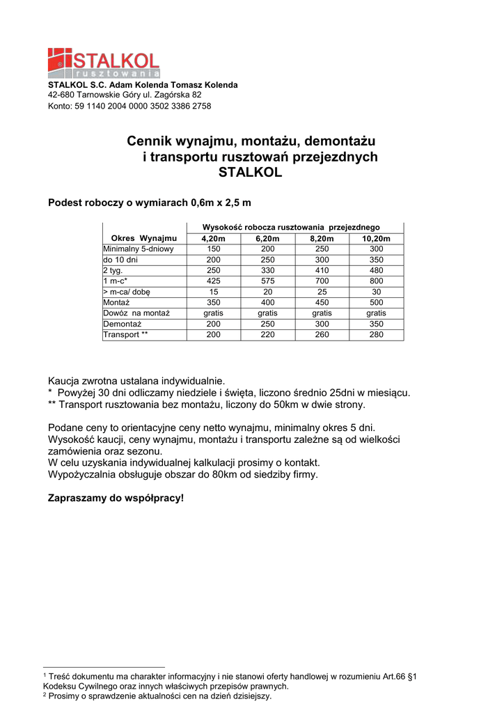 STALKOL S.C. Adam Kolenda Tomasz Kolenda 42-680 Tarnowskie Góry ul. Zagórska 82 Konto: 59 1140 2004 0000 3502 3386 2758 Cennik wynajmu, montażu, demontażu i transportu rusztowań przejezdnych STALKOL12 Podest roboczy o wymiarach 0,6m x 2,5 m Okres Wynajmu Minimalny 5-dniowy do 10 dni 2 tyg. 1 m-c* > m-ca/ dobę Montaż Dowóz na montaż Demontaż Transport ** Wysokość robocza rusztowania przejezdnego 4,20m 6,20m 8,20m 10,20m 150 200 250 300 200 250 300 350 250 330 410 480 425 575 700 800 15 20 25 30 350 400 450 500 gratis gratis gratis gratis 200 250 300 350 200 220 260 280 Kaucja zwrotna ustalana indywidualnie. * Powyżej 30 dni odliczamy niedziele i święta, liczono średnio 25dni w miesiącu. ** Transport rusztowania bez montażu, liczony do 50km w dwie strony. Podane ceny to orientacyjne ceny netto wynajmu, minimalny okres 5 dni. Wysokość kaucji, ceny wynajmu, montażu i transportu zależne są od wielkości zamówienia oraz sezonu. W celu uzyskania indywidualnej kalkulacji prosimy o kontakt. Wypożyczalnia obsługuje obszar do 80km od siedziby firmy. Zapraszamy do współpracy! Treść dokumentu ma charakter informacyjny i nie stanowi oferty handlowej w rozumieniu Art.66 §1 Kodeksu Cywilnego oraz innych właściwych przepisów prawnych. 2 Prosimy o sprawdzenie aktualności cen na dzień dzisiejszy. 1