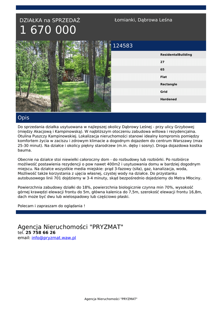 Łomianki, Dąbrowa Leśna DZIAŁKA na SPRZEDAŻ 1 670 000 124583 ResidentalBuilding 27 65 Flat Rectangle Grid Hardened Opis Do sprzedania działka usytuowana w najlepszej okolicy Dąbrowy Leśnej - przy ulicy Grzybowej (między Akacjową i Kampinowską). W najbliższym otoczeniu zabudowa willowa i rezydencjalna. Otulina Puszczy Kampinowskiej. Lokalizacja nieruchomości stanowi idealny kompromis pomiędzy komfortem życia w zaciszu i zdrowym klimacie a dogodnym dojazdem do centrum Warszawy (max 25-30 minut). Na działce i okolicy piękny starodrzew (m.in. dęby i sosny). Droga dojazdowa kostka bauma. Obecnie na działce stoi niewielki całoroczny dom - do rozbudowy lub rozbiórki. Po rozbiórce możliwość postawienia rezydencji o pow nawet 400m2 i usytuowania domu w bardziej dogodnym miejscu. Na działce wszystkie media miejskie: prąd 3-fazowy (siła), gaz, kanalizacja, woda, Możliwość także korzystania z ujęcia własnej, czystej wody na działce. Do przystanku autobusowego linii 701 dojdziemy w 3-4 minuty, skąd bezpośrednio dojedziemy do Metra Młociny. Powierzchnia zabudowy działki do 18%, powierzchnia biologicznie czynna min 70%, wysokość górnej krawędzi elewacji frontu do 5m, główna kalenica do 7,5m, szerokość elewacji frontu 16,8m, dach może być dwu lub wielospadowy lub częściowo płaski. Polecam i zapraszam do oglądania ! Agencja Nieruchomości "PRYZMAT" tel. 25 758 66 26 email: [email protected] Agencja Nieruchomości "PRYZMAT" Powered by TCPDF (www.tcpdf.org)