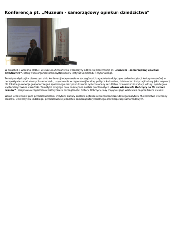 Konferencja pt. „Muzeum - samorządowy opiekun dziedzictwa” W dniach 8-9 września 2016 r. w Muzeum Ziemiaństwa w Dobrzycy odbyła się konferencja pt. „Muzeum - samorządowy opiekun dziedzictwa”, której współorganizatorem był Narodowy Instytut Samorządu Terytorialnego. Tematyka dyskusji w pierwszym dniu konferencji obejmowała w szczególności zagadnienia dotyczące zadań instytucji kultury (muzeów) w perspektywie zadań własnych samorządu, usytuowania w regionalnej/lokalnej polityce kulturalnej, działalności instytucji kultury jako inspiracji dla lokalnego rozwoju gospodarczego i społecznego oraz poszukiwania systemu oceny rezultatów działalności instytucji kultury, opartego o wystandaryzowane wskaźniki. Tematyka drugiego dnia poświęcona została problematyce „Dawni właściciele Dobrzycy na tle swoich czasów” i obejmowała zagadnienia historyczne w szczególności historię Dobrzycy, losy majątku i jego właścicieli na przestrzeni wieków. Wśród uczestników poza przedstawicielami instytucji kultury znaleźli się także reprezentanci Narodowego Instytutu Muzealnictwa i Ochrony Zbiorów, Uniwersytetu Łódzkiego, przedstawiciele jednostek samorządu terytorialnego oraz korporacji samorządowych. Powered by TCPDF (www.tcpdf.org)