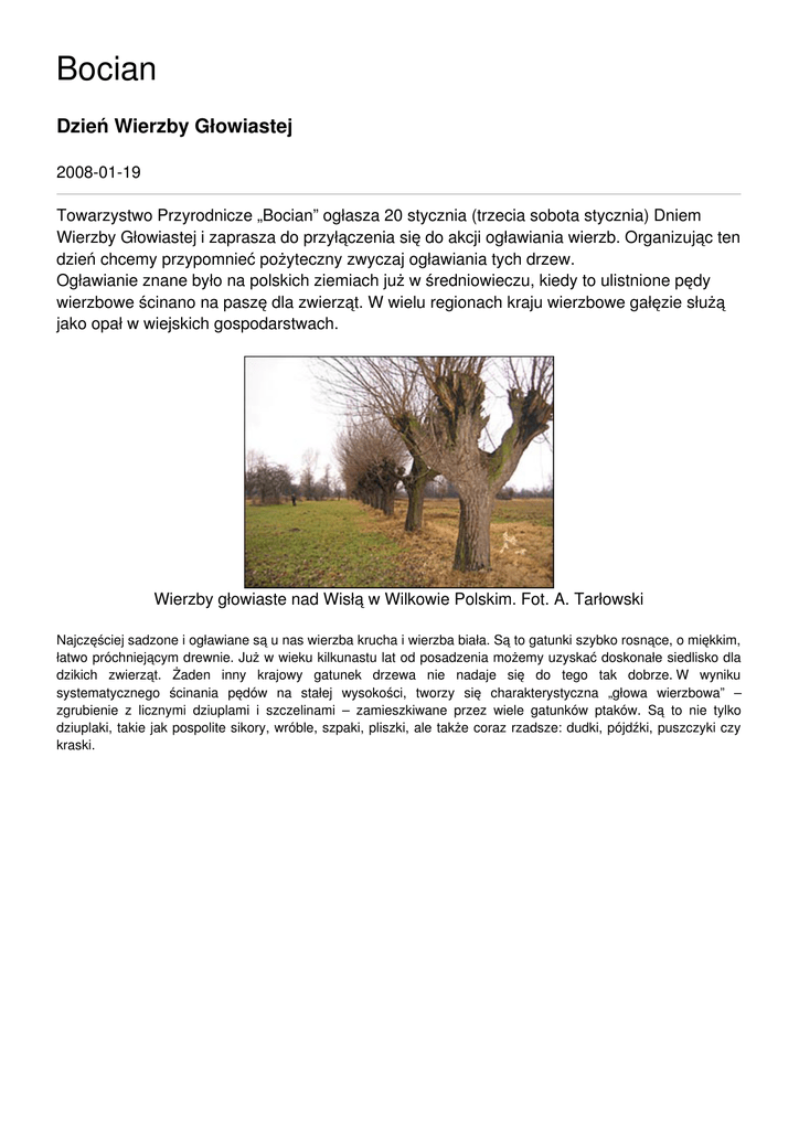 Bocian Dzień Wierzby Głowiastej 2008-01-19 Towarzystwo Przyrodnicze „Bocian” ogłasza 20 stycznia (trzecia sobota stycznia) Dniem Wierzby Głowiastej i zaprasza do przyłączenia się do akcji ogławiania wierzb. Organizując ten dzień chcemy przypomnieć pożyteczny zwyczaj ogławiania tych drzew. Ogławianie znane było na polskich ziemiach już w średniowieczu, kiedy to ulistnione pędy wierzbowe ścinano na paszę dla zwierząt. W wielu regionach kraju wierzbowe gałęzie służą jako opał w wiejskich gospodarstwach. Wierzby głowiaste nad Wisłą w Wilkowie Polskim. Fot. A. Tarłowski Najczęściej sadzone i ogławiane są u nas wierzba krucha i wierzba biała. Są to gatunki szybko rosnące, o miękkim, łatwo próchniejącym drewnie. Już w wieku kilkunastu lat od posadzenia możemy uzyskać doskonałe siedlisko dla dzikich zwierząt. Żaden inny krajowy gatunek drzewa nie nadaje się do tego tak dobrze. W wyniku systematycznego ścinania pędów na stałej wysokości, tworzy się charakterystyczna „głowa wierzbowa” – zgrubienie z licznymi dziuplami i szczelinami – zamieszkiwane przez wiele gatunków ptaków. Są to nie tylko dziuplaki, takie jak pospolite sikory, wróble, szpaki, pliszki, ale także coraz rzadsze: dudki, pójdźki, puszczyki czy kraski. Wypalona wierzba w Górkach Kampinoskich. Fot. A. Tarłowski Gęste wierzbowe pędy i obszerne dziuple dają też schronienie kaczkom krzyżówkom, drozdom, gołębiom grzywaczom, spotkać też można na ogłowionych wierzbach gniazda bocianie. Wierzba jest gatunkiem „smacznym” dla wielu grup zwierząt. Żerują na niej owady przyciągające liczne ptaki. Miękkie drewno ułatwia kucie dziupli nie tylko dzięciołom, ale też np. sikorom czarnogłówkom. Wnętrze wypróchniałych wierzb często zasiedlają coraz rzadsze trzmiele – drugi z najważniejszych po pszczołach gatunek zapylający rośliny. Wierzby dostarczają pożywienia i ukrycia także ssakom. Z ukryć w popękanych pniach korzystają zające, jeże i liczne drobne gryzonie. W próchnie zimują padalce. Na przedwiośniu pyłek z kwiatów wierzbowych jest ważnym pożytkiem pszczelim. Sielski krajobraz z licznymi szpalerami wierzb głowiastych ma też duże znaczenie kulturowe. Kojarzony jest nie tylko z Żelazową Wolą i muzyką Chopina, wielu malarzy uwieczniało go na swoich płótnach. Przez wieki, pod wpływem fantastycznych kształtów wierzbowych głów powstawały liczne legendy i baśnie. Choć ponoć diabeł Rokita wciąż mieszka w wierzbach, mają one swoje miejsce także w wierzeniach religijnych. Dudek karmiący młode w wierzbowej dziupli. Fot. Jerzy Gumowski Już w czasach pogańskich uważano wierzby za drzewa płodności, a współcześnie z pędów z baziami wykonuje się palemki wielkanocne. Nic zatem w tym dziwnego, że wierzba uważana jest za najbardziej „polskie drzewo”, tak jak bocian biały jest najbardziej „polskim ptakiem”. Zarówno wierzba głowiasta jak też i bocian są umieszczone w logo Towarzystwa Przyrodniczego „Bocian”, co tym bardziej motywuje nas do troski o nie. O ile o bociana możemy się na razie nie martwić, to wierzby głowiaste powoli odchodzą do historii. Coraz mniej gospodarzy sadzi „żywokoły” na swoich miedzach, coraz mniej jest miedz… Jako źródło opału, zamiast wierzb głowiastych, promuje się plantacje wierzb energetycznych, zdecydowanie uboższych pod względem przyrodniczym. Wiele wierzb wycięto, aby ułatwić sobie uprawę roli sprzętem mechanicznym, a pozostałe często wypalane są przez wandali. Liczne gatunki ptaków związane z krajobrazem rolniczym i dziuplami gwałtownie zmniejszyły swą liczebność np. pójdźka, dudek. Warto więc zadbać o to, co przyciąga zwierzęta jak i fascynuje ludzi. Jeśli w swojej okolicy znacie takie miejsca, gdzie trzeba już ogławiać wierzby, a nikt od dawna tego nie robi, zachęcamy do porozumienia się z właścicielami gruntów i wspólnego zorganizowania ogławiania wierzb. W marcu i kwietniu proponujemy zorganizowanie sadzenia wierzb. Dnia 20 stycznia 2007 roku wszystkich chętnych zapraszamy na obchody Dnia Wierzby Głowiastej do Górek Kampinoskich na terenie Kampinoskiego Parku Narodowego. Plan dnia: Godz. 9:00 – zbiórka pod kościołem w Górkach Kampinoskich Godz. 9:30-15:00 – ogławianie wierzb w miejscach wcześniej uzgodnionych z mieszkańcami, z przerwą na drugie śniadanie (prowiant we własnym zakresie) Godz. 15:30 – ognisko przy leśniczówce w Górkach Kampinoskich (prowiant we własnym zakresie) Dla chętnych możliwość noclegu w leśniczówce. Prosimy zabrać własne karimaty i śpiwory. Uwaga! Ostatni autobus PKS do Warszawy, odjeżdża o godzinie 18:45 Zgłoszenia: Wszystkich chętnych do wzięcia udziału w akcji prosimy o wcześniejszy kontakt: [email protected] lub telefonicznie 0 606 277 567 (Adam Tarłowski) wraz z informacją czy przyjedziecie samochodem i czy macie wolne miejsca, aby kogoś zabrać. Wszystkich, którzy dołączą się do akcji organizując ogławianie na swoim terenie prosimy o przysłanie krótkich relacji wraz ze zdjęciami. Zostaną one zamieszczone na naszej stronie internetowej, a najciekawsza nagrodzona. "Dzień Wierzby Głowiastej" jest nawiązaniem do "Dnia Wierzby " ustanowionego w latach dziewięćdziesiątych przez dawne Radomsko-Kieleckie Towarzystwo Przyrodnicze (obecnie Towarzystwo Badań i Ochrony Przyrody ) na dzień 21 marca - pierwszy dzień wiosny. Do świętowania "Dnia Wierzby" poprzez sadzenie wierzb przyłączyło się wiele organizacji społecznych, szkół, instytucji i osób prywatnych. Z biegiem lat "Dzień Wierzby" przekształcił się w "Miesiąc Sadzenia Wierzb" od 21 marca do 22 kwietnia. Krótki przepis na wierzbę głowiastą: Żywokoły. Fot. A. Tarłowski Ogławiając wierzby w marcu możemy pozyskać "żywokoły" czyli zdrewniałe pędy wierzbowe, długości 2-3 m, średnicy 6-10 cm, które po ukorzenieniu w wodzie, wsadza się w 