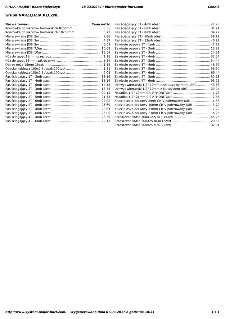 F.H.U. "MAJER" Beata Majerczyk 18 3310072 / [email protected] Cennik Grupa NARZĘDZIA RĘCZNE Nazwa towaru .............................................................. Cena netto Końcówka do wkrętów farmerskich 8x50mm .............................. 5,35 Końcówka do wkrętów farmerskich 10x50mm ............................ 5,73 Miara zwijana JOBI 2m ................................................................. 3,86 Miara zwijana JOBI 3m ................................................................. 4,57 Miara zwijana JOBI 5m ................................................................. 6,01 Miara zwijana JOBI 7,5m ............................................................ 10,68 Miara zwijana JOBI 10m ............................................................. 13,59 Nóż do tapet 18mm przeźrocz. ................................................... 1,18 Nóż do tapet 18mm- zakręcany+ ............................................... 3,34 Ostrze noża 18mm 10szt. ........................................................... 1,18 Opaska kablowa 100x2,5 /opak.100szt/ ...................................... 1,51 Opaska kablowa 150x2,5 /opak.100szt/ ...................................... 2,03 Pas ściągający 1T - 3mb atest ................................................... 13,19 Pas ściągający 1T - 4mb atest ................................................... 13,19 Pas ściągający 1T - 6mb atest ................................................... 14,58 Pas ściągający 2T - 3mb atest ................................................... 18,75 Pas ściągający 2T - 4mb atest ................................................... 20,14 Pas ściągający 2T - 5mb atest ................................................... 21,53 Pas ściągający 2T - 6mb atest ................................................... 22,92 Pas ściągający 2T - 8mb atest ................................................... 25,69 Pas ściągający 3T - 4mb atest ................................................... 23,61 Pas ściągający 3T - 6mb atest ................................................... 25,00 Pas ściągający 4T - 4mb atest ................................................... 26,39 Pas ściągający 4T - 6mb atest ................................................... 29,17 http://www.system.majer-hurt.com/ Pas ściągający 5T - 4mb atest ................................................... 27,78 Pas ściągający 5T - 6mb atest ................................................... 31,94 Pas ściągający 5T - 8mb atest ................................................... 34,72 Pas ściągający 5T - 10mb atest ................................................. 38,19 Pas ściągający 5T - 12mb atest ................................................. 40,97 Zawiesie pasowe 1T - 1mb .......................................................... 7,22 Zawiesie pasowe 1T - 3mb ........................................................ 13,89 Zawiesie pasowe 2T - 3mb ........................................................ 24,31 Zawiesie pasowe 2T - 4mb ........................................................ 32,64 Zawiesie pasowe 3T - 3mb ........................................................ 34,44 Zawiesie pasowe 3T - 4mb ........................................................ 46,67 Zawiesie pasowe 3T - 5mb ........................................................ 56,94 Zawiesie pasowe 3T - 6mb ........................................................ 69,44 Zawiesie pasowe 4T - 3mb ........................................................ 52,78 Zawiesie pasowe 4T - 6mb ........................................................ 93,75 Uchwyt wiertarski 1/2" 10mm bezkluczowy metal ARC ............ 43,66 Uchwyt wiertarski 1/2" 10mm z kluczykiem ARC ...................... 23,94 Nasadka 1/2" 10mm CR-V "HONITON" ........................................ 1,78 Nasadka 1/2" 21mm CR-V "HONITON" ........................................ 2,86 Klucz płasko-oczkowy 8mm CR-V polerowany JOBI ..................... 1,38 Klucz płasko-oczkowy 10mm CR-V polerowany JOBI ................... 1,72 Klucz płasko-oczkowy 13mm CR-V polerowany JOBI ................... 2,22 Klucz płasko-oczkowy 23mm CR-V polerowany JOBI ................... 6,25 Brzeszczot RAMa 300X12,5 m (144szt) ..................................... 45,26 Brzeszczot RAMb 300X25 m-m (72szt) ..................................... 29,83 Brzeszczot RAMd 300x25 d-m (72szt) 32,91 Wygenerowano dnia 07.03.2017 o godzinie 18:31 1z1