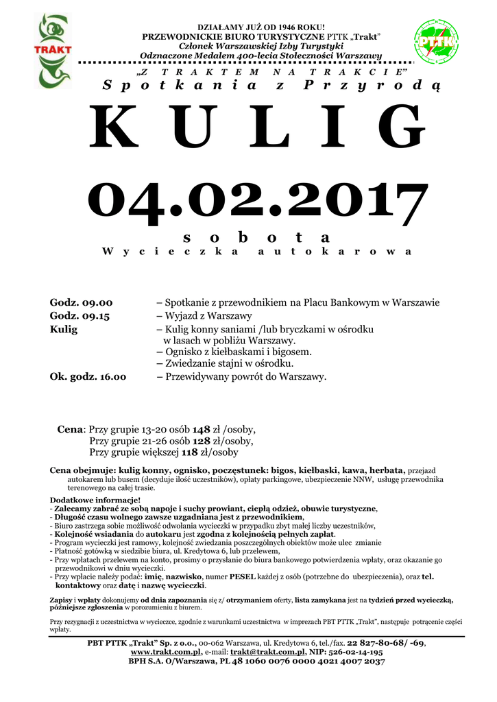 DZIAŁAMY JUŻ OD 1946 ROKU! PRZEWODNICKIE BIURO TURYSTYCZNE PTTK „Trakt” Członek Warszawskiej Izby Turystyki Odznaczone Medalem 400-lecia Stołeczności Warszawy „Z T R A K T E M S p o t k a n i a N A T z R A K C I E’’ P r z y r o d ą K U L I G 04.02.2017 s W y Godz. 09.00 Godz. 09.15 Kulig Ok. godz. 16.00 c i e c o z k b a o a u t t a o k a r o w a – Spotkanie z przewodnikiem na Placu Bankowym w Warszawie – Wyjazd z Warszawy – Kulig konny saniami /lub bryczkami w ośrodku w lasach w pobliżu Warszawy. – Ognisko z kiełbaskami i bigosem. – Zwiedzanie stajni w ośrodku. – Przewidywany powrót do Warszawy. Cena: Przy grupie 13-20 osób 148 zł /osoby, Przy grupie 21-26 osób 128 zł/osoby, Przy grupie większej 118 zł/osoby Cena obejmuje: kulig konny, ognisko, poczęstunek: bigos, kiełbaski, kawa, herbata, przejazd autokarem lub busem (decyduje ilość uczestników), opłaty parkingowe, ubezpieczenie NNW, usługę przewodnika terenowego na całej trasie. Dodatkowe informacje! - Zalecamy zabrać ze sobą napoje i suchy prowiant, ciepłą odzież, obuwie turystyczne, - Długość czasu wolnego zawsze uzgadniana jest z przewodnikiem, - Biuro zastrzega sobie możliwość odwołania wycieczki w przypadku zbyt małej liczby uczestników, - Kolejność wsiadania do autokaru jest zgodna z kolejnością pełnych zapłat. - Program wycieczki jest ramowy, kolejność zwiedzania poszczególnych obiektów może ulec zmianie - Płatność gotówką w siedzibie biura, ul. Kredytowa 6, lub przelewem, - Przy wpłatach przelewem na konto, prosimy o przysłanie do biura bankowego potwierdzenia wpłaty, oraz okazanie go przewodnikowi w dniu wycieczki. - Przy wpłacie należy podać: imię, nazwisko, numer PESEL każdej z osób (potrzebne do ubezpieczenia), oraz tel. kontaktowy oraz datę i nazwę wycieczki. Zapisy i wpłaty dokonujemy od dnia zapoznania się z/ otrzymaniem oferty, lista zamykana jest na tydzień przed wycieczką, późniejsze zgłoszenia w porozumieniu z biurem. Przy rezygnacji z uczestnictwa w wycieczce, zgodnie z warunkami uczestnictwa w imprezach PBT PTTK „Trakt”, następuje potrącenie części wpłaty. PBT PTTK „Trakt” Sp. z o.o., 00-062 Warszawa, ul. Kredytowa 6, tel./fax. 22 827-80-68/ -69, www.trakt.com.pl, e-mail: [email protected], NIP: 526-02-14-195 BPH S.A. O/Warszawa, PL 48 1060 0076 0000 4021 4007 2037