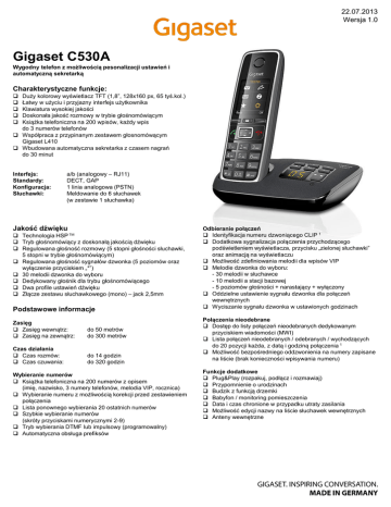 22.07.2013 Wersja 1.0 Gigaset C530A Wygodny telefon z możliwością pesonalizacji ustawień i automatyczną sekretarką Charakterystyczne funkcje: Duży kolorowy wyświetlacz TFT (1,8”, 128x160 px, 65 tyś.kol.) Łatwy w użyciu i przyjazny interfejs użytkownika Klawiatura wysokiej jakości Doskonała jakość rozmowy w trybie głośnomówiącym Książka telefoniczna na 200 wpisów, każdy wpis do 3 numerów telefonów Współpraca z przypinanym zestawem głosnomówącym Gigaset L410 Wbudowana automatyczna sekretarka z czasem nagrań do 30 minut Interfejs: Standardy: Konfiguracja: Słuchawki: a/b (analogowy – RJ11) DECT, GAP 1 linia analogowa (PSTN) Meldowanie do 6 słuchawek (w zestawie 1 słuchawka) Jakość dźwięku Technologia HSP TM Tryb głośnomówiący z doskonałą jakością dźwięku Regulowana głośność rozmowy (5 stopni głośności słuchawki, 5 stopni w trybie głośnomówiącym) Regulowana głośność sygnałów dzwonka (5 poziomów oraz wyłączenie przyciskiem „*”) 30 melodii dzwonka do wyboru Dedykowany głośnik dla trybu głośnomówiącego Dwa profile ustawień dźwięku Złącze zestawu słuchawkowego (mono) – jack 2,5mm Podstawowe informacje Zasięg Zasięg wewnątrz: Zasięg na zewnątrz: do 50 metrów do 300 metrów Czas działania Czas rozmów: Czas czuwania: do 14 godzin do 320 godzin Wybieranie numerów Książka telefoniczna na 200 numerów z opisem (imię, nazwisko, 3 numery telefonów, melodia VIP, rocznica) Wybieranie numeru z możliwością korekcji przed zestawieniem połączenia Lista ponownego wybierania 20 ostatnich numerów Szybkie wybieranie numerów (skróty przyciskami numerycznymi 2-9) Tryb wybierania DTMF lub impulsowy (programowalny) Automatyczna obsługa prefiksów Odbieranie połączeń Identyfikacja numeru dzwoniącego CLIP 1 Dodatkowa sygnalizacja połączenia przychodzącego podświetleniem wyświetlacza, przycisku „zielonej słuchawki” oraz animacją na wyświetlaczu Możliwość zdefiniowania melodii dla wpisów VIP Melodie dzwonka do wyboru: - 30 melodii w słuchawce - 10 melodii a stacji bazowej - 5 poziomów głośności + narastający + wyłączony Oddzielne ustawienie sygnału dzwonka dla połączeń wewnętrznych Wyciszanie sygnału dzwonka w ustawionych godzinach Połączenia nieodebrane Dostęp do listy połączeń nieodebranych dedykowanym przyciskiem wiadomości (MWI) Lista połączeń nieodebranych / odebranych / wychodzących do 20 pozycji każda, z datą i godziną połączenia 1 Możliwość bezpośredniego oddzwonienia na numery zapisane na liście (brak konieczności wpisywania numeru) Funkcje dodatkowe Plug&Play (rozpakuj, podłącz i rozmawiaj) Przypomnienie o urodzinach Budzik z funkcją drzemki Babyfon / monitoring pomieszczenia Data i czas chronione w przypadku utraty zasilania Możliwość edycji nazwy na liście słuchawek wewnętrznych Anteny wewnętrzne 22.07.2013 Wersja 1.0 Wyświetlacz i menu Wyświetlacz Podświetlany kolorowy wyświetlacz graficzny TFT (1,8”, 128x160pikseli, 65 tyś. kolorów) 2 układy kolorów wyświetlacza W trybie czuwania Wyświetlanie daty i godziny jako wygaszacza ekranu W trybie bezczynności Wyświetlanie: - daty i godziny - stanu naładowania akumulatorów - wewnętrznej nazwy słuchawki - siły sygnału i trybu Eco Dodatkowo (jeśli są): - liczbie nowych nieodebranych połączeń - liczbie nowych nagrań na sekretarce - liczbie nowych opuszczonych alarmów / rocznic W trakcie rozmowy Wyświetlanie czasu trwania rozmowy Menu Wygodne w użyciu menu w 25 językach (niemiecki, angielski, francuski, włoski, hiszpański, portugalski, holenderski, duński, norweski, szwedzki, fiński, czeski, słowacki, polski, turecki, grecki, węgierski, rosyjski, chorwacki, słoweński, rumuński, serbski, kataloński, bułgarski, ukraiński) Menu oparte o ikony i teksty oraz przyciski funkcyjne wyświetlacza Klawiatura Ergonomiczna klawiatura z materiałów wysokiej jakości (technologia metaldome) 12 przycisków numerycznych oraz 2 przyciski bezpośredniego dostępu do funkcji zarządzania połączeniami i monitoringu pomieszczenia Pięciokierunkowy przycisk nawigacyjny Podświetlana klawiatura (kolor bursztynowy) Podświetlane przycisk wiadomości (MWI) Blokada klawiatury (długie naciśnięcie „#”) Wyłączenie dzwonka (długie naciśnięcie „*”) Funkcja Flash (R) – (długie naciśnięcie „0”) ECO-DECT Do 60% niższe zużycie energii2 (energooszczędny zasilacz impulsowy na wyposażeniu) Redukcja mocy nadawania prawie do zera po odstawieniu słuchawki do stacji bazowej (tylko przy 1 zalogowanej słuchawce) Tryb ECO – manualna redukcja mocy nadawania o 80% 3 Tryb ECO Plus – redukcja do 100% mocy nadawania dla wszystkich zalogowanych słuchawek4 Płynna redukcja mocy nadawania w zależności od odległości między stacją bazową a słuchawką Współpracujące akcesoria Gigaset Repeater Przypinany zestaw głośnomówiący Gigaset L410 Słuchawka mono ze złączem jack 2,5 mm Maksymalnie 6 słuchawek zalogowanych w stacji bazowej Funkcje systemu z więcej niż 1 słuchawką Darmowe rozmowy wewnętrzne między słuchawkami 2 rozmowy jednocześnie (1 zewnętrzna, 1 wewnętrzna) Transfer książki telefonicznej między słuchawkami Połączenia wewnętrzne do wszystkich lub do wybranej słuchawki Przekazywanie połączeń zewnętrznych do innych słuchawek z uprzednią konsultacją Konferencja trójstronna (1 rozm. zewn. + 2 rozm. wewn.) Połączenia zewnętrzne sygnalizowane we wszystkich słuchawkach Automatyczna sekretarka Zintegrowana automatyczna sekretarka z łącznym czasem nagrań do 30 minut Podwójny siedmiosegmentowy wyświetlacz informujący o liczbie nagrań na automatycznej sekretarce Łatwa obsługa z poziomu słuchawki i stacji bazowej Predefiniowane komunikaty w języku polskim: - 1 zapowiedź - 1 wskazówka - możliwość nagrania własnych przez użytkownika (maks. 170 sekund) Automatyczne przełączanie pomiędzy trybem zapowiedzi, a tryb