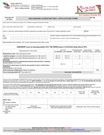 SWIFT: PKOPPLPW Nr konta: PL 03 1240 2470 1111 0010 3424 2280 SWIFT: WBKPPLPP Nr konta: PL 80 1090 2688 0000 0001 0728 2338 26-27 listopada / November 2016 Formularz A1 A1 Form Nr / No ZGŁOSZENIE UCZESTNICTWA / APPLICATION FORM Pełna nazwa firmy Wystawcy (do faktury VAT) / Exibitor’s company full name (for invoice): Ulica i numer domu/ Street and number: Kod pocztowy / Postal code: Miasto / City: Kraj / Country: Nazwa i nr dokumentu potwierdzającego działalność gospodarczą (wymagana kopia w/w dokumentu) / Company registration number: REGON: NIP: Tax ID number: Wyrażam zgodę na przesłanie faktury VAT w formie elektronicznej na podany poniżej adres e-mail We agree to send e-invoice to the e-mail address below ………………………………………………………………………………….. Osoba kontaktowa (imię i nazwisko, nr tel., e-mail) / Contact person (name, phone, e-mail): ZAMAWIAMY (ceny nie zawierają podatku VAT) / WE ORDER (prices in PLN [Polish Zloty] without VAT): Cena / Price Powierzchnia [m2] Wymiar stoiska do/till 30.09.2016 po/after 30.09.2016 Square [sqm] Dimension of space Rodzaj powierzchni / Kind of stand: Wartość Value [PLN] Niezabudowana, kryta / Indoor stand without a booth: - położenie szeregowe / row location (Minimalna powierzchnia 4 m2 / Min. size 4 m2) m2 m2) - położenie narożne / corner location (Minimalna powierzchnia 4 / Min. size 4 ZABUDOWA Do zamawianej powierzchni niezabudowanej zamawiamy taką samą ilość m2 zabudowy 50 zł / m2 65 zł / m2 ………… m2 …….. x ……. m2 m2 ………… m2 …….. x ……. 60 zł / Zabudowa obejmuje: ściany zewnętrzne. 75 zł / 35 zł / m2 Along with the ordered space we order the same quantity (in sqm) of stardard indoor development ………… m2 Indoor development: includes wall panels 100 Opłata rejestracyjna (obligatoryjna) / Register fee (obligatory) Ceny nie zawierają podatku VAT / Prices without VAT Suma netto / Total netto [PLN] Podpisując niniejsze ZGŁOSZENIE UCZESTNICTWA akceptujemy regulamin targów, warunki uczestnictwa i postanowienia szczegółowe. Do ZGŁOSZENIA UCZESTNICTWA dołączamy kopię przelewu*, dowodu wpłaty* pierwszej raty w wysokości 50% na konto Targów Lublin S.A. SWIFT: PKOPPLPW, nr konta PL 03 1240 2470 1111 0010 3424 2280 lub SWIFT: WBK PPLPP, nr konta PL 80 1090 2688 0000 0001 0728 2338 Zobowiązujemy się do uzupełnienia pozostałej należności najpóźniej na 7 dni przed rozpoczęciem targów. By signing this APPLICATION FORM we accept the Fair’s Regulations. To the Application Form we enclose the copy of transfer*, voucher*, of the first instalment in the amount of 50% on account of: Targi Lublin S.A. in a bank PeKaO SA: SWIFT: PKOPPLPW, account no. PL 03 1240 2470 1111 0010 3424 2280. We are obliged to pay the rest of the sum up to 7 days before the begining of the fair. Important! All bank transfer expenses are compensate by Exhibitor. Organizer does not bear costs connected with bank transfer. Payments are made in PLN according to PekAo S.A. rate. PeKaO S.A rate at site: www.pekao.com.pl/exchange (f/xcurrencies table>buy). The table contains exchange rates of foreign currencies expressed in Polish currency which are applied on a given business day. Suma z formularzy (netto) Total prices from forms (netto) A1 A3 WD UD UR RK UT Razem netto Total netto Razem brutto Total brutto (+23% VAT) Płatnik / Payer Wystawca / Exhibitor Inna firma (patrz formularz A2 / Other company (see A2 form) Uwagi koordynatora targów: Pieczęć firmy Exhibitor’s Company stamp Pieczątka imienna i podpis prawnie wiążący Name seal and legally binding signature Miejscowość i data / Place and date of signing Zgłoszenia prosimy nadsyłać do dnia / Application deadline 10.11.2016 r. ul. Dworcowa 11 (Park Ludowy), 20-406 Lublin, tel. +48 81 458 15 35, , fax +48 81 458 15 02, e-mail: [email protected] Zgodnie z ustawą z dnia 18.07.2002 r. (Dz.U. nr 144 poz.1204) o świadczeniu usług drogą elektroniczną, wyrażam zgodę na otrzymywanie informacji marketingowych od firmy Targi Lublin S.A. drogą elektroniczną na ww adres e-mail./ I hereby declare my consent to receive marketing information from Lublin Fair JSC on a/m e-mail address (according to Act on Electronic Service Providing of 18 th July 2002 published in Journal of Laws no 144 item 1204) SWIFT: PKOPPLPW Nr konta: PL 03 1240 2470 1111 0010 3424 2280 SWIFT: WBKPPLPP Nr konta: PL 80 1090 2688 0000 0001 0728 2338 26-27 listopada / November 2016 Formularz WD WD Form Nr / No WYPOSAŻENIE DODATKOWE / ADDITIONAL EQUIPMENT ZAMAWIAMY NASTĘPUJĄCE WYPOSAŻENIE DODATKOWE (ceny bez VAT) WE ORDER FOLLOWING ADDITIONAL EQUIPMENT (prices without VAT) Sym- Element wyposażenia / Element of equipment Cena [zł] Ilość bol wym.: szer. x gł. x wys. / wide x deep x height Price Quantity lada informacyjna z półką L1 85 exhibition desk (100x50x90) lada ekspozycyjna z blatem szklanym L2 120 exhibition desk with glass desktop (100x50x90) lada informacyjna półokrągła (100x100x90) L3 120 semicircular exhibition desk lada informacyjna półokrągła z blatem szklanym L4 (100x100x90) semicircular exhibition desk with 200 glass desktop lada informacyjna półokrągła z fryzem FPL3 półokrągłym (100x100x90) semicircular exhibition 155 desk with semicircular display pannel lada informacyjna półokrągła z blatem szklanym z fryzem półokrągłym (100x100x90) semicircular FPL4 235 exhibition desk with glass desktop with semicircular display pannel podest (100x50x40) P1 75 exhibition buttress podest (100x50x65) P2 75 exhibition buttress podest (100x50x90) P3 75 exhibition buttress podest (100x100x40) P4 75 exhibition buttress podest (100x100x65) P5 75 exhibition buttress podest (100x100x90) P6 75 exhibition buttress witryna szklana na podeście (100x50x250) W1 210 glass gallery on exhibition buttress (100x50x250) witryna szklana na podeście (100x100x250) W2 230 glass gallery on exhibition buttress (100x1