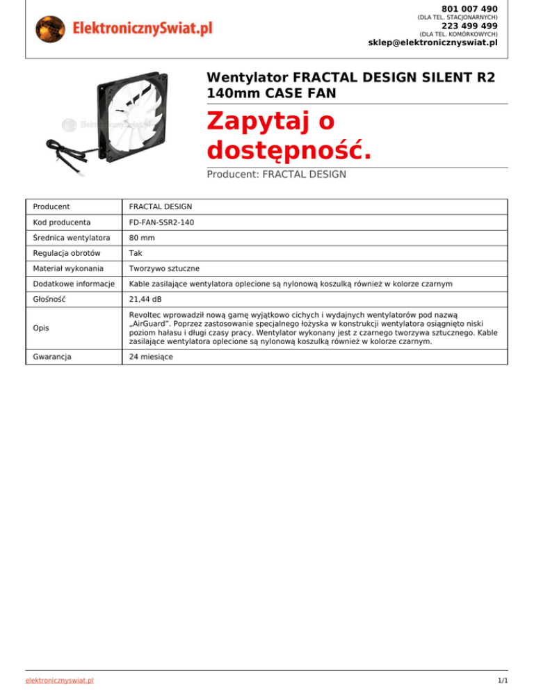 801 007 490 (DLA TEL. STACJONARNYCH) 223 499 499 (DLA TEL. KOMÓRKOWYCH) [email protected] Wentylator FRACTAL DESIGN SILENT R2 140mm CASE FAN Zapytaj o dostępność. Producent: FRACTAL DESIGN Producent FRACTAL DESIGN Kod producenta FD-FAN-SSR2-140 Średnica wentylatora 80 mm Regulacja obrotów Tak Materiał wykonania Tworzywo sztuczne Dodatkowe informacje Kable zasilające wentylatora oplecione są nylonową koszulką również w kolorze czarnym Głośność 21,44 dB Opis Revoltec wprowadził nową gamę wyjątkowo cichych i wydajnych wentylatorów pod nazwą „AirGuard”. Poprzez zastosowanie specjalnego łożyska w konstrukcji wentylatora osiągnięto niski poziom hałasu i długi czasy pracy. Wentylator wykonany jest z czarnego tworzywa sztucznego. Kable zasilające wentylatora oplecione są nylonową koszulką również w kolorze czarnym. Gwarancja 24 miesiące elektronicznyswiat.pl 1/1