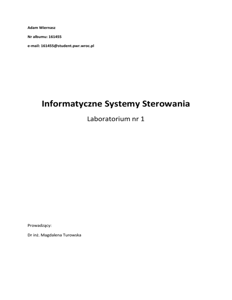 Adam Wiernasz Nr albumu: 161455 e-mail: [email protected] Informatyczne Systemy Sterowania Laboratorium nr 1 Prowadzący: Dr inż. Magdalena Turowska I. Wykaz modeli matematycznych członów dynamicznych W poniższej pracy analizie poddane zostaną następujące człony dynamiczne: Człon całkujący Człon inercyjny I rzędu Człon oscylacyjny Tabela 1 przedstawia postacie równao różniczkowych oraz transmitancji dla rozpatrywanych członów dynamicznych: Człon całkujący Równanie różniczkowe Transmitancja inercyjny I rzędu oscylacyjny Tabela 1. Wykaz postaci równao różniczkowych oraz transmitancji dla członów: całkującego, inercyjnego I rzędu oraz oscylacyjnego II. Opis członów dynamicznych w przestrzeni stanu 1. Człon całkujący Zakładając następującą postad wektora stanu: można zapisad: Korzystając z postaci równania różniczkowego w Tabeli 1 po przekształceniach otrzymujemy opis przestrzeni stanu: Z opisu tego można już bezpośrednio wyliczyd macierze, które mają postad: A=0 B=k C=1 D=0 Do wyznaczenia postaci obiektu za pomocą równania stanu, należy skorzystad z wbudowanej funkcji MatLaba tf2ss. Następuje wyznaczenie opisu z przestrzeni stanu za pomocą transmitancji operatorowej. Składnia funkcji tf2ss: Tf2ss(n, d) n – wektor współczynników znajdujących się przy s. d – zbiór współczynników znajdujących się w mianowniku. W symulacji przyjmiemy parametry: n=3 d = [1, 0] Transmitancja ma wtedy postad: Za pomocą funkcji tf2ss przejdziemy do postaci równania stanu uzyskując wartości macierzy A, B, C oraz D: tf2ss(3, [1 0]) A= 0 B=1 C=2 D=0 Należy zauważyd, iż funkcja dokonała zamiany wartości dla macierzy B i C. Nie jest to działaniem błędnym, ponieważ stosując operację odwrotną ss2tf otrzymamy poprawną postad transmitancji operatorowej. Zarówno postad analityczna jak i uzyskana w matlabie jest więc właściwa. 2. Człon inercyjny I rzędu Zakładając następującą postad wektora stanu: Podstawiając do równania różniczkowego otrzymujemy: Zatem wektor stanu ma postad: W tym przypadku macierze mają postad: A=B= można zapisad: C=1 D=0 Dobieramy przykładowe współczynniki transmitancji: n=2 d = [1 1] Otrzymujemy postad transmitancji: Funkcja tf2ss w MatLabie oblicza nam postad macierzy: A = -1 B=1 C=2 D=0 Macierze B i C są zamienione. 3. Człon oscylacyjny Przyjmując wektor stanu: można zapisad: Podstawiając do równania różniczkowego: Otrzymujemy zatem następującą postad wektora stanu: Stąd otrzymujemy macierze: A= B= C= D=0 Przyjmujemy następujące wartości parametrów: Otrzymujemy następujące wartości elementów macierzy: A= C= B= D=0 III. Charakterystyki czasowe 1. Człon całkujący W przypadku numerycznej analizy członu całkującego przyjmujemy wartośd wzmocnienia k = 3. Postad transmitancji operatorowej jest więc następująca: Poniżej przedstawiono wykresy charakterystyki skokowej oraz impulsowej Wykres 1: Charakterystyka skokowa członu całkującego Wykres 2: Charakterystyka impulsowa członu całkującego 2. Człon inercyjny I rzędu Przyjęto następujące wartości parametrów transmitancji: k=2 T=1 Transmitancja ma zatem postad: Poniżej przedstawiono wykresy charakterystyki skokowej oraz impulsowej: Wykres 3: Charakterystyka skokowa członu inercyjnego Wykres 4: Charakterystyka impulsowa członu inercyjnego 3. Człon oscylacyjny Przyjęto następujące wartości parametrów transmitancji: Transmitancja przyjmuje zatem postad: Poniżej przedstawiono wykresy charakterystyki skokowej oraz impulsowej: Wykres 5: Charakterystyka skokowa członu oscylacyjnego Wykres 6: Charakterystyka impulsowa członu oscylacyjnego IV. Wyznaczenie parametrów charakterystyk członów dynamicznych 1. Człon całkujący Aby w sposób analityczny wyznaczyd z wykresu wartośd parametru k, należy posłużyd się następującą własnością: Stąd biorąc pod uwagę osie układu współrzędnych dla wykresu charakterystyki skokowej: W geometrycznej interpretacji jest to więc tangens kąta nachylenia prostej do osi x w dowolnym punkcie [t, y(t)]. Stąd przykładowo w chwili t = 1, y(t) = 3 więc: Wyliczona wartośd jest zgodna z wykresem otrzymanym w punkcie III. 2. Człon inercyjny I rzędu W przypadku członu inercyjnego interesuje nas analityczne wyliczenie parametrów k oraz T. Parametr k otrzymujemy nakreślając styczną poziomą do wartości do której dąży wykres. Jak wynika z wykresu jest to 2. Parametr T otrzymujemy poprzez przecięcie prostej stycznej do wykresu poprowadzonej z punktu *0, 0+ ze styczną wyznaczającą k. Jak wynika z wykresu jest to wartośd2. 3. Człon oscylacyjny Dla członu oscylacyjnego wyznaczamy parametr k poprzez zaobserwowanie wartości do której dąży wartośd y(t) dla charakterystyki skokowej.