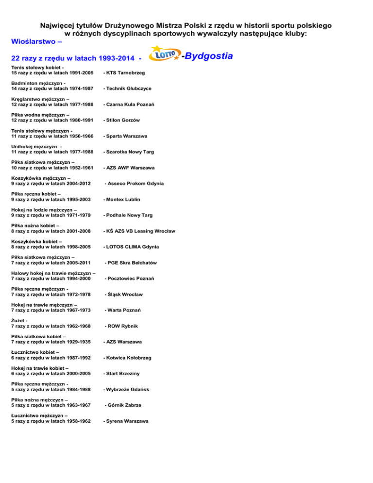 Najwięcej tytułów Drużynowego Mistrza Polski z rzędu w historii sportu polskiego w różnych dyscyplinach sportowych wywalczyły następujące kluby: Wioślarstwo – 22 razy z rzędu w latach 1993-2014 Tenis stołowy kobiet 15 razy z rzędu w latach 1991-2005 - KTS Tarnobrzeg Badminton mężczyzn 14 razy z rzędu w latach 1974-1987 - Technik Głubczyce Kręglarstwo mężczyzn – 12 razy z rzędu w latach 1977-1988 - Czarna Kula Poznań Piłka wodna mężczyzn – 12 razy z rzędu w latach 1980-1991 - Stilon Gorzów Tenis stołowy mężczyzn 11 razy z rzędu w latach 1956-1966 - Sparta Warszawa Unihokej mężczyzn 11 razy z rzędu w latach 1977-1988 - Szarotka Nowy Targ Piłka siatkowa mężczyzn – 10 razy z rzędu w latach 1952-1961 - AZS AWF Warszawa Koszykówka mężczyzn – 9 razy z rzędu w latach 2004-2012 - Asseco Prokom Gdynia Piłka ręczna kobiet – 9 razy z rzędu w latach 1995-2003 - Montex Lublin Hokej na lodzie mężczyzn – 9 razy z rzędu w latach 1971-1979 - Podhale Nowy Targ Piłka nożna kobiet – 8 razy z rzędu w latach 2001-2008 - KŚ AZS VB Leasing Wrocław Koszykówka kobiet – 8 razy z rzędu w latach 1998-2005 - LOTOS CLIMA Gdynia Piłka siatkowa mężczyzn – 7 razy z rzędu w latach 2005-2011 - PGE Skra Bełchatów Halowy hokej na trawie mężczyzn – 7 razy z rzędu w latach 1994-2000 - Pocztowiec Poznań Piłka ręczna mężczyzn 7 razy z rzędu w latach 1972-1978 - Śląsk Wrocław Hokej na trawie mężczyzn – 7 razy z rzędu w latach 1967-1973 - Warta Poznań Żużel 7 razy z rzędu w latach 1962-1968 - ROW Rybnik Piłka siatkowa kobiet – 7 razy z rzędu w latach 1929-1935 - AZS Warszawa Łucznictwo kobiet – 6 razy z rzędu w latach 1987-1992 - Kotwica Kołobrzeg Hokej na trawie kobiet – 6 razy z rzędu w latach 2000-2005 - Start Brzeziny Piłka ręczna mężczyzn 5 razy z rzędu w latach 1984-1988 - Wybrzeże Gdańsk Piłka nożna mężczyzn – 5 razy z rzędu w latach 1963-1967 - Górnik Zabrze Łucznictwo mężczyzn – 5 razy z rzędu w latach 1958-1962 - Syrena Warszawa -Bydgostia